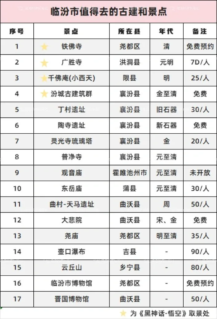 除了汾城古建筑群,临汾还有其他值得一游的景点,如近期爆红的小西天和广胜寺等。由于临汾的景点较为分散,且公共交通不太便利,建议游客选择包车或租车出行。