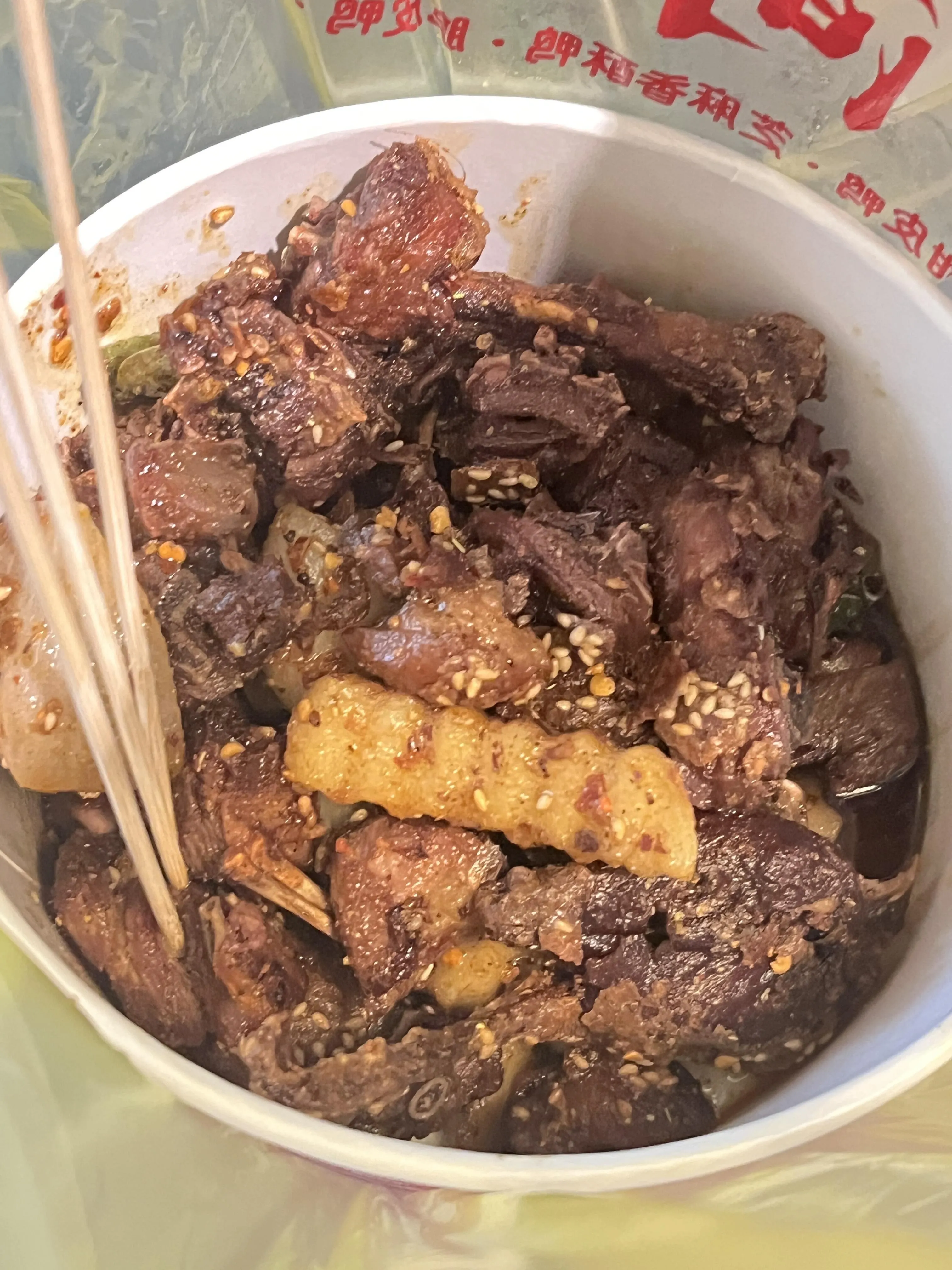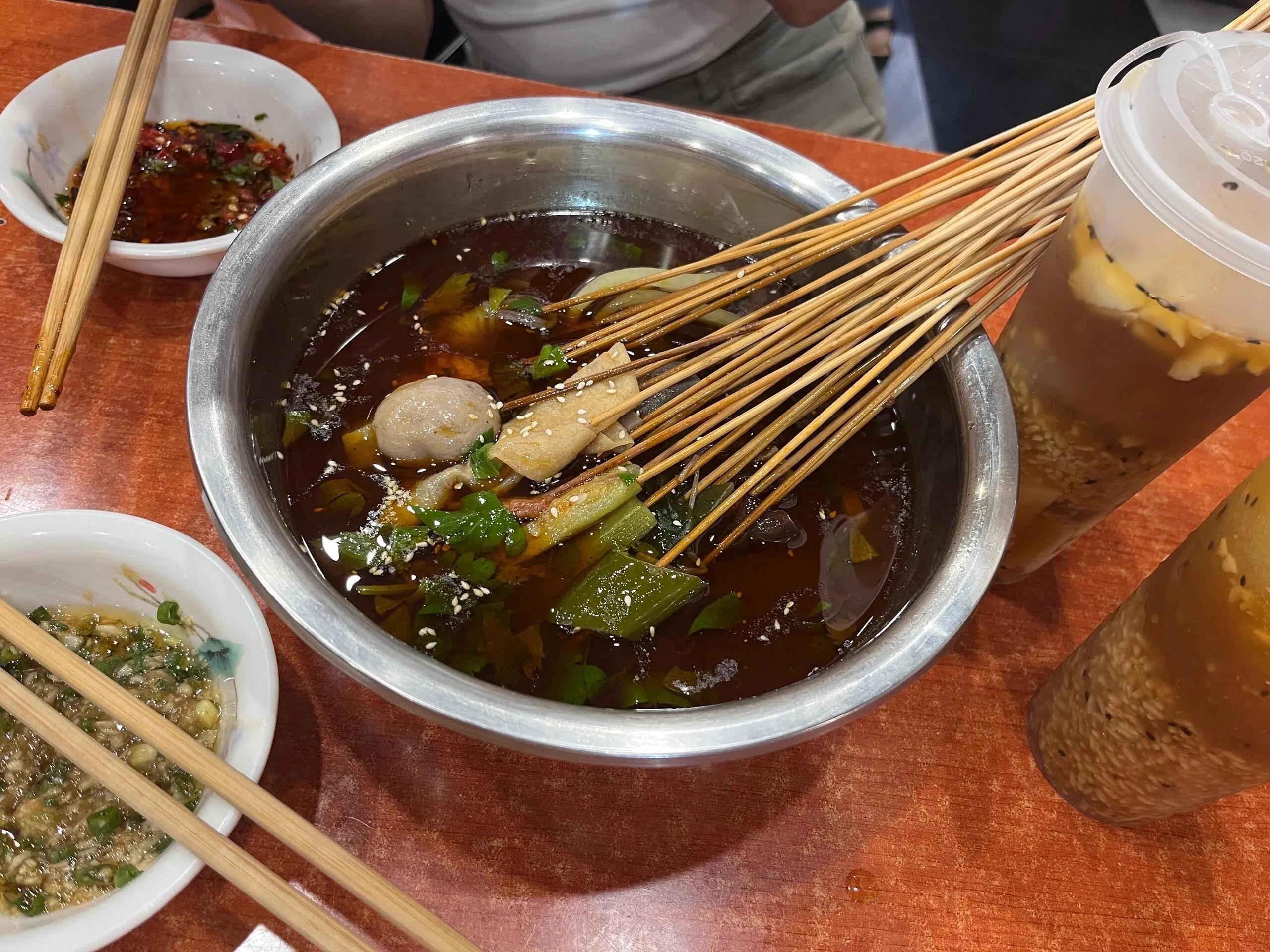 歪串串 :一大盆串串只要38元,价格让人惊喜。成都的串串相比重庆更偏香辣,很符合我们长沙人的口味。走在路上经常能闻到串串店和火锅店的香气,纯香不呛人。