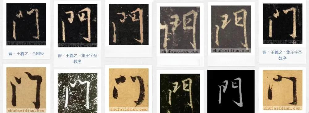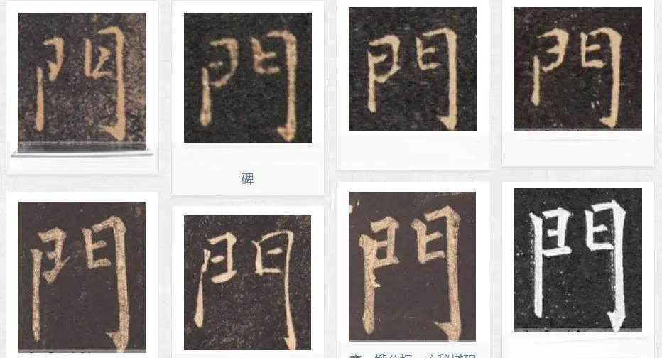 我们先来看一下古代繁体楷书中的“门”字写法,可以注意到在右下角都有一个钩,几乎没有不带钩的书写方式: