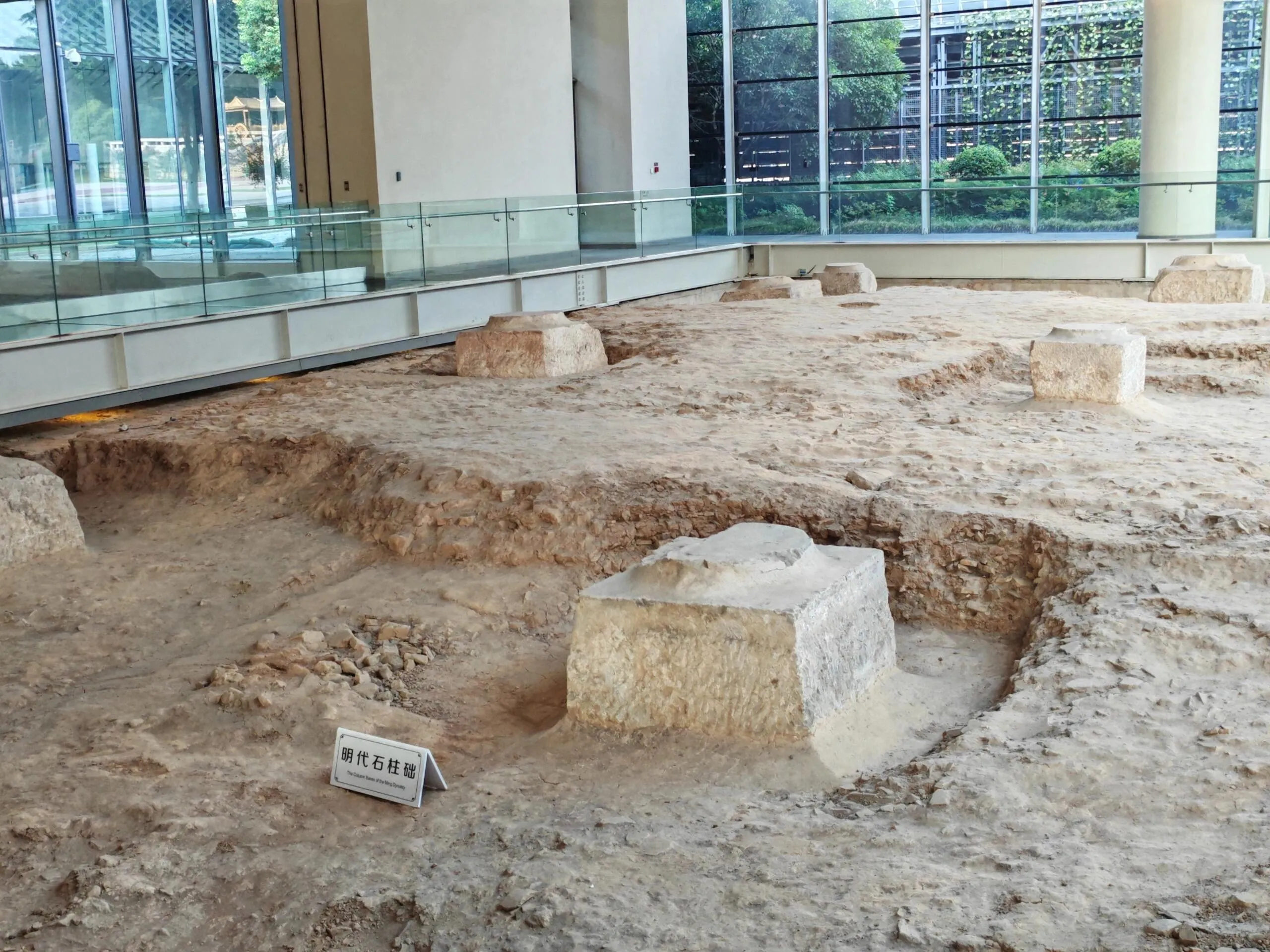 中轴遗址区包括天王殿遗址、正殿遗址、月台遗址等重要建筑遗迹 。天王殿遗址两侧的琉璃画展现了南京佛教史上的重要事件和人物。正殿遗址保存了大型石柱础,月台则是举行重要仪式的场所。