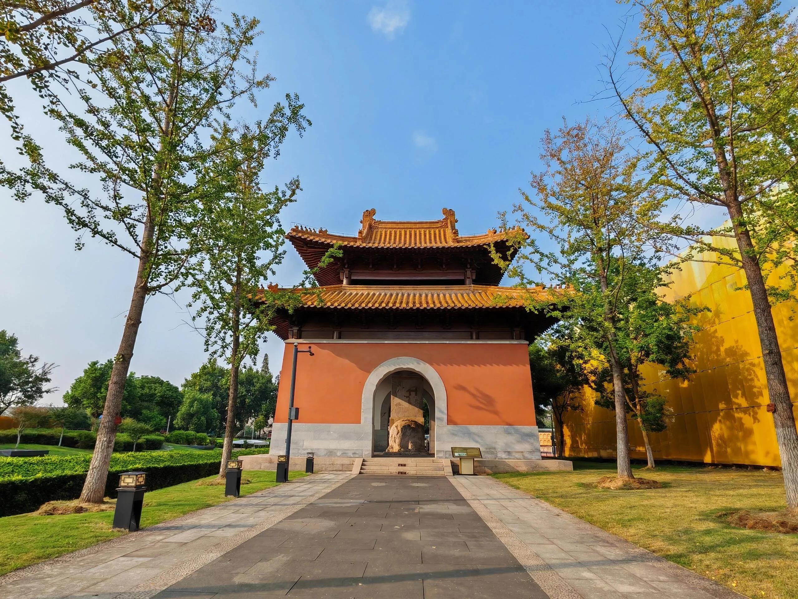 圣地广场上,大报恩圣地石碑记载了寺庙的悠久历史 。两侧分别是朱棣撰写的永乐碑和朱瞻基所立的宣德碑。中间的拱形桥面是600多年前的香水河桥,展现了精妙的古代设计。