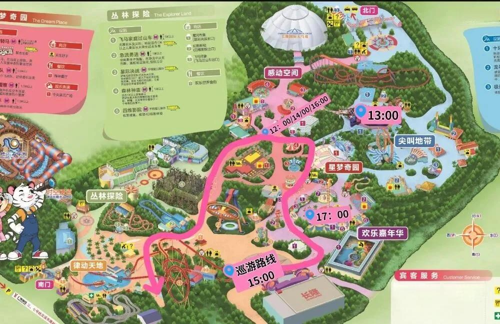 入园后,建议拿一张纸质地图,方便后续游玩。同时,可以在微信小程序搜索“长隆旅游”,实时查看各项目的排队时间。