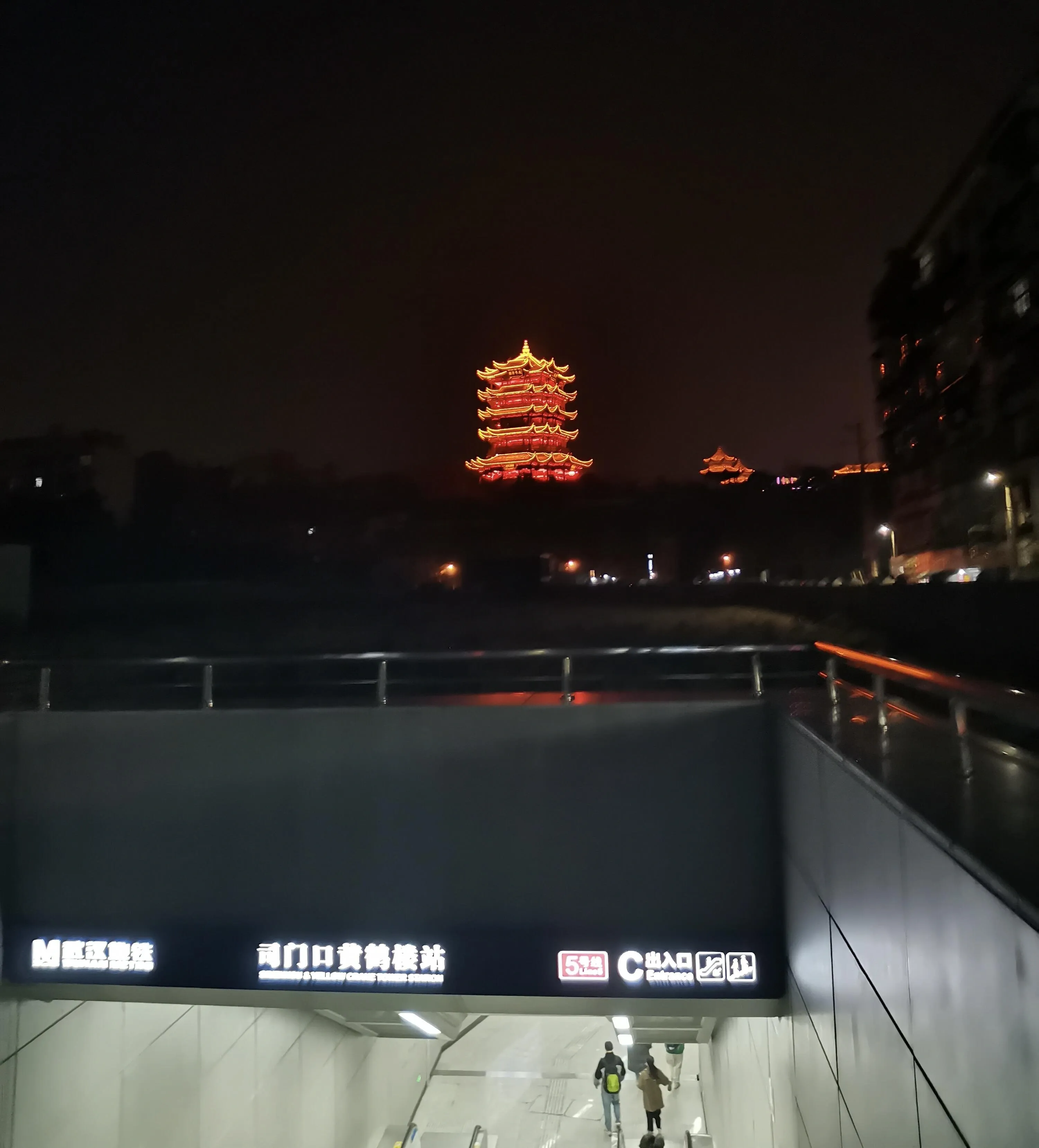 过桥后,黄鹤楼就在眼前。 桥上也是拍摄黄鹤楼的绝佳位置。 时间充裕的话,可以进楼欣赏灯光秀,否则在外拍照打卡也是不错的选择。