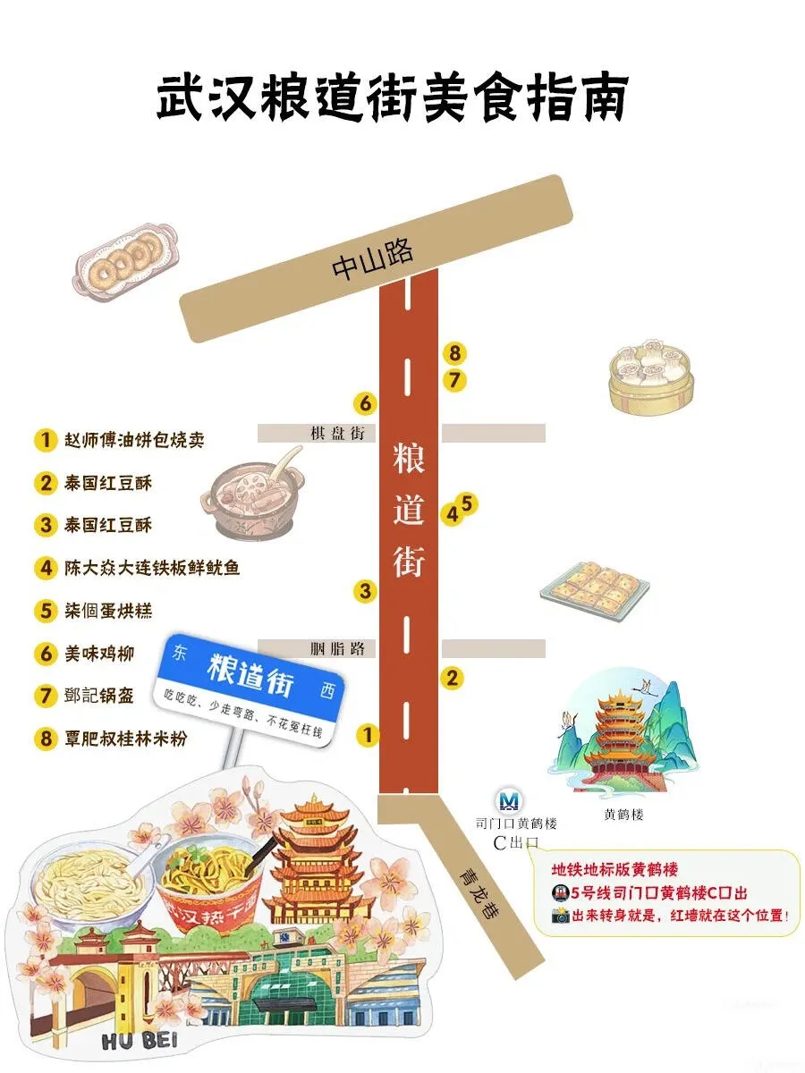 接下来到达粮道街, 这里是一条超长的美食街,汇集了众多武汉知名餐厅 ,可以尽情品尝当地美食。