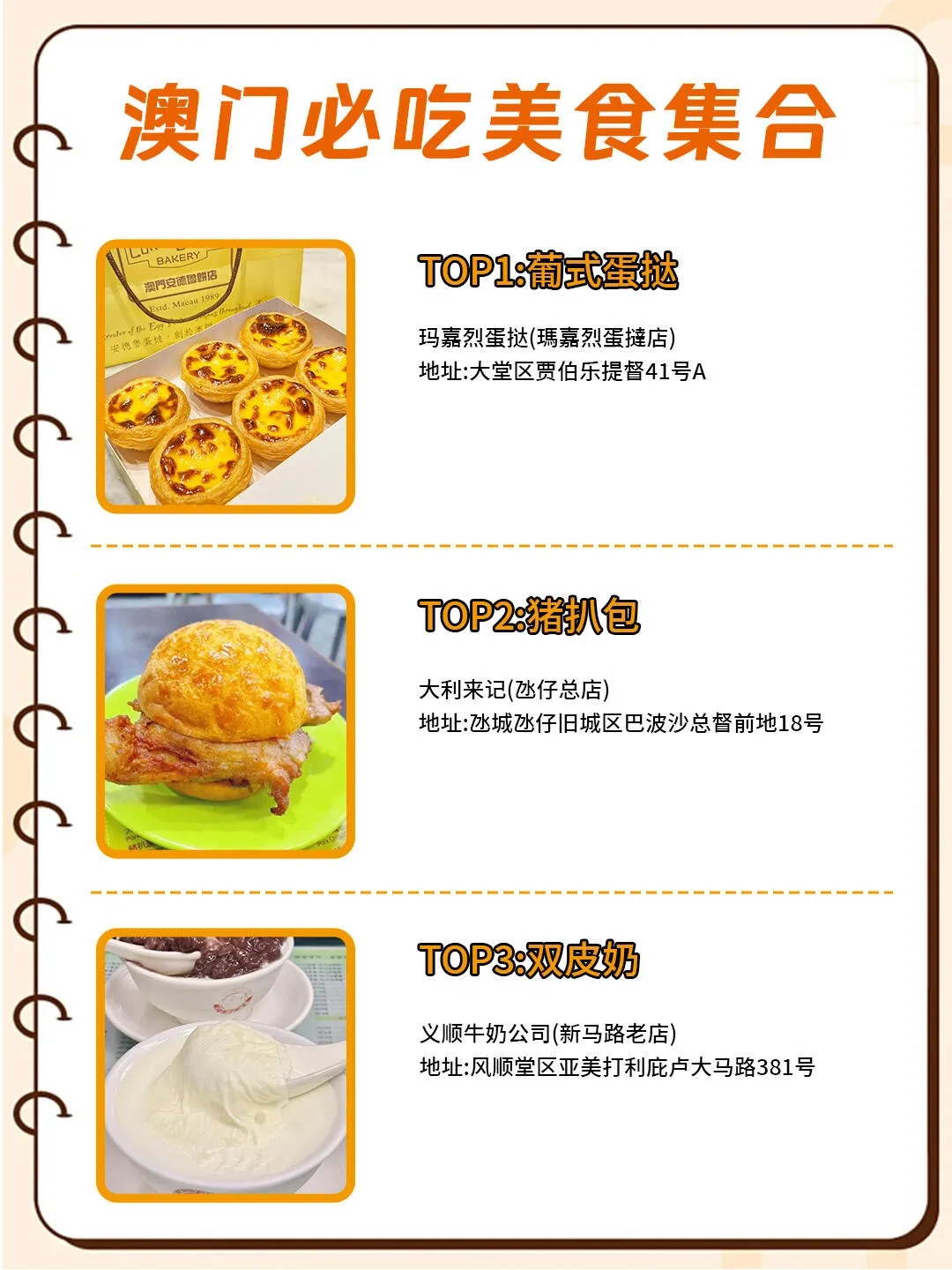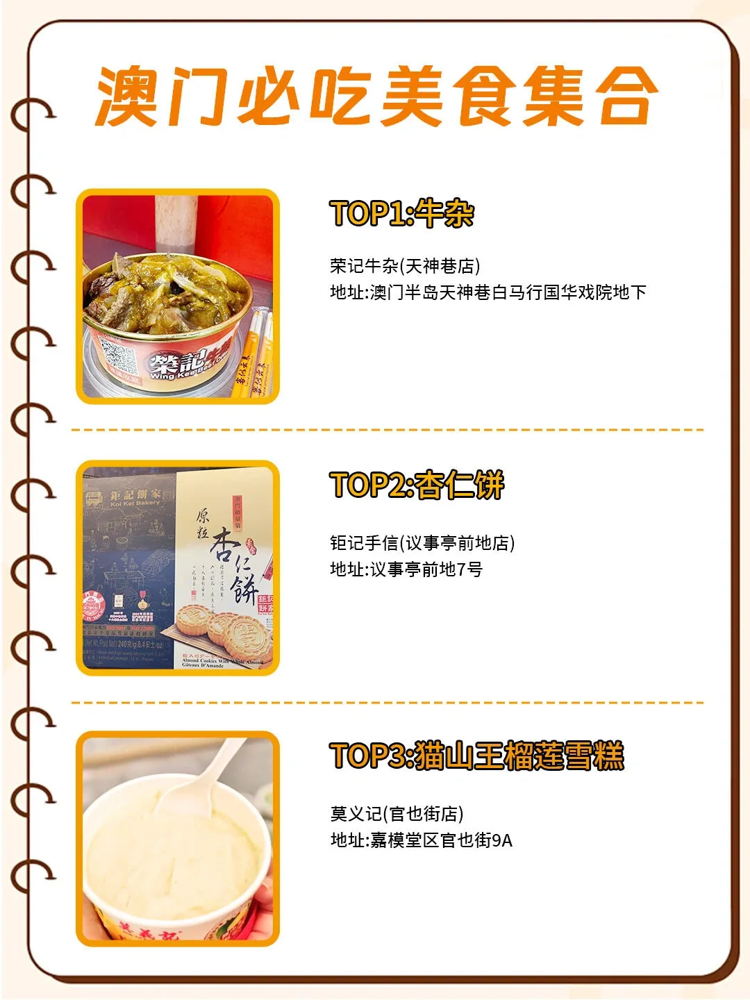 除此之外,还有许多美食值得品尝,如荣记牛杂、杏仁饼、猫山王榴莲雪糕、葡式蛋挞、猪扒包和双皮奶等。