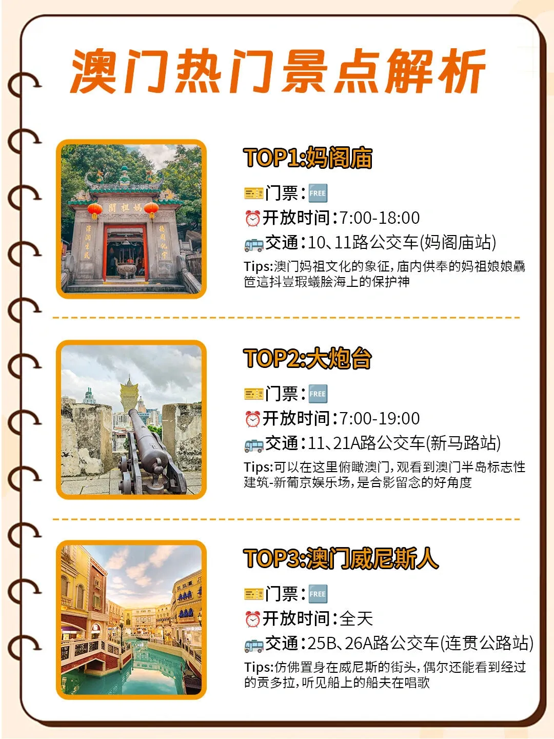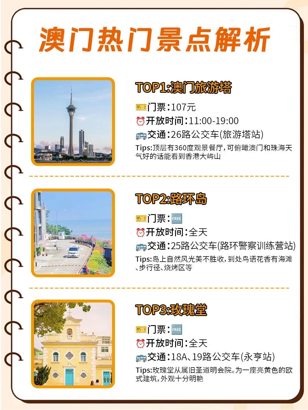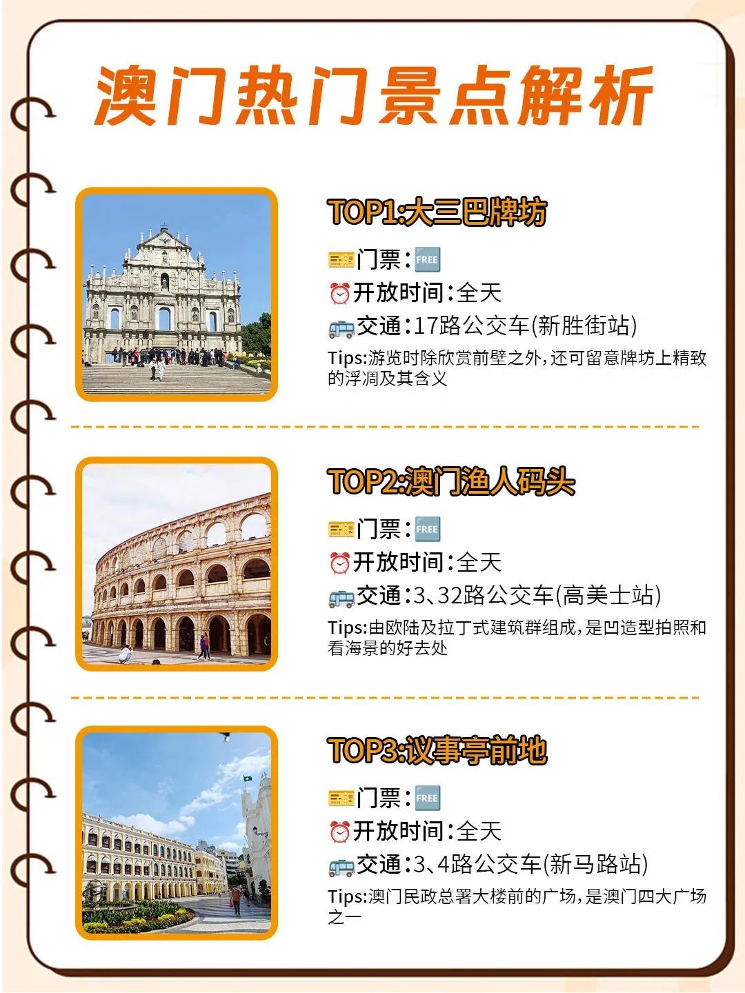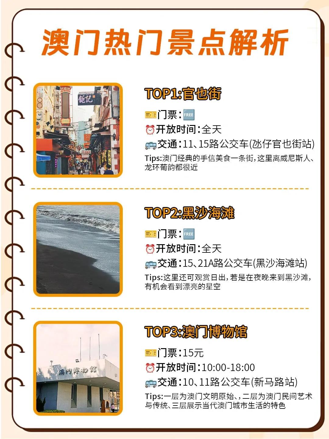 其他热门景点包括大三巴牌坊、澳门渔人码头、议事亭前地、澳门旅游塔、路环岛、玫瑰堂、官也街、黑沙海滩和澳门博物馆等,每个景点都各具特色。