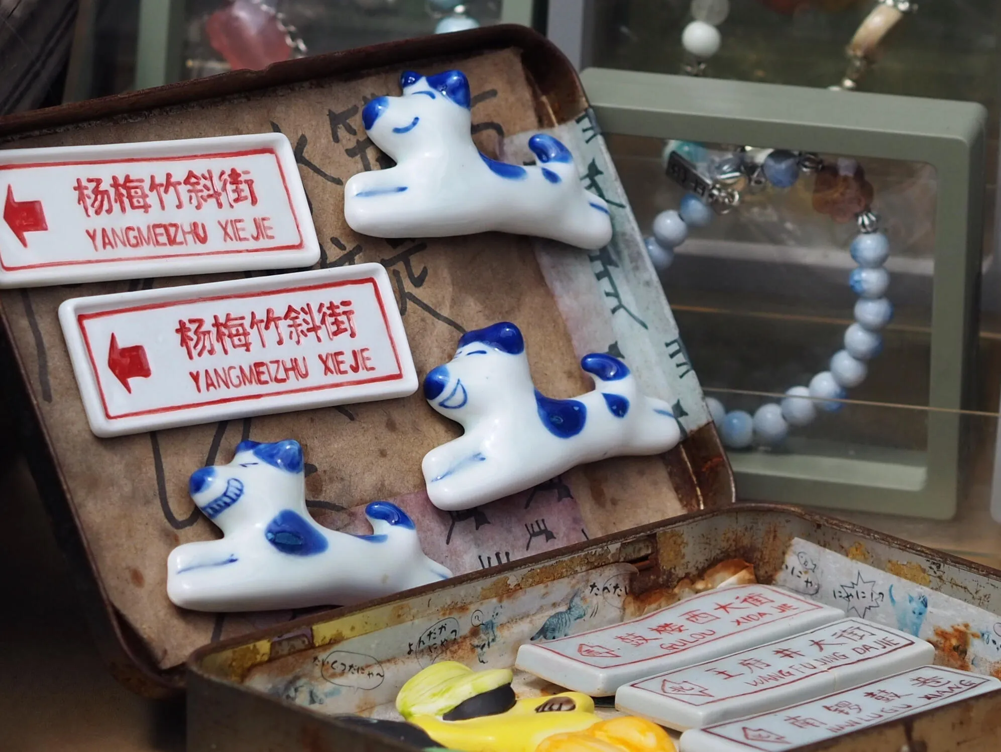 琉璃厂以字画装裱和民乐器店铺为主,还有许多兔儿爷摆件。关于兔儿爷,有一个有趣的传说:据说有一年北京城爆发瘟疫,玉兔下凡给百姓治病。为了获得百姓的信任,玉兔借来神仙装扮挨家挨户治病。当人们看到她返回月宫时才恍然大悟,原来给自己看病的是玉兔。为了感谢她,百姓在中秋节期间以身穿神仙盔甲的兔儿爷形象祭祀玉兔,祈求她保佑家人健康平安。