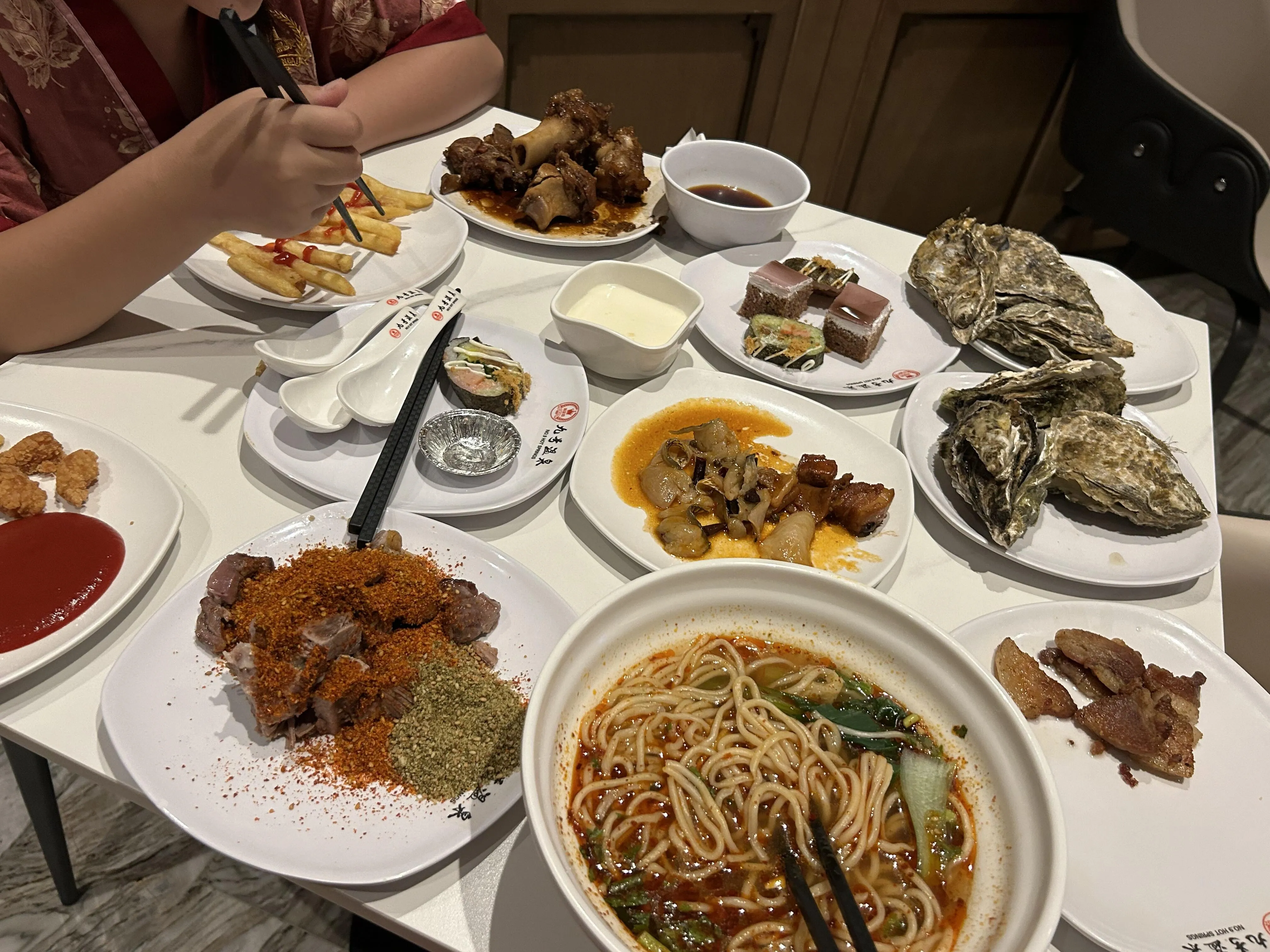 二楼是餐饮区 ,提供早午晚和夜宵四顿饭,种类丰富。有海鲜、面食、牛排、烤鸭、炸货和各种炒菜等。这里的重庆小面特别好吃!