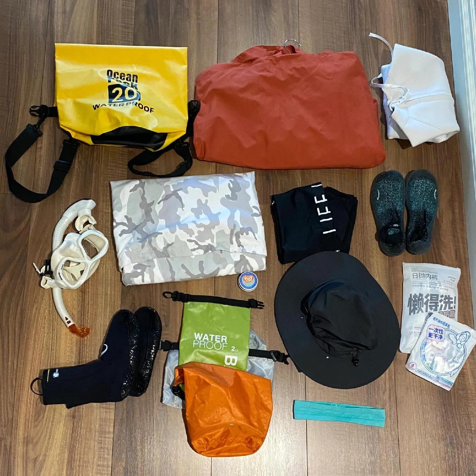 防水背包+防水袋:防水背包在船上特别有用,因为座位可能是湿的,容易把包打湿。防水袋可以用来装充电宝、手机等贵重物品,或者干衣物,也可以起到和行李箱里其他湿衣物隔离的作用。