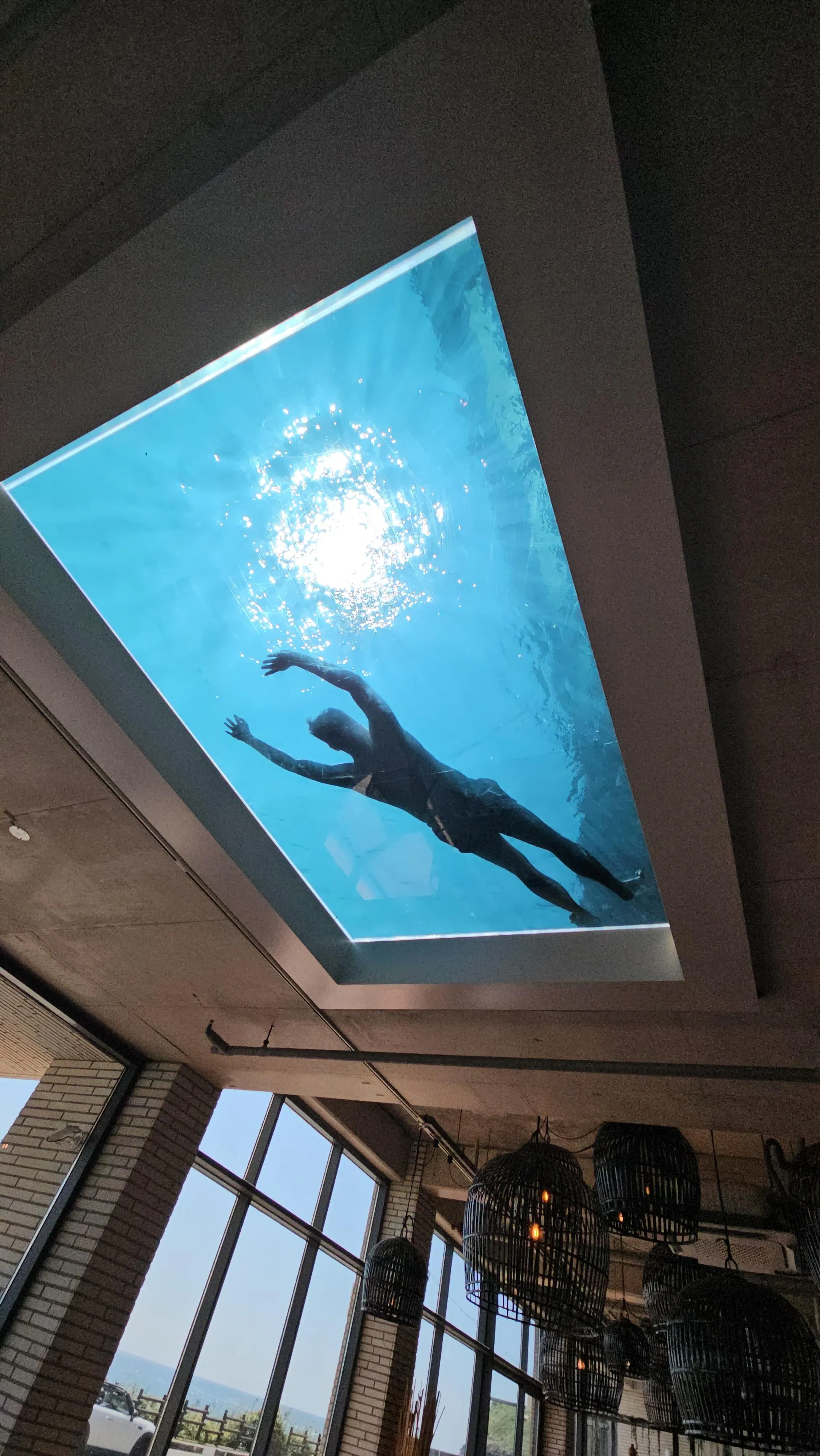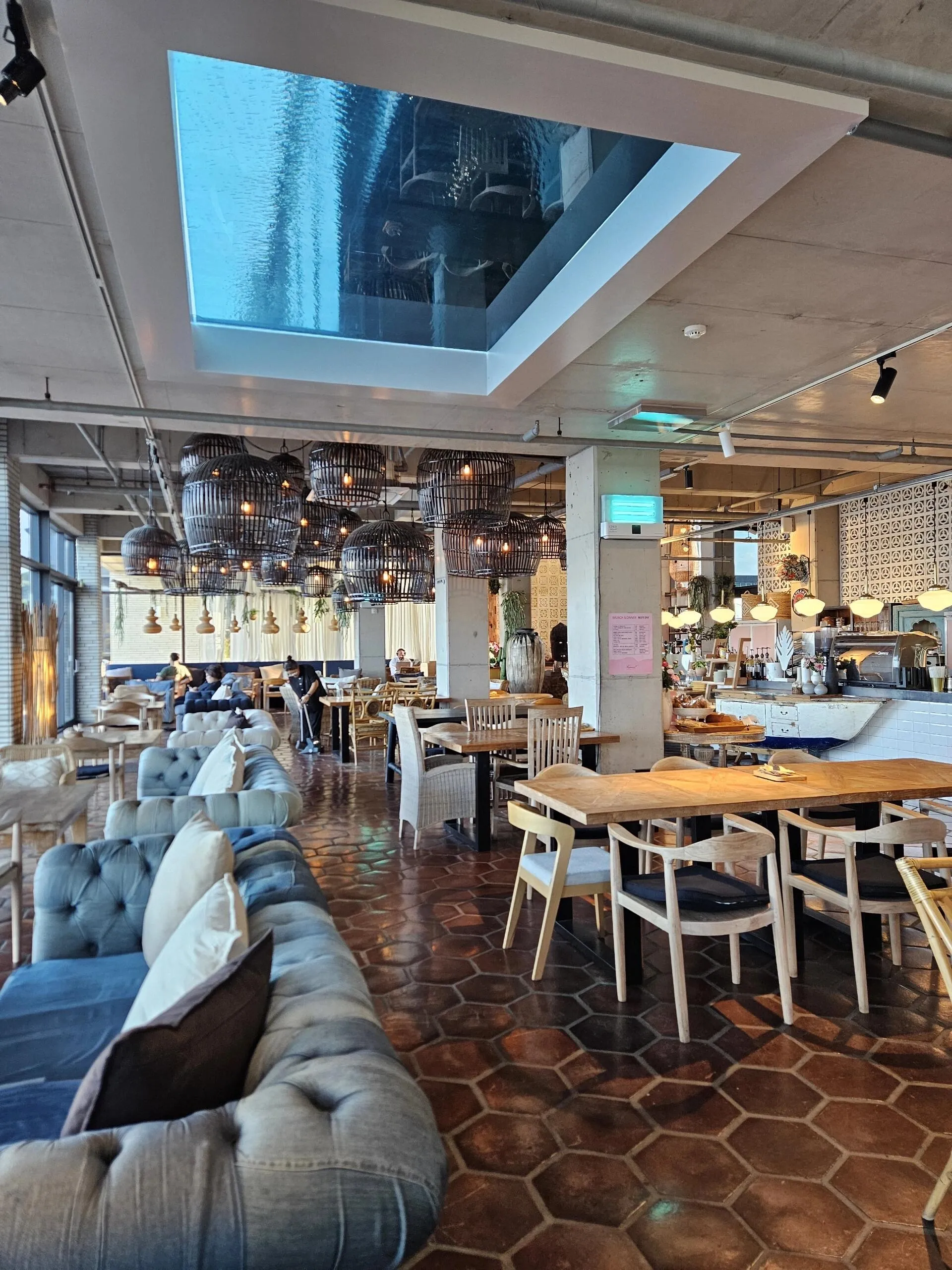 公共区域:一楼是咖啡厅、烘焙坊和餐吧,视野很好,食物也很美味。住店自带的早餐就在一楼提供。二楼是泳池,室内外相连的无边泳池,配有躺椅和沙发,池水非常干净。还有一个大平台可以看着大海练瑜伽,惬意至极。