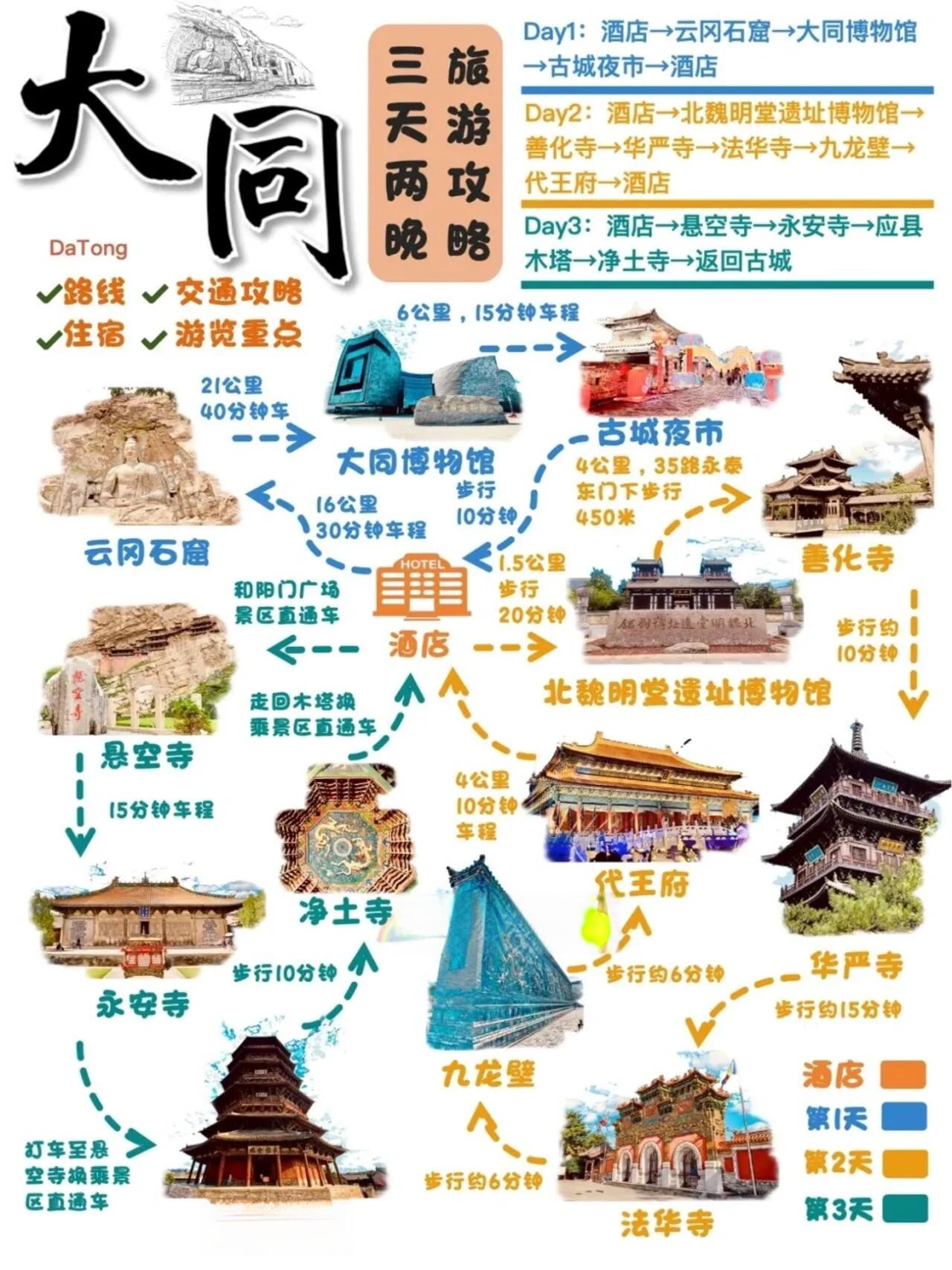 这份行程安排涵盖了大同的主要景点,包括著名的云冈石窟、悬空寺和应县木塔等,让游客能够充分感受大同的历史文化魅力。