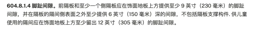 在美国的残疾人法案(Americans with Disabilities Act)中,则规定公共卫生间的单元门与地面之间须留出9英寸(约23厘米)的间隙,这个高度比我国的规定要高出不少。