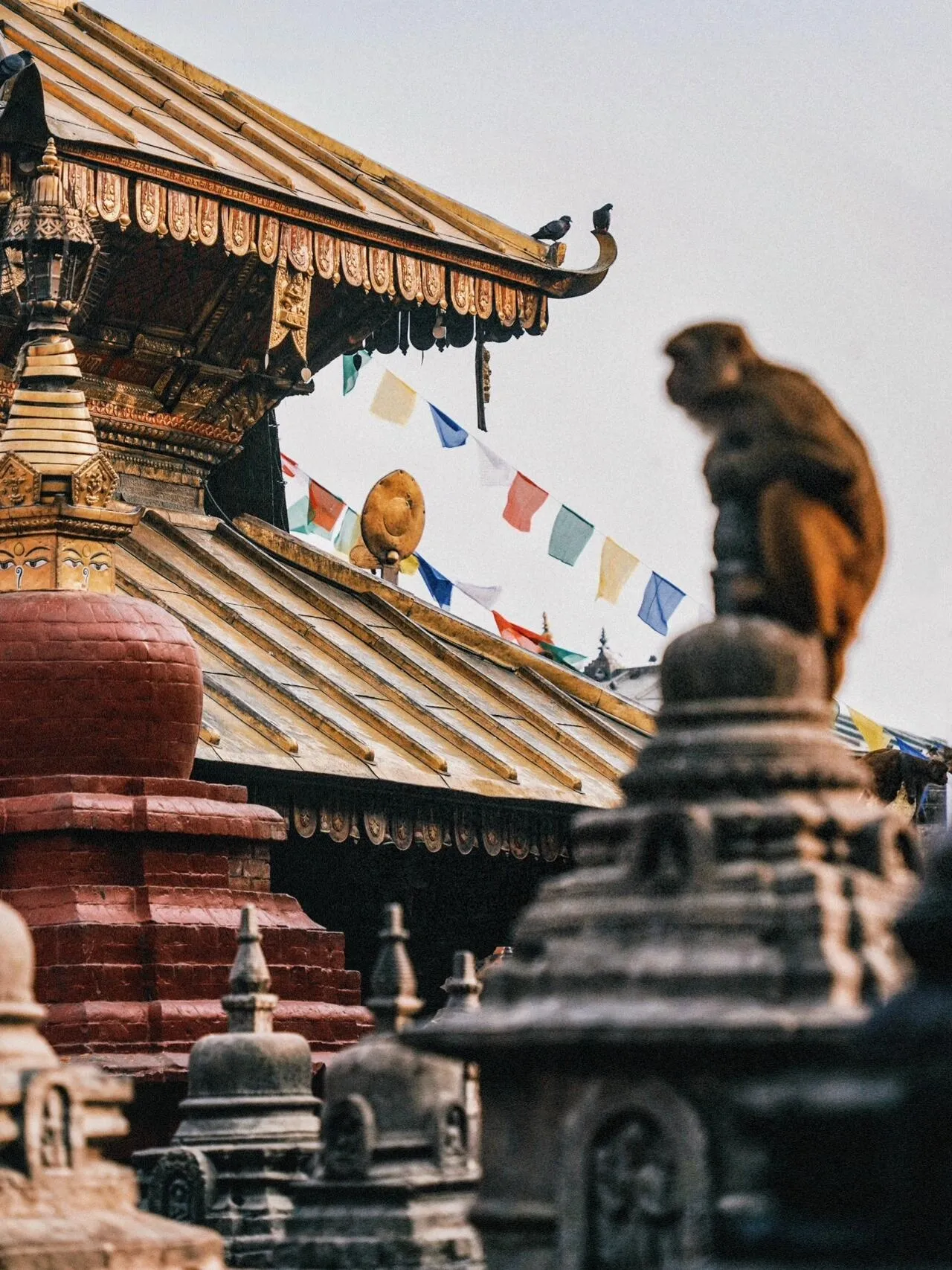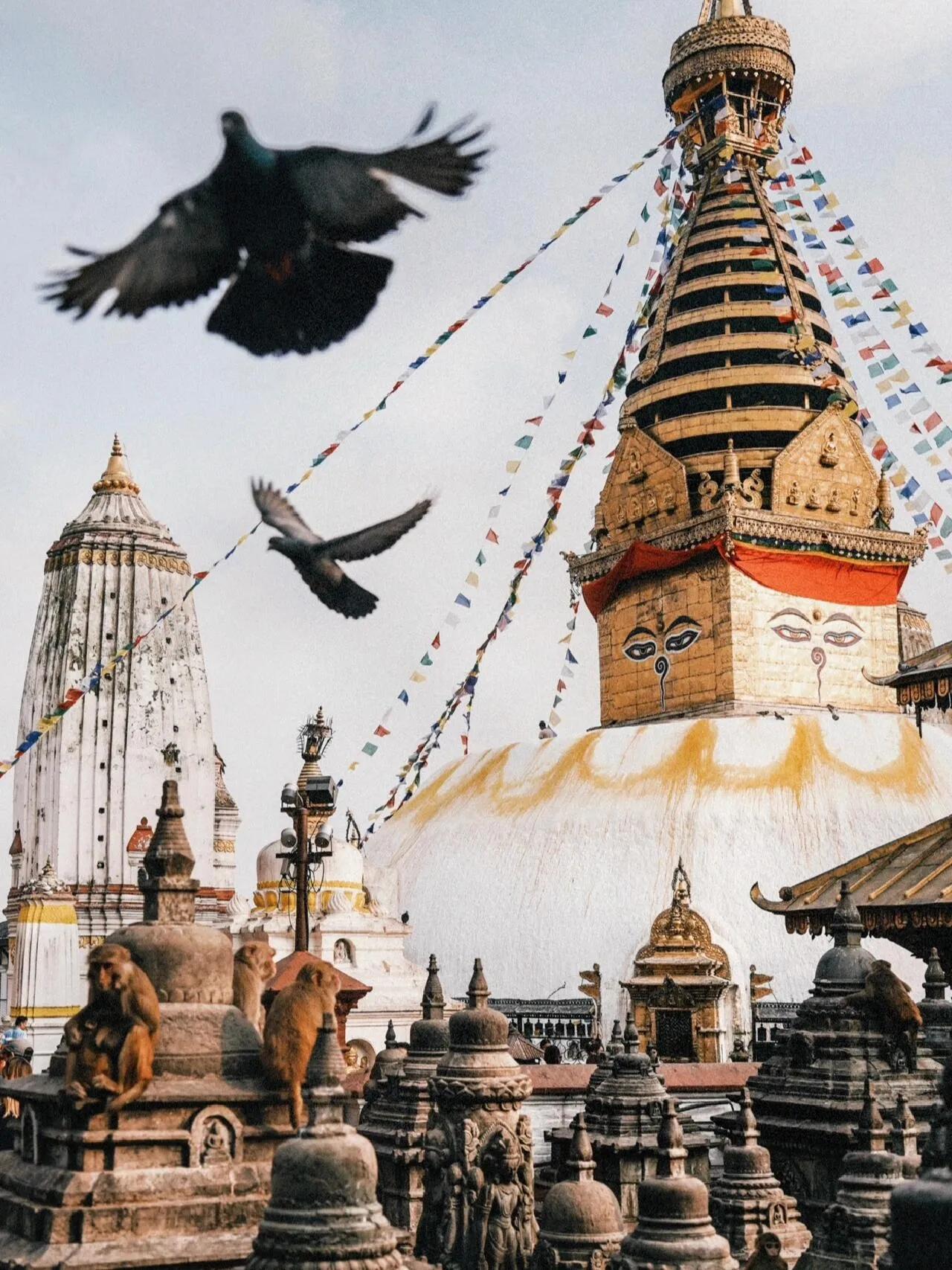 在猴庙,你可以看到来自世界各地的游客 :中国人、穿着藏装的藏族人、修行的僧人、欧洲人和本地人。还有数不清的猴子军团和佛像上空盘旋的鸽子。难怪人人都说这里是神与众生共存的地方。