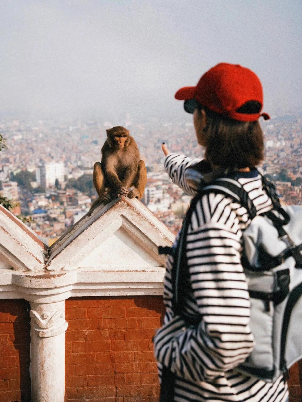 今天我们来到了Monkey Temple(猴庙)。这是尼泊尔最古老的佛教寺庙之一,也是佛教和印度教并存的寺庙。山上收养了几千只猴子,所以被称为“猴庙”。 这里的猴子通常不会主动攻击人,但最好还是不要去招惹它们。 要小心保管好自己的东西,我们的可乐就被猴子抢走了。