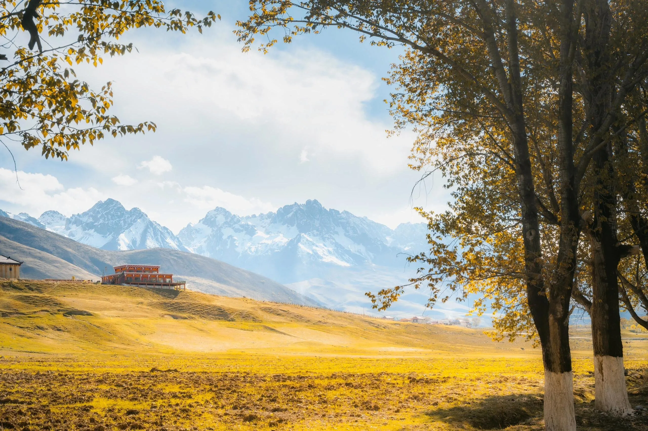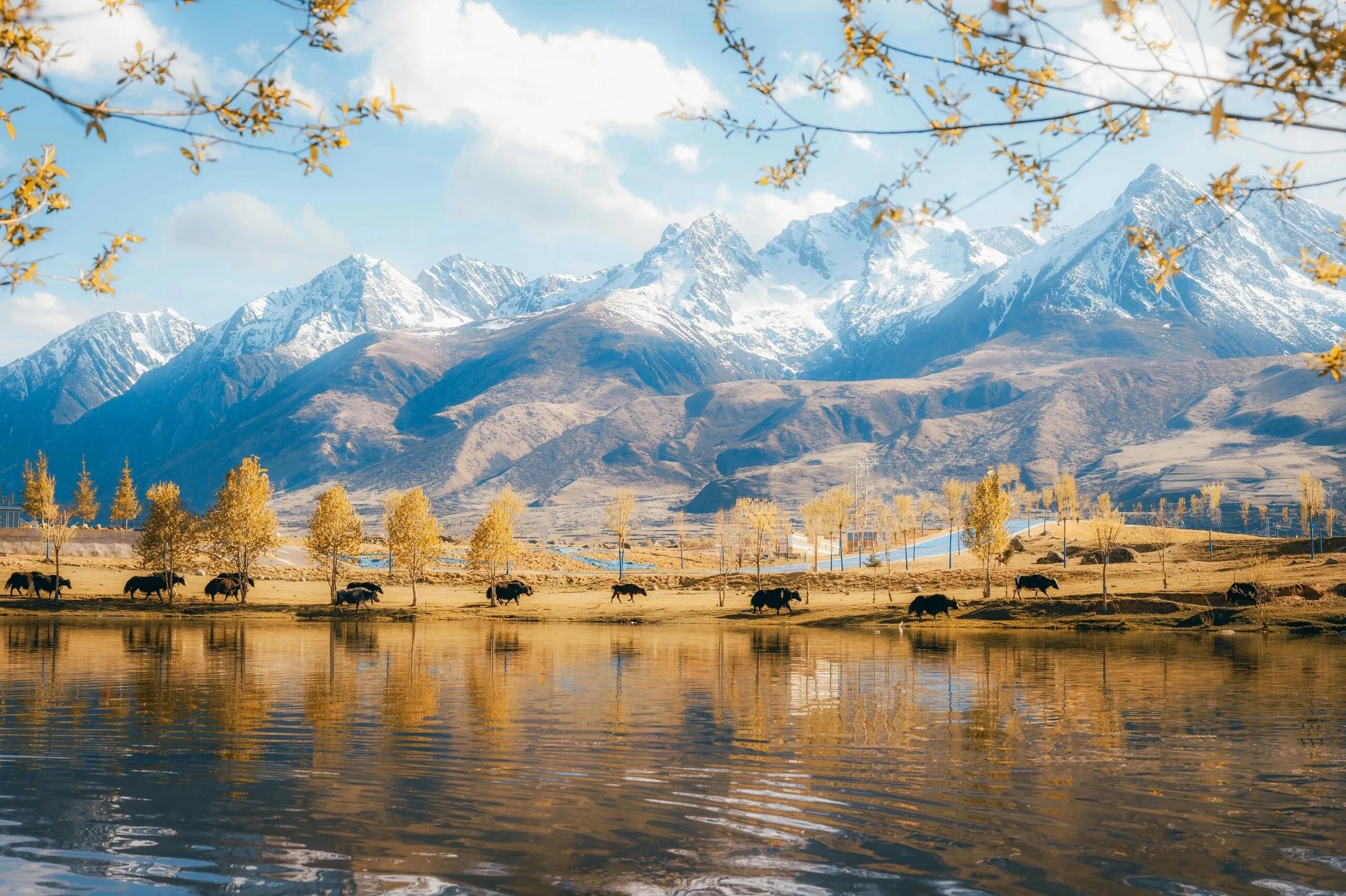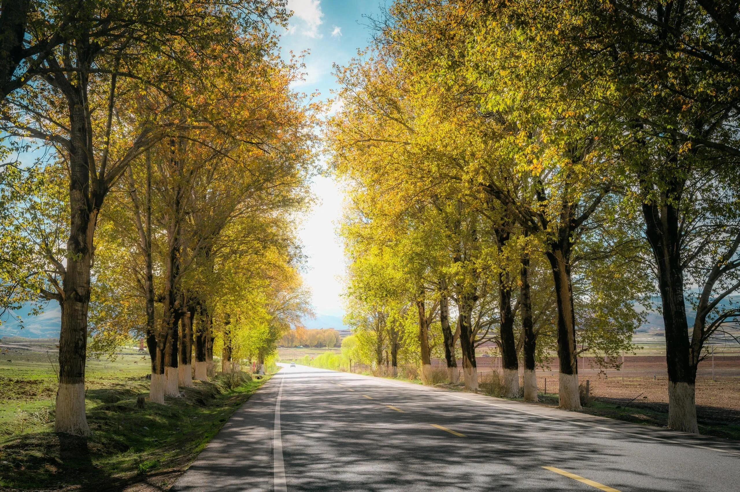 这里的美,在于雪山与田园的完美结合。与其他地方的雪山不同,百里青稞画廊的雪山既不是远在天边,也不是孤傲独立,而是与田园村庄和谐共存。当你行驶在这条公路上,两旁巨大的杨树掠过眼前,透过树叶的缝隙,你会看到连绵起伏的青稞田,蜿蜒的河流,远处的村落,以及村落之上雄伟的雪山。