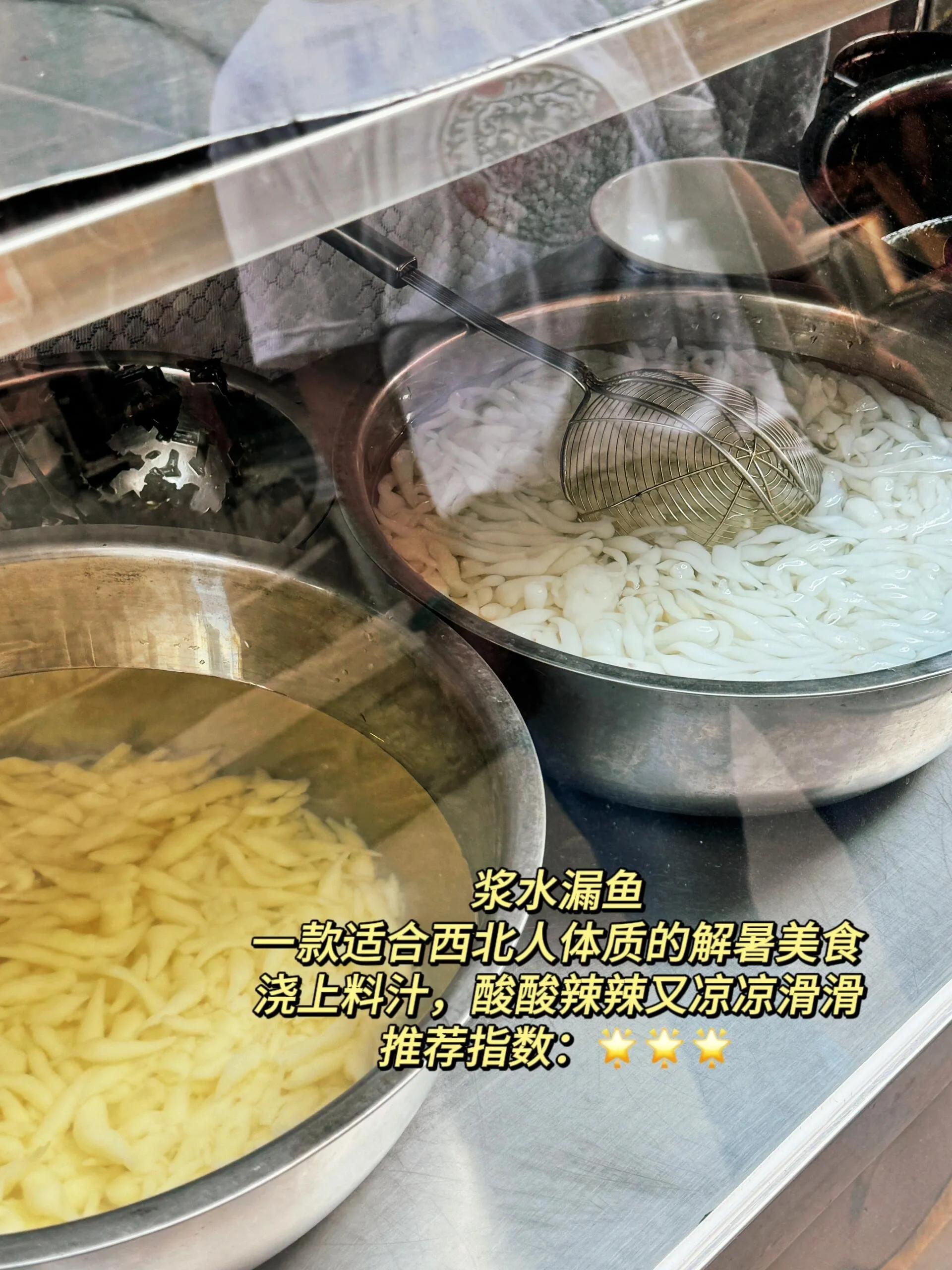 浆水漏鱼是甘肃独有的特色小吃。“漏鱼”其实是未成型的凉粉,因形状像小鱼苗而得名。这道冰凉的小吃搭配发酵的浆水和韭菜花,既解腻又解暑。