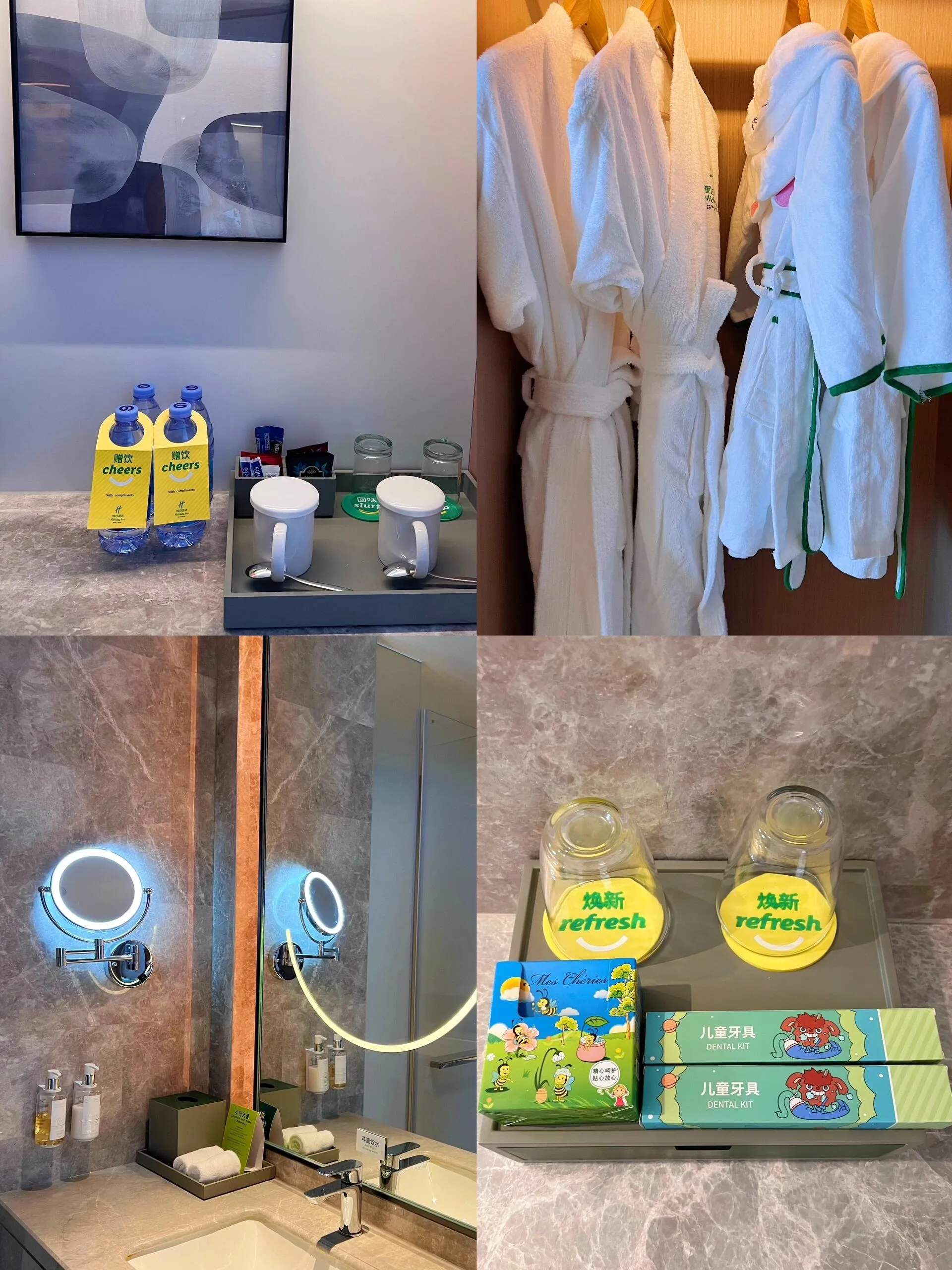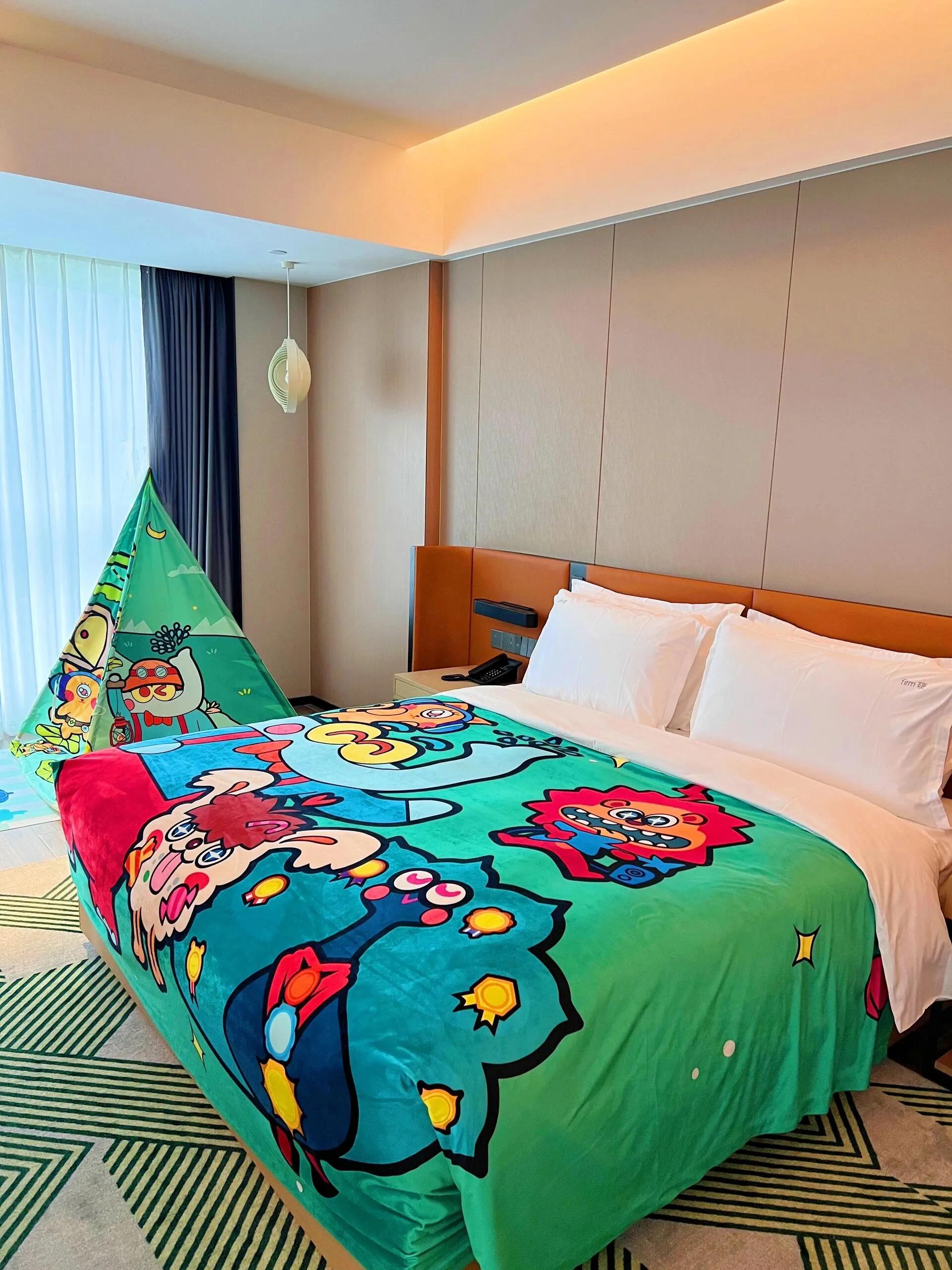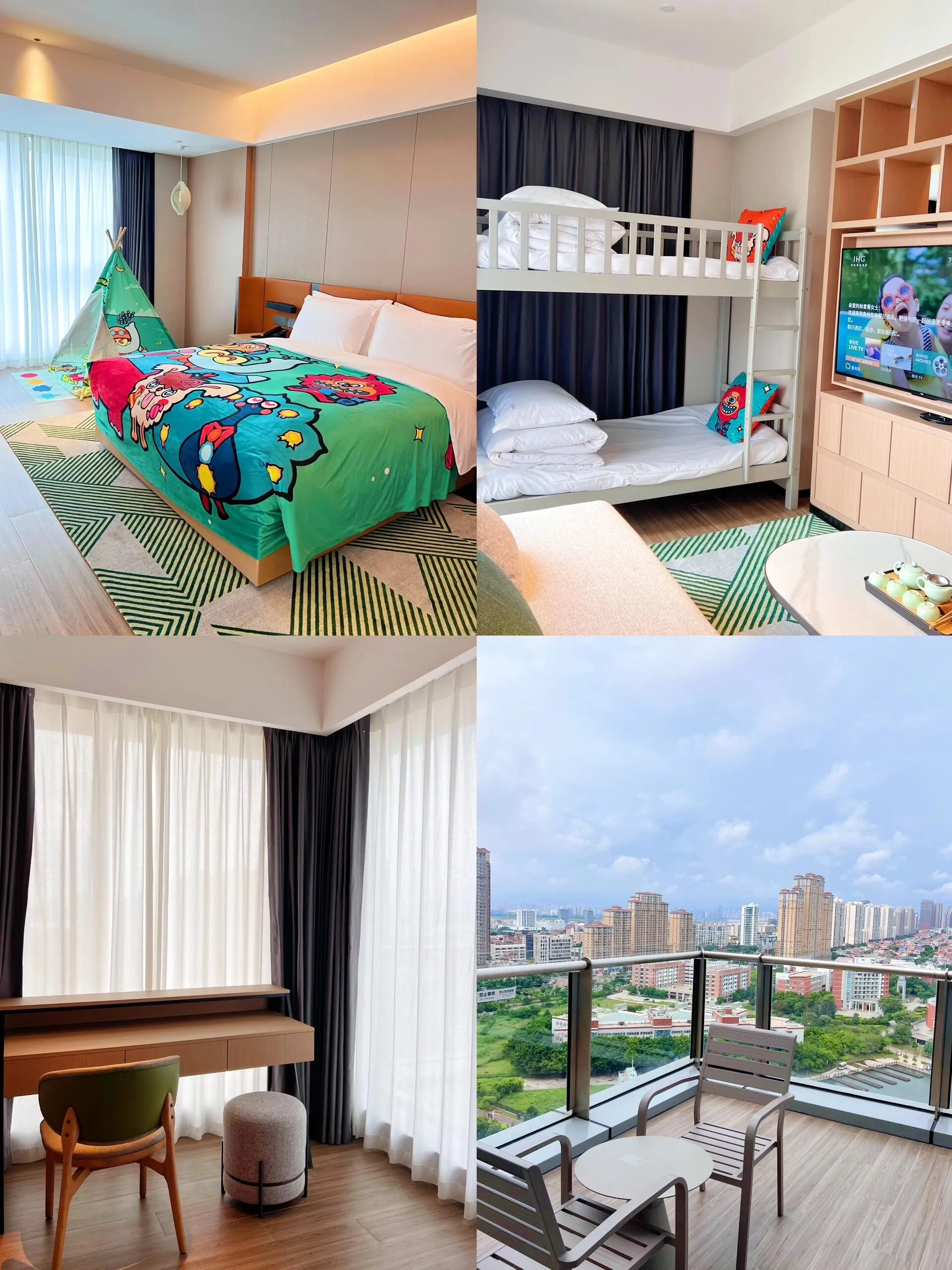 关于住宿,我们选择了泉州东海假日酒店。这家酒店位置很方便,距离泉州市科技馆步行可达(不过要记得提前预约),离蟳埔村也只有10分钟车程。我们入住的是充满童趣的小神兽亲子房,房间面积很大,是开放式的套房,有大床和双层床上下铺。房间还配有一个户外露台,晚上在这里吃烧烤很惬意。