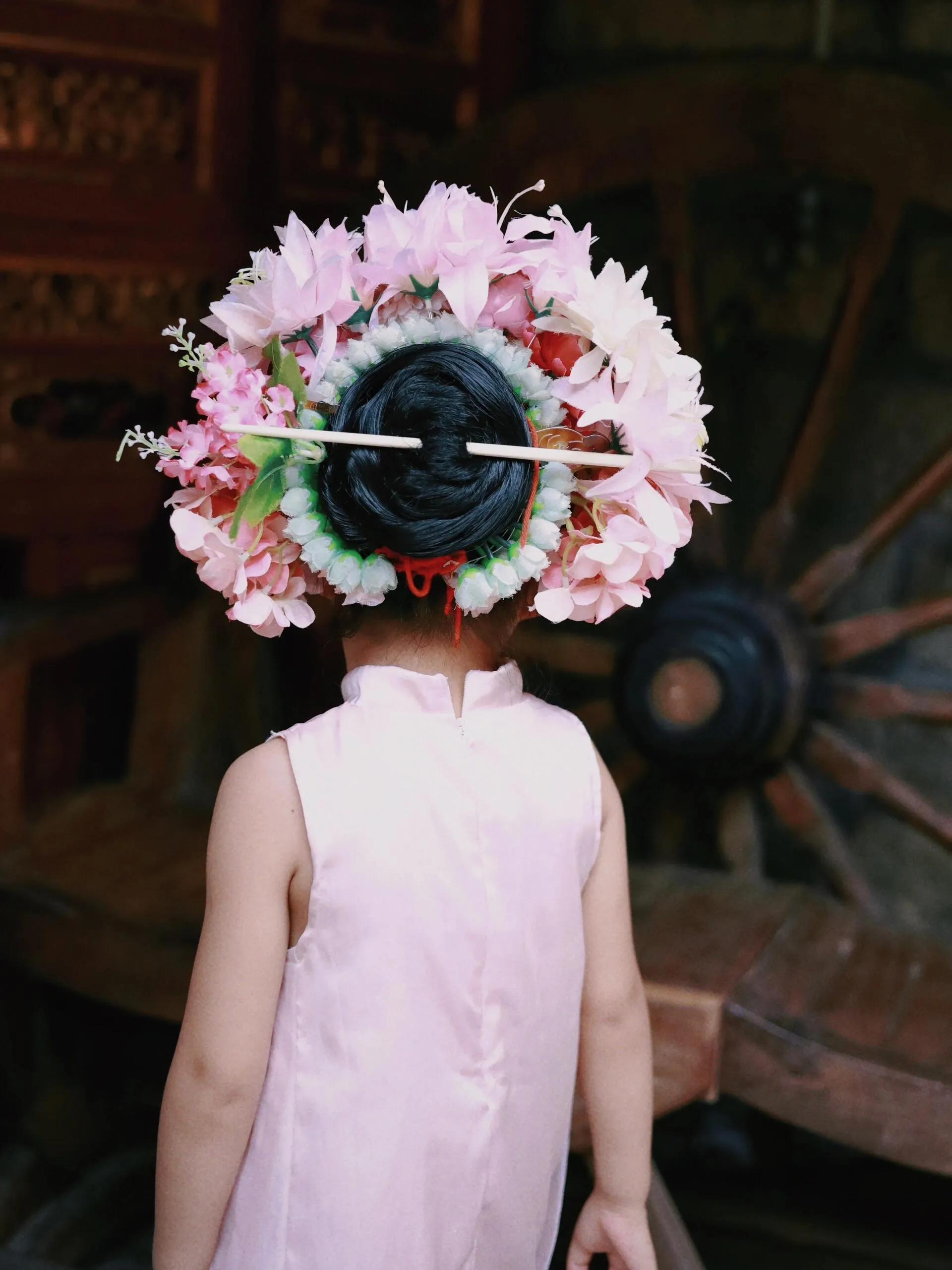 蟳埔村的簪花体验做得非常好,村里随处可见“簪花+服装+化妆+拍照”的一条龙服务。我女儿选了一条粉色新中式裙子,然后开始簪花。这里的簪花真的很精致,每一朵都是精心挑选搭配的。整个村子都是拍照的绝佳场景,随便一拍就很出片。边拍照边逛街的感觉真的很舒服。