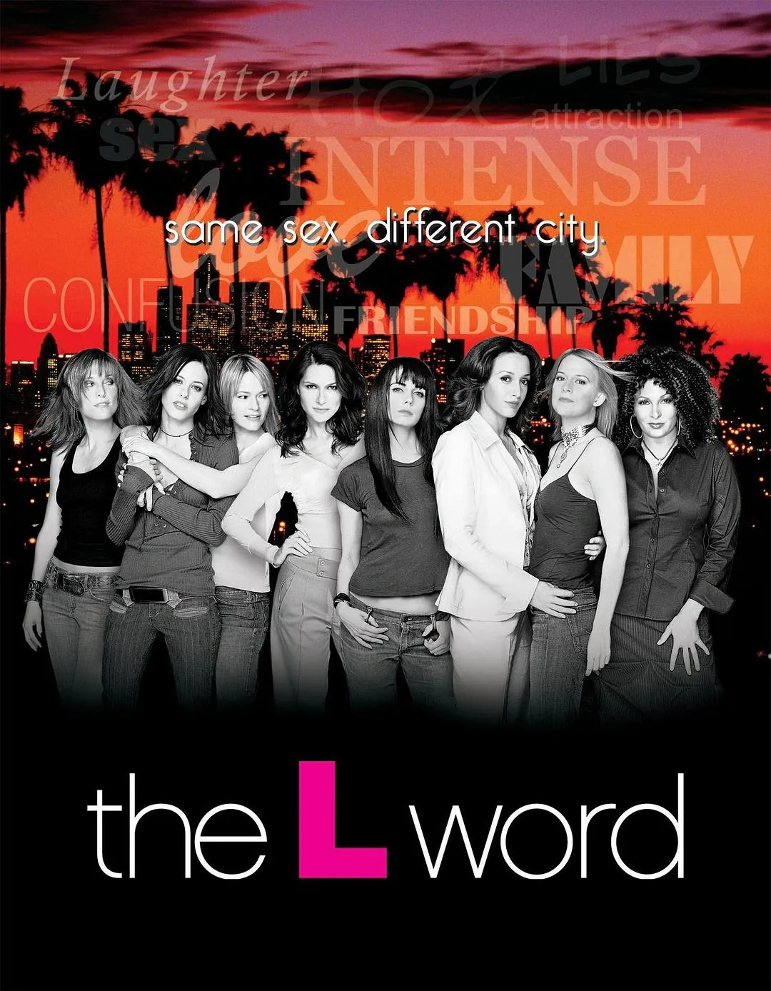 这部由美国Showtime电视台与米高梅公司联合制作的剧集,开创性地展现了多元化的女性形象和复杂的同性情感世界。在当时电视上“几乎不可见”的LGBTQ+题材,《拉字至上》的出现无疑是一次大胆的尝试。正如该剧的宣传口号“Same Sex, Different City”所传达的,它向大众展现了一群住在洛杉矶的女同志与双性恋女性,她们的生活与《欲望城市》中的异性恋女主角们并无二致,同样光明自信且热爱生活,唯一的区别在于她们的爱情与情欲对象是同性。