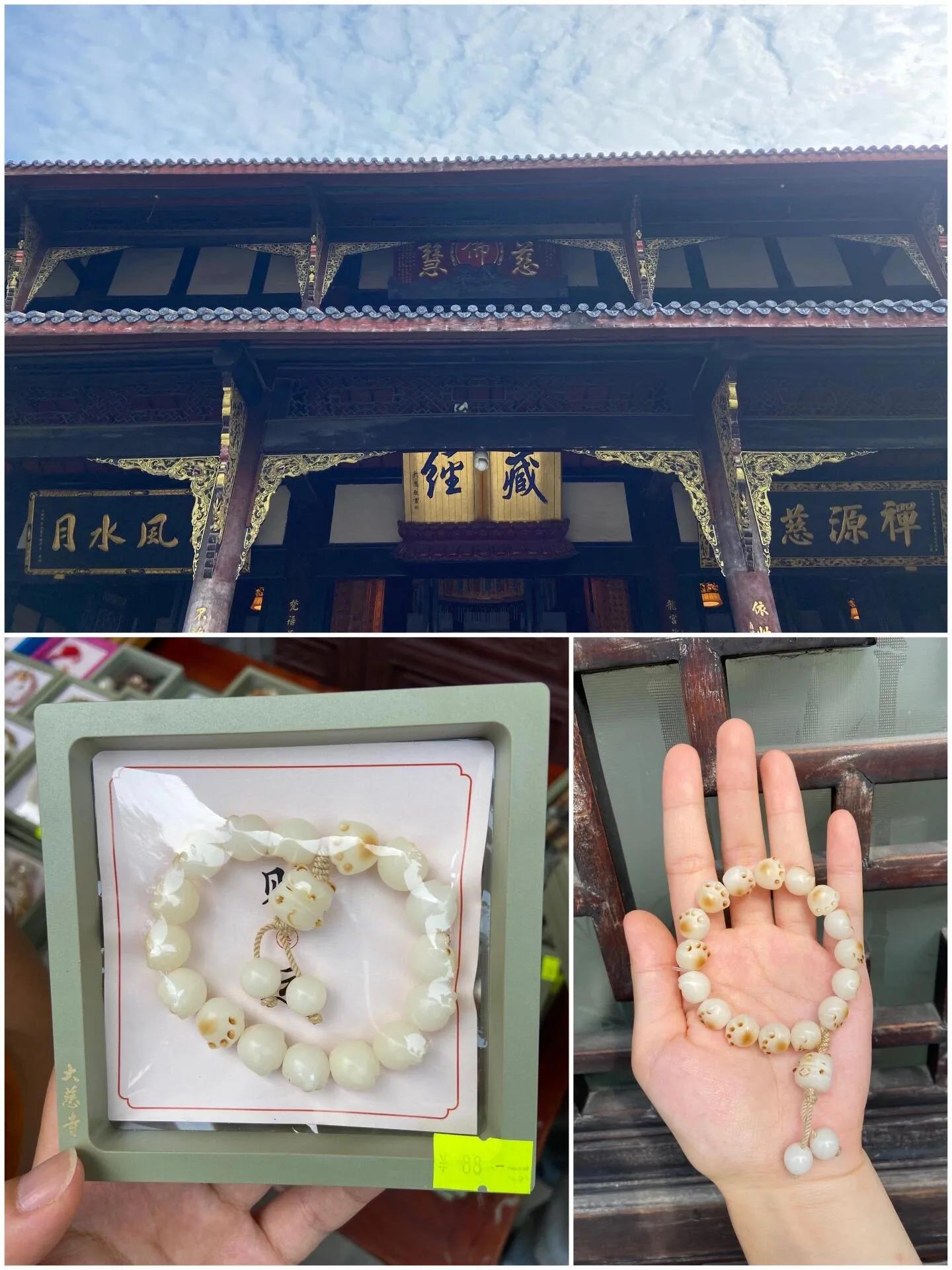 寺内有售卖“猫爪菩提”手串 ,每颗都是胖乎乎的奶白色猫爪形状,吊坠处还有一只小招财猫,整体造型可爱,寓意“猫招财运”。 手串售价88元,据说已经开过光 。购买后,可以自行带到“多宝阁”免费熏香加持,还可以免费领取保平安的“莲花贴”。