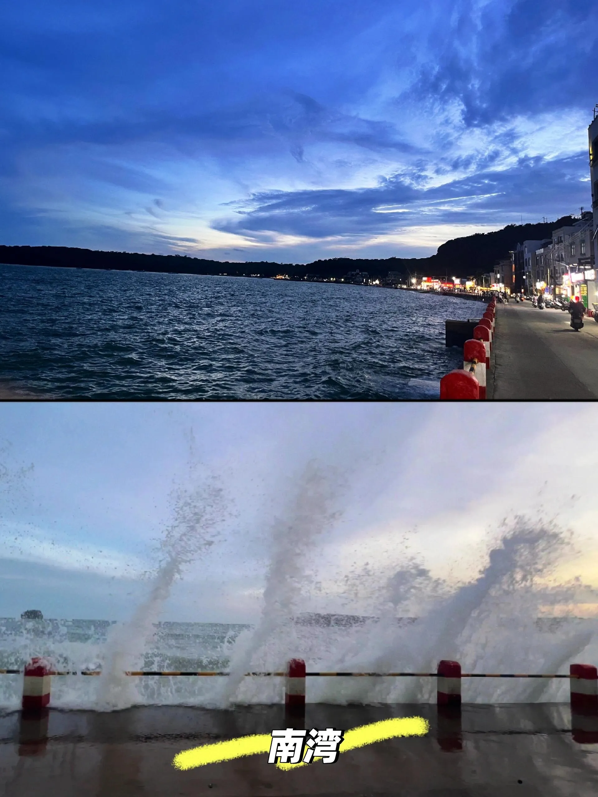 晚上可以逛南湾的商业街和菜市场。涨潮时,这里能看到海水拍打礁石的壮观景象。菜市场里的海鲜比北海贵15元左右,但水果如香蕉很便宜,只要5元一串。