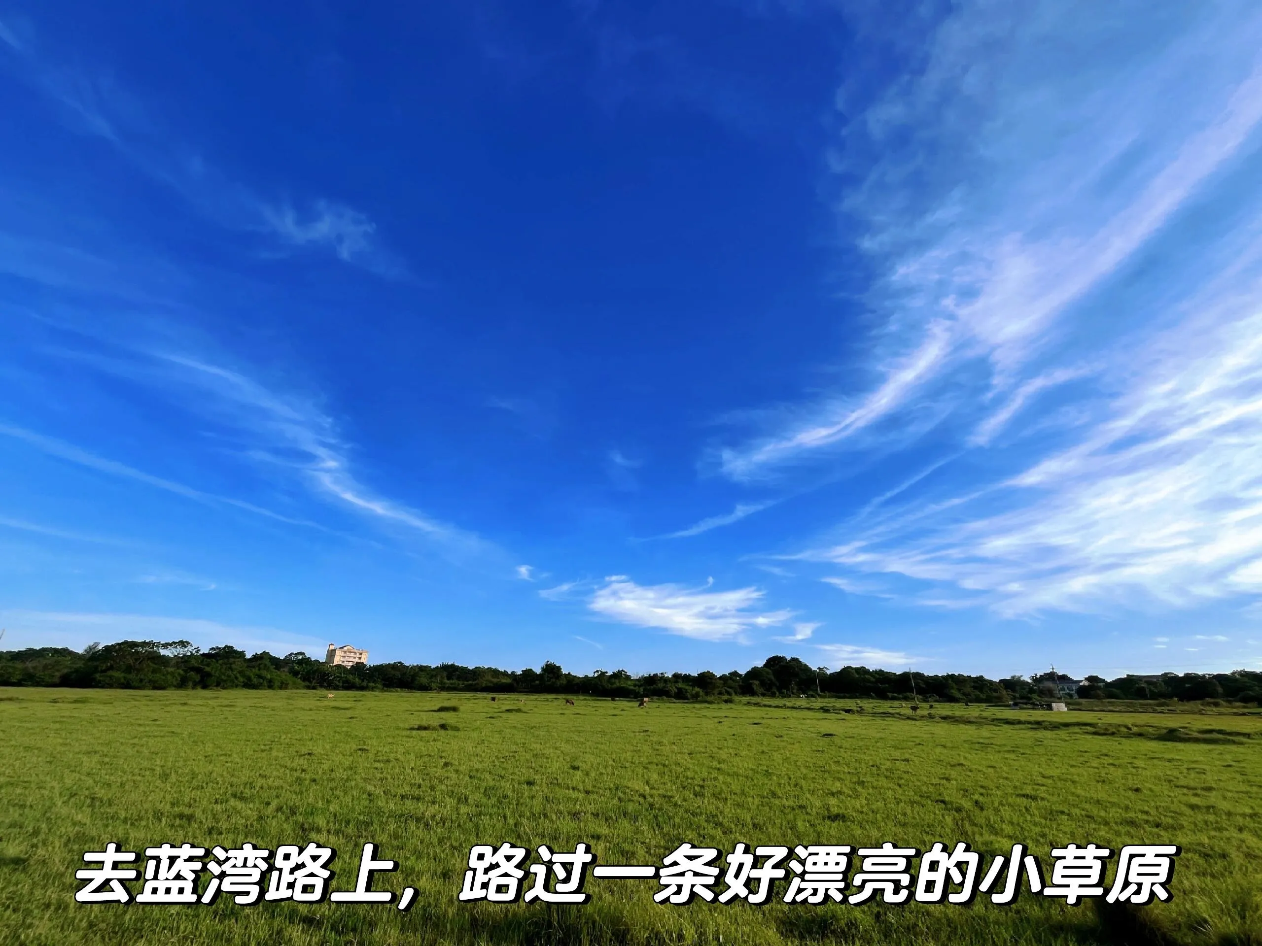 之后前往蓝桥,这是一条建在海上的小栈道,适合打卡拍照。但如果风浪太大,栈桥可能会关闭。去蓝桥的路上,导航可能会带你走一条小路,那里有一片小草原,景色开阔。