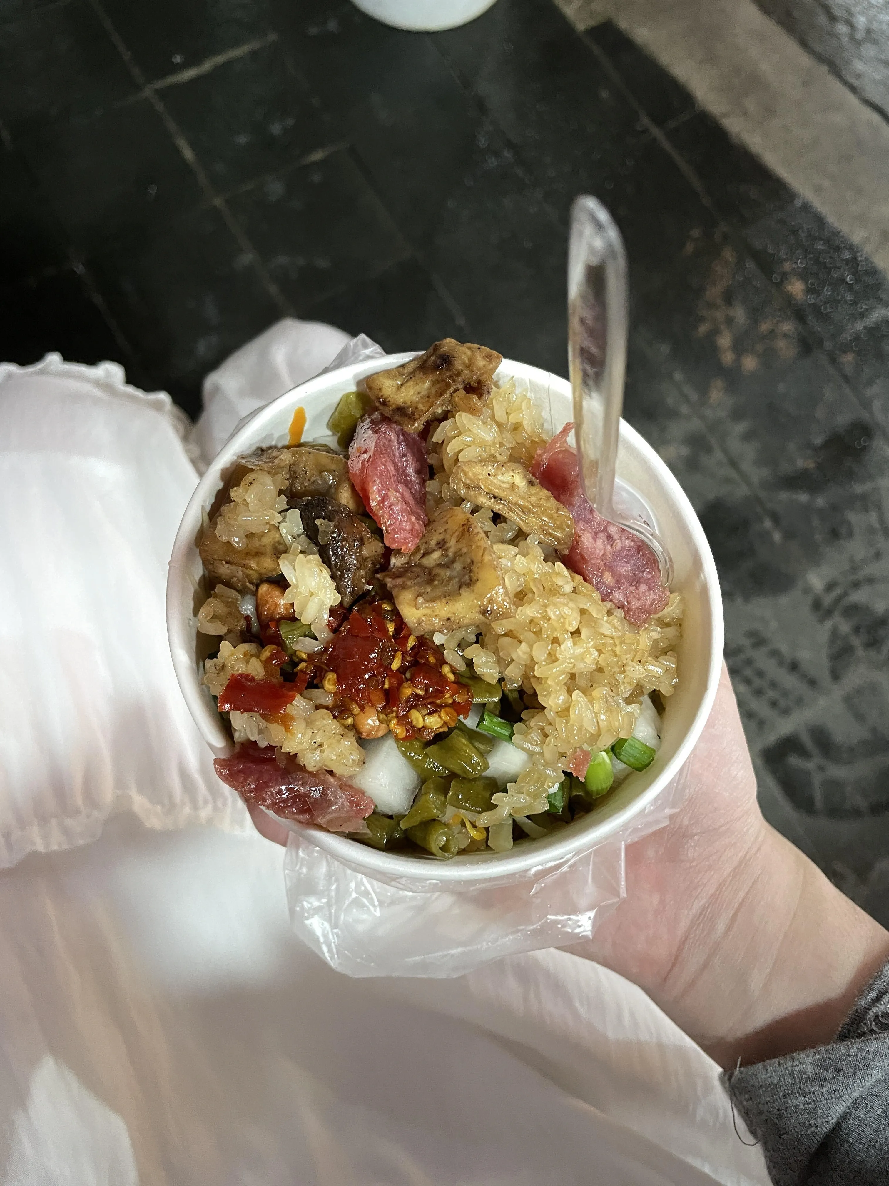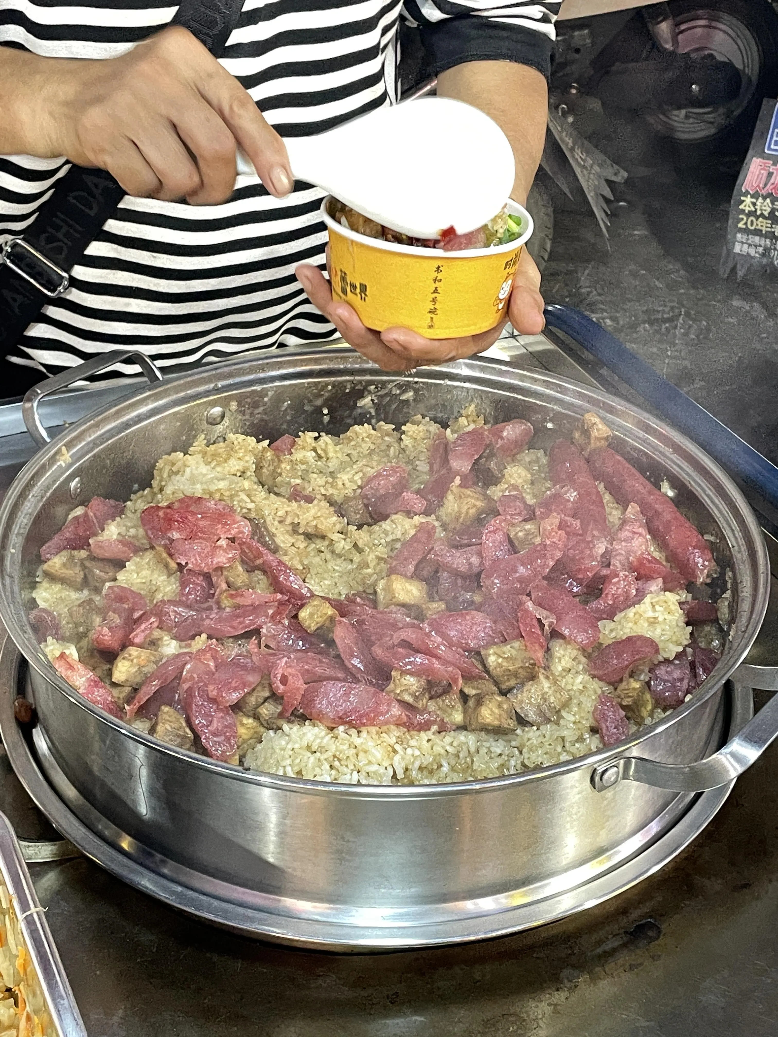 西街里的小档口有售,糯米饭搭配各种酸菜和腊肠,口感独特。