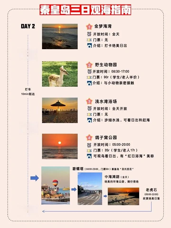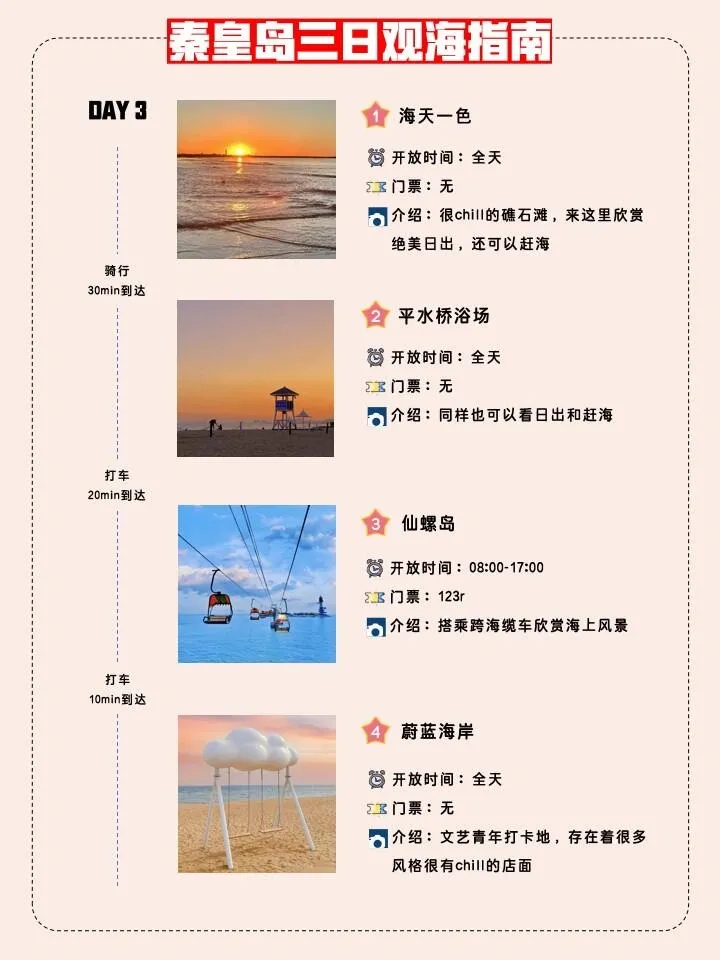 第一天:从历史悠久的老龙头开始,随后前往充满欢乐的乐岛。下午可以漫步在西港花园,感受海滨城市的魅力,最后在秦皇小巷品尝当地美食,结束这充实的一天。