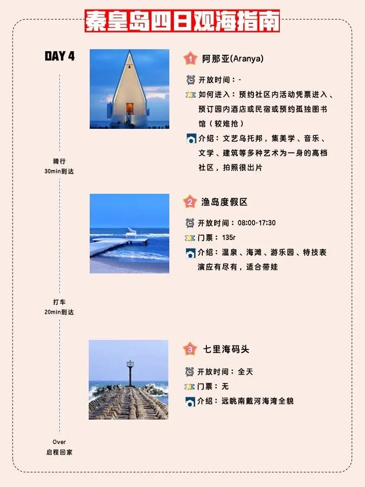 如果有四天的行程,不妨将阿那亚、渔岛度假区和七里海码头加入其中,体验更多秦皇岛的魅力。