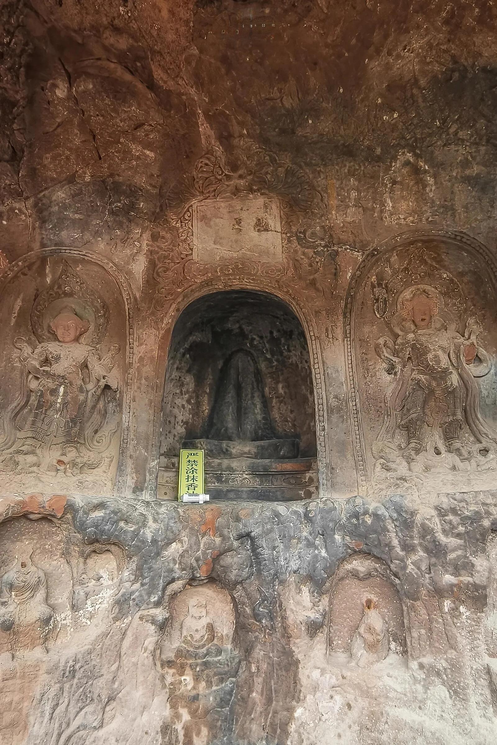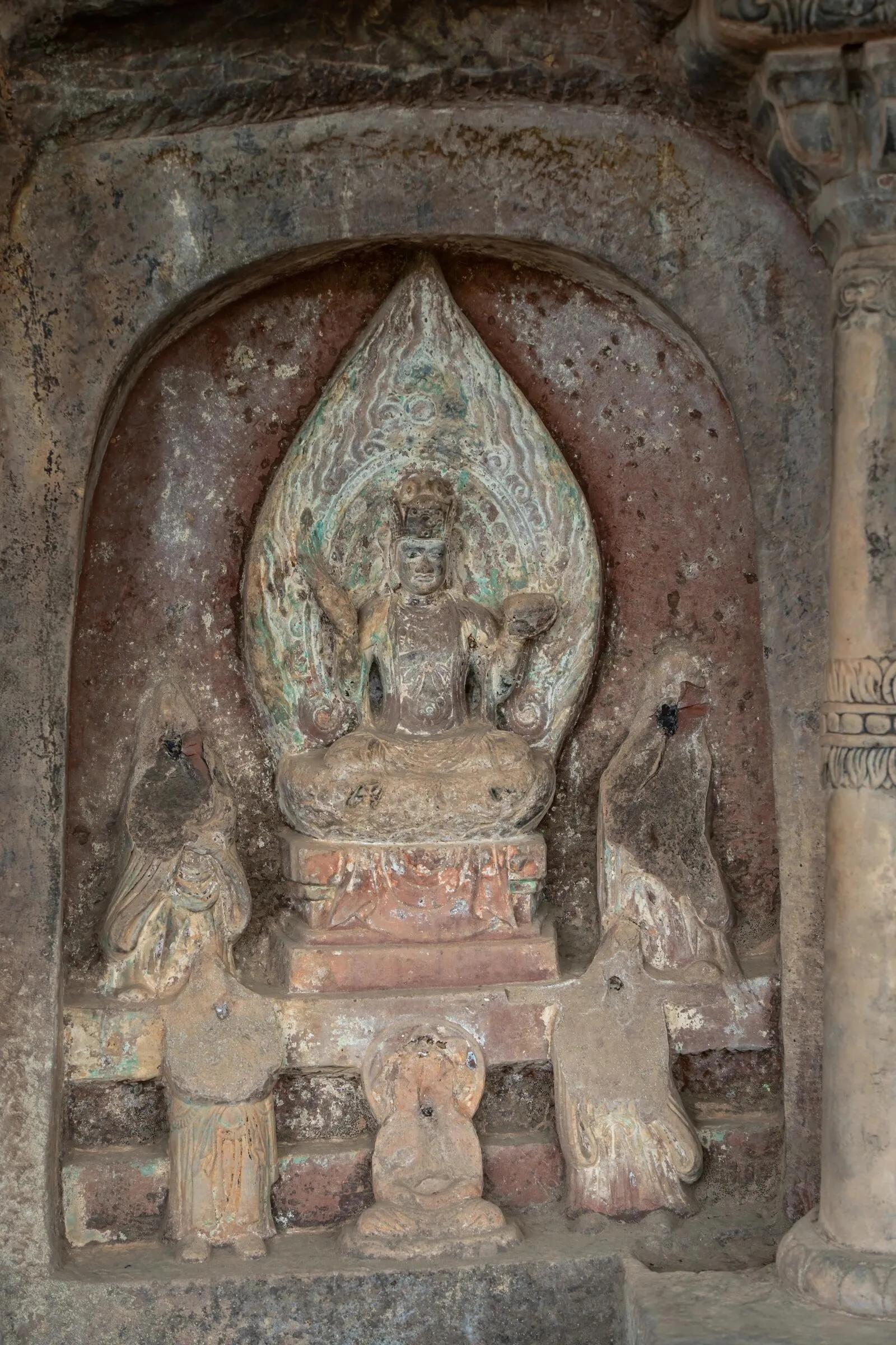 第5窟是维摩诘经变相。中间为维摩诘居士说法像,左右分别为观音菩萨和大势至菩萨,此窟造像布局严谨,雕刻细腻,展现了佛教居士弘法的独特场景。