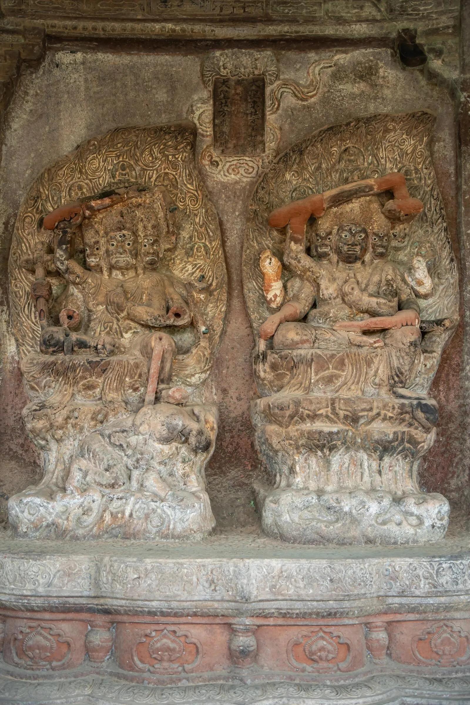 第3窟是地藏王菩萨造像。戴风帽,饰耳环、璎珞,着圆领通肩袈裟,跣足倚坐莲台之上。左手持摩尼宝珠,右手已毁。第4窟是华严三圣。主尊毗卢遮那佛跣足倚坐,两侧侍立文殊、普贤二菩萨及狮奴、象奴,浮雕与浅浮雕结合,线条圆润流畅,具有浓郁的唐宋艺术风格。