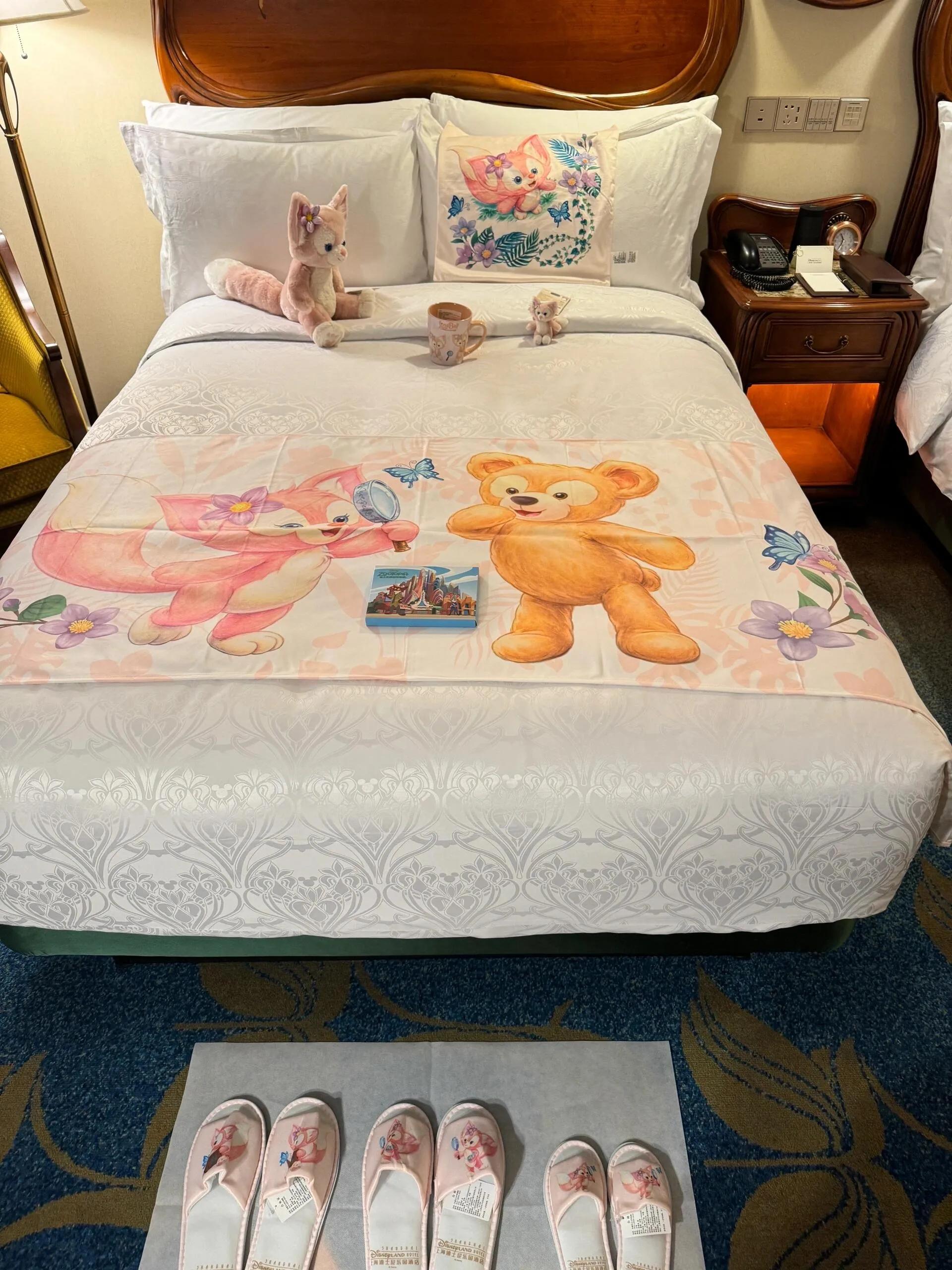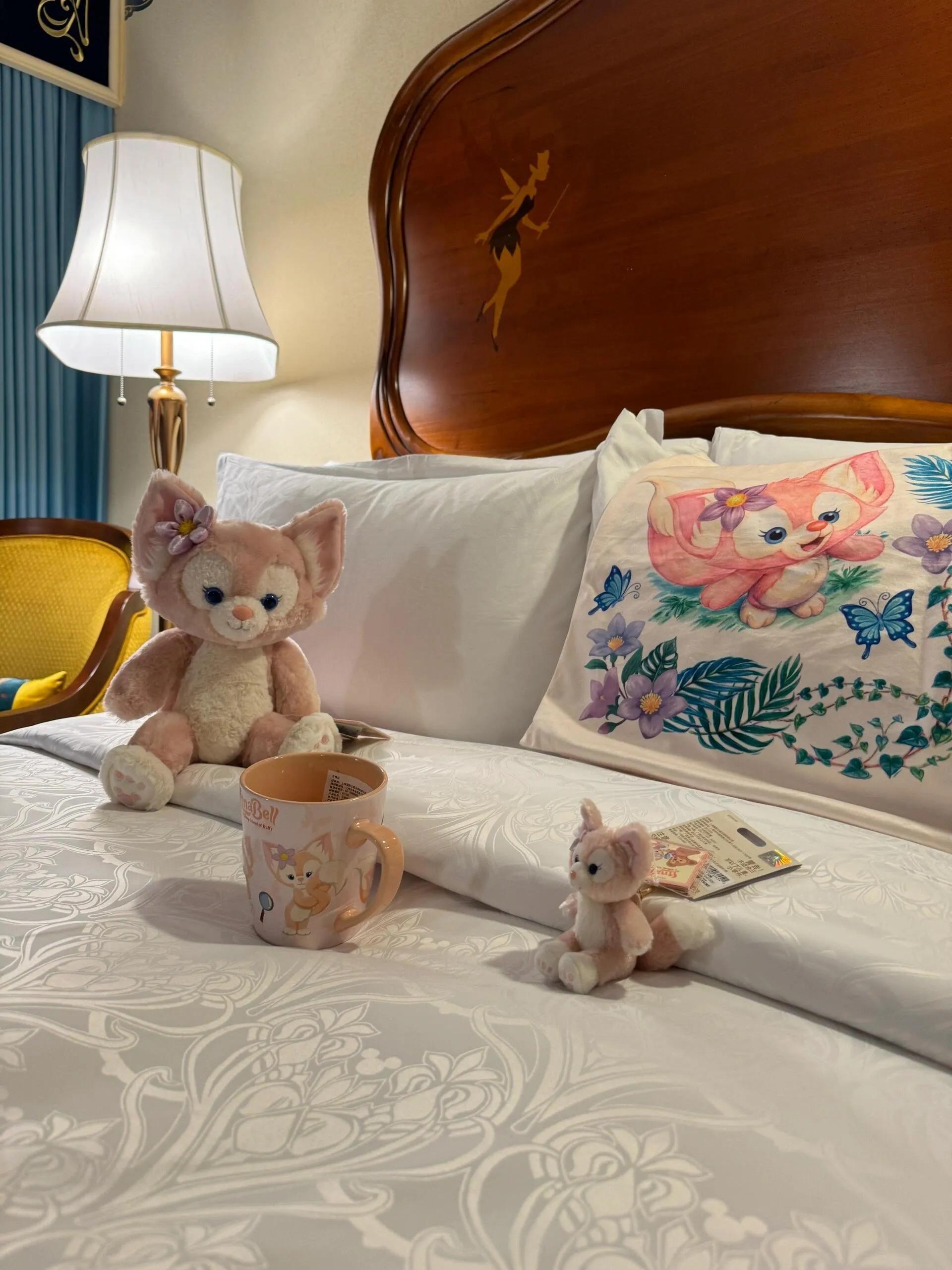 房间内的玲娜贝儿主题细节令人惊喜。床围、拖鞋、枕套、马克杯等用品都可以带走,酒店还会赠送一只贝儿钥匙圈和一只坐姿贝儿。想要拍出更好的照片效果,建议自带一些玩偶来搭配。