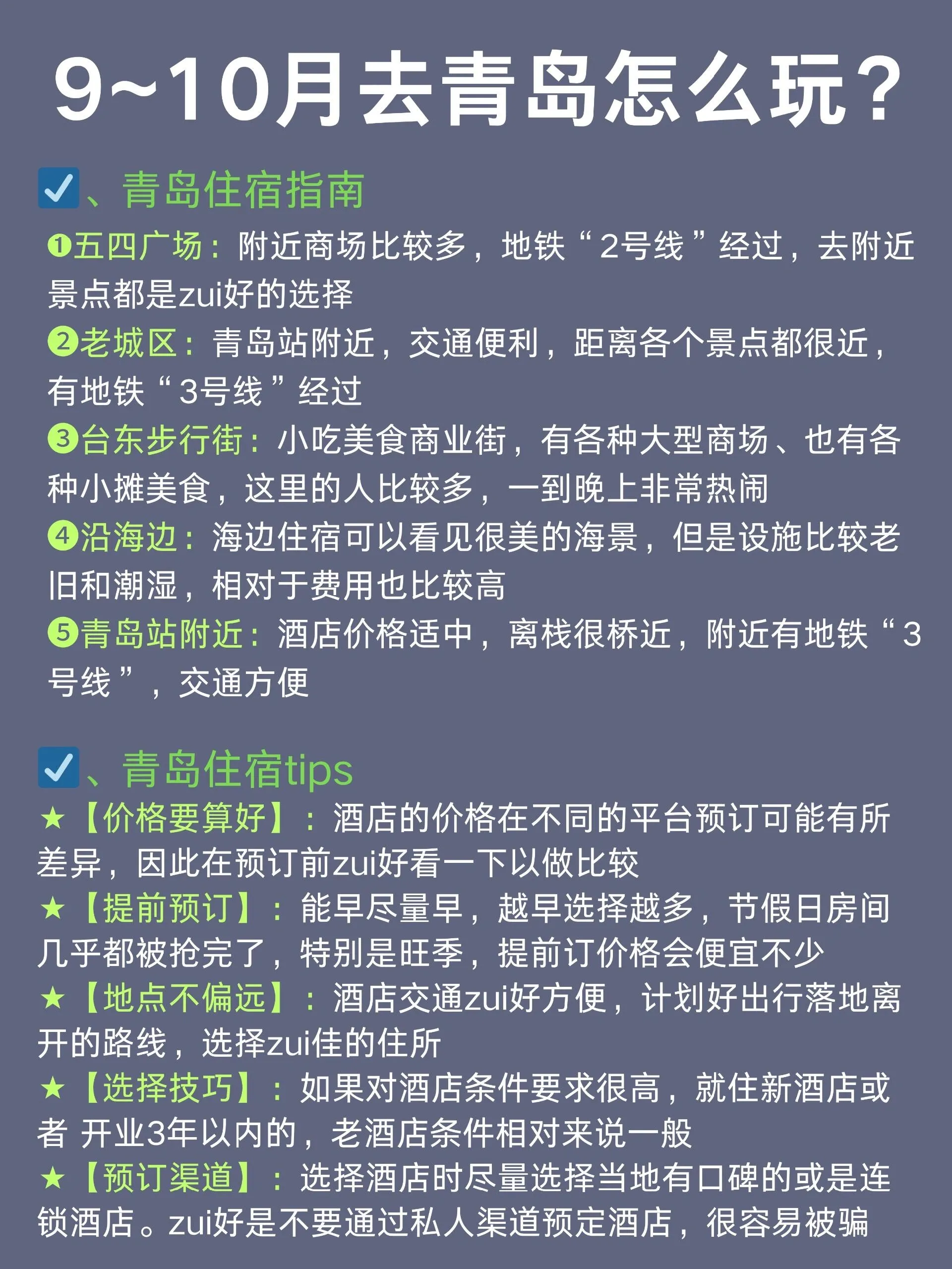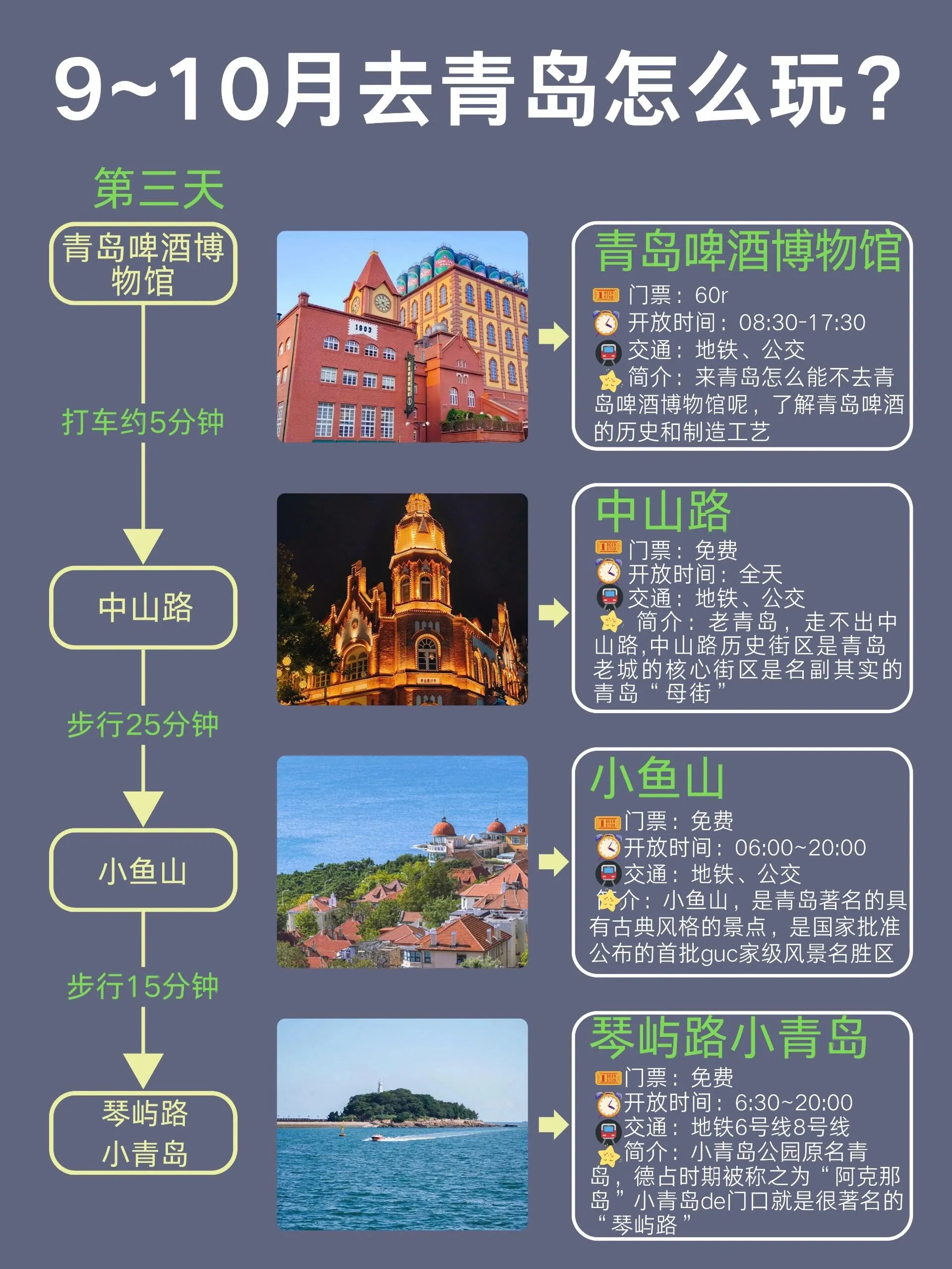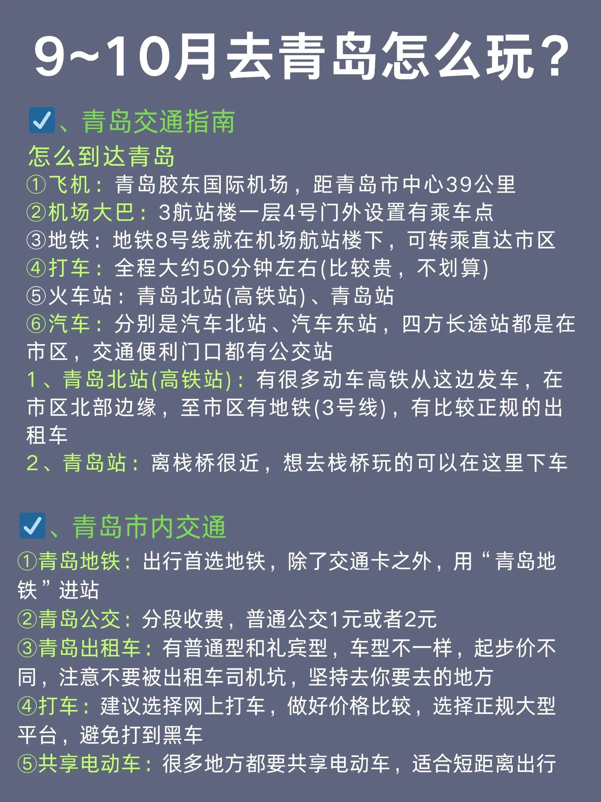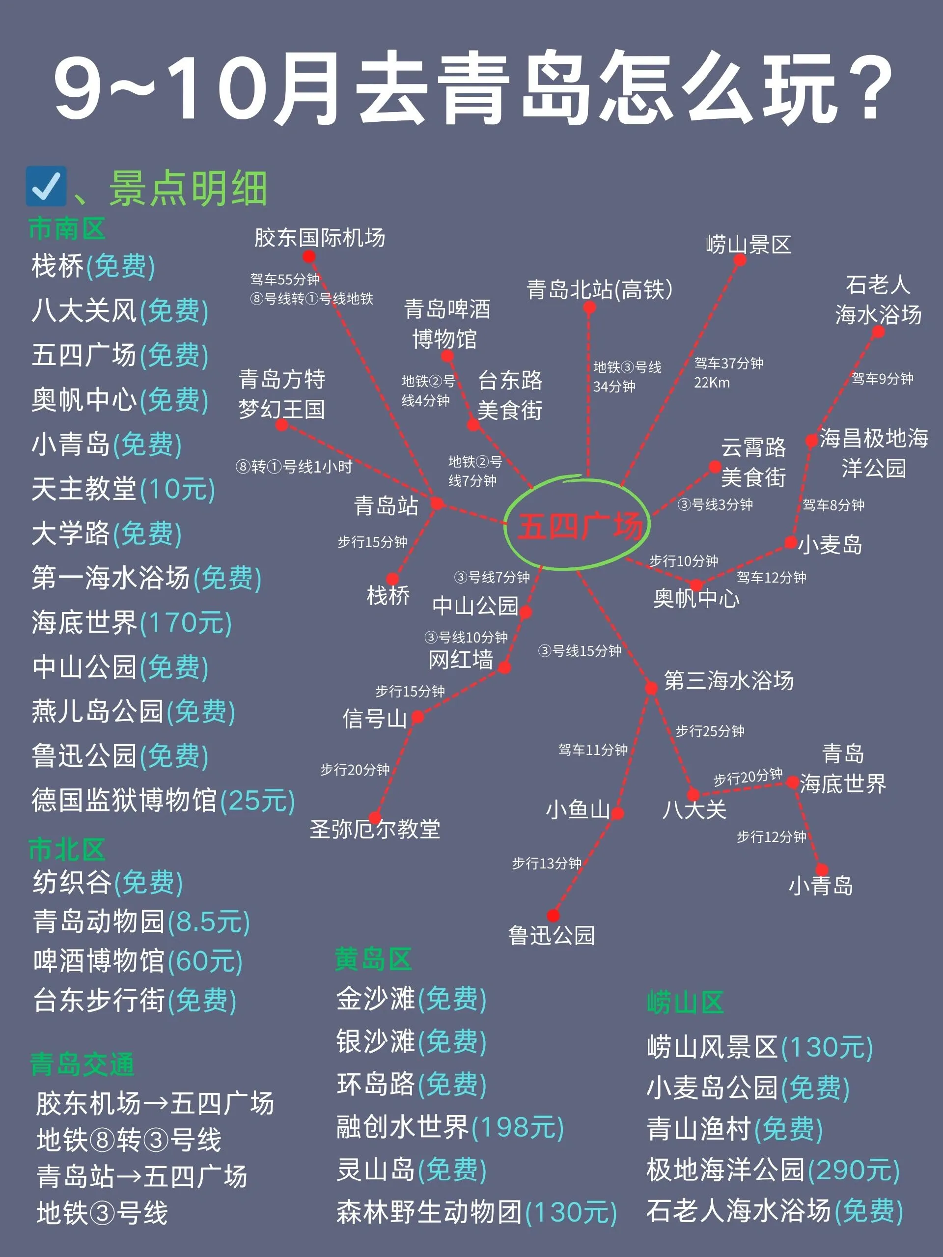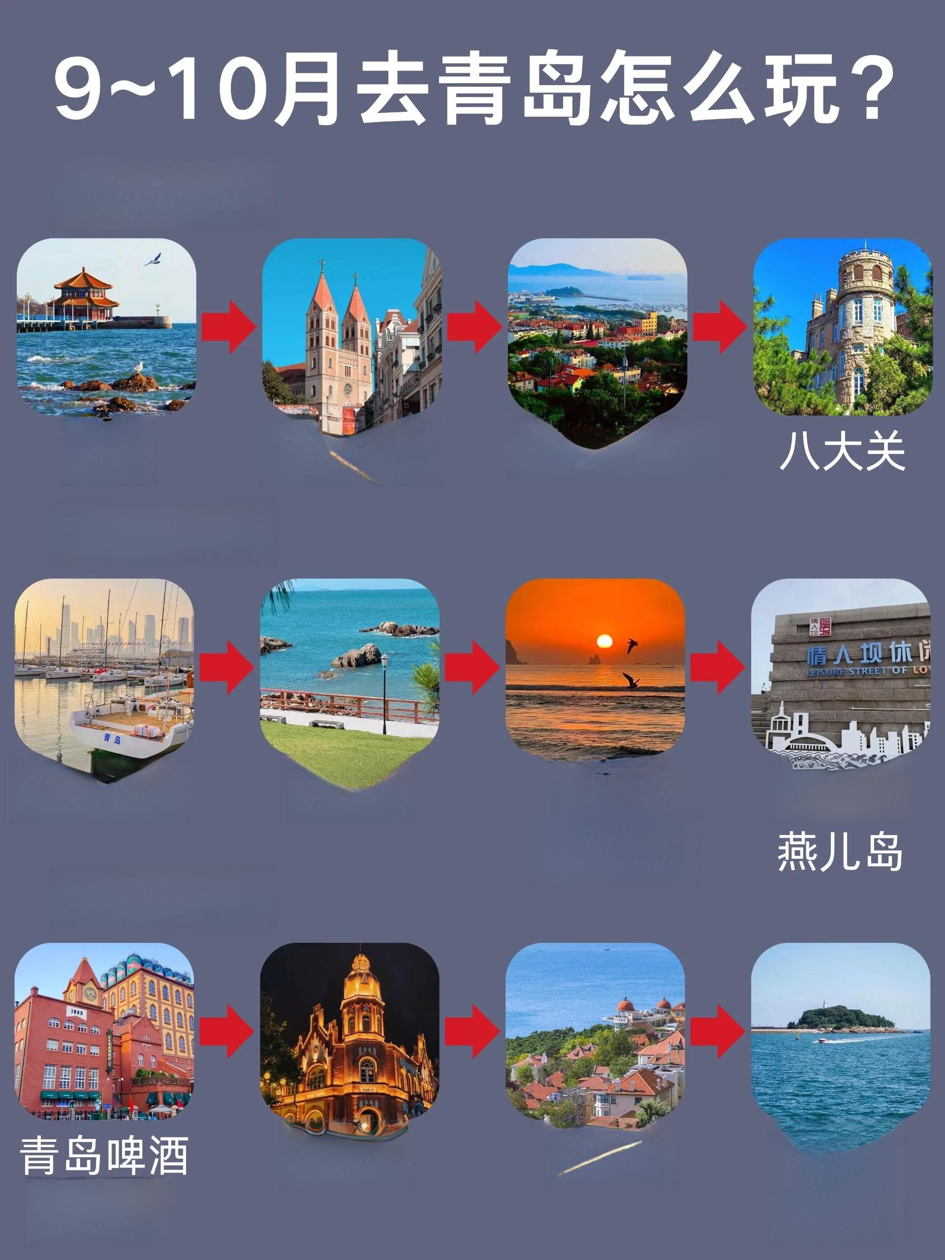 青岛是一座美丽的海滨城市,9-10月是非常适合旅游的季节。以下是一份详细的青岛旅游攻略,涵盖了交通、住宿、景点和美食等方面的信息。