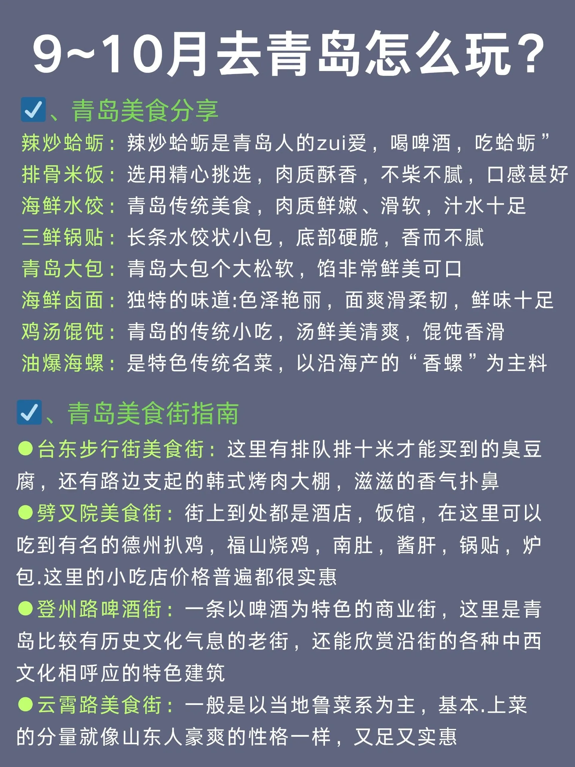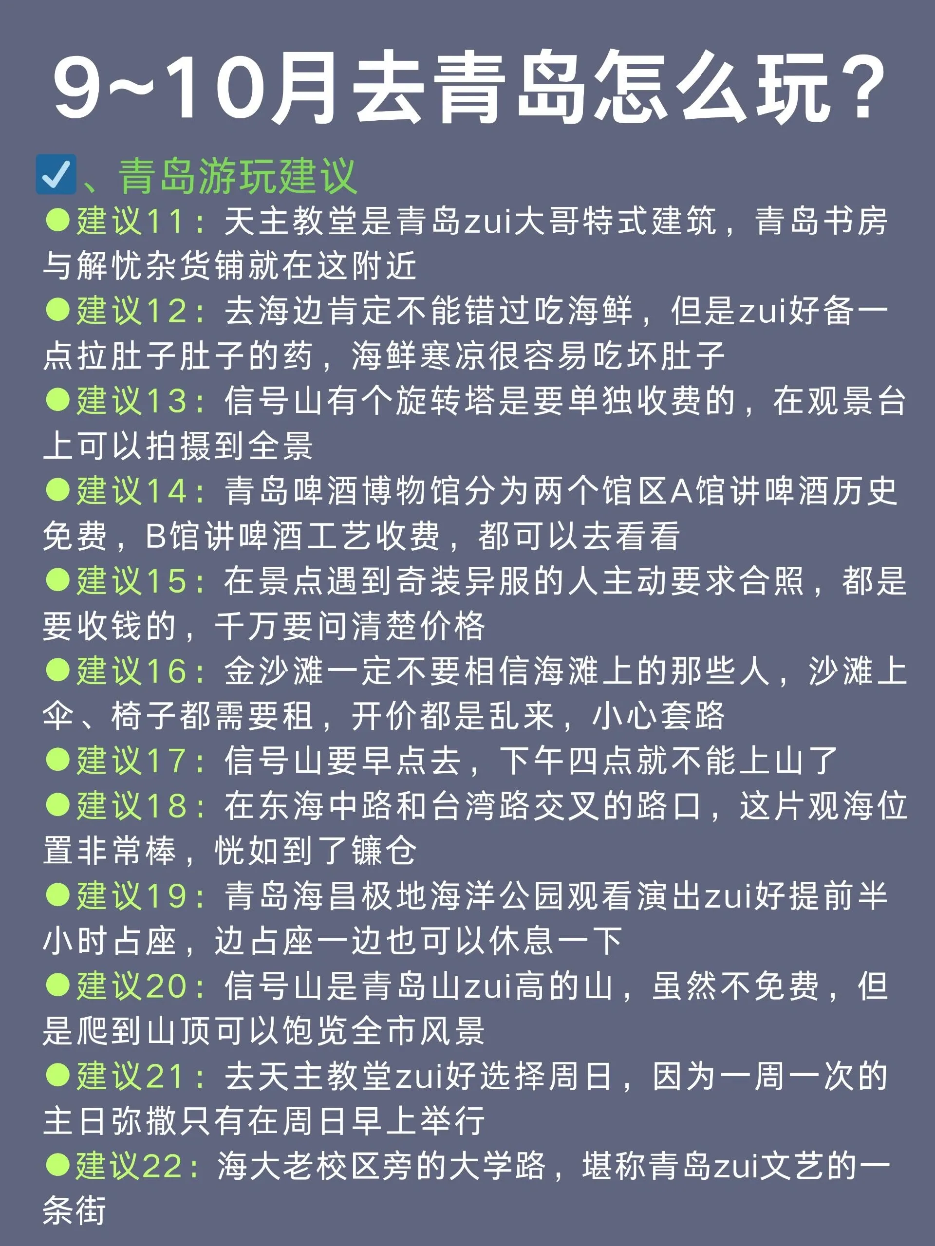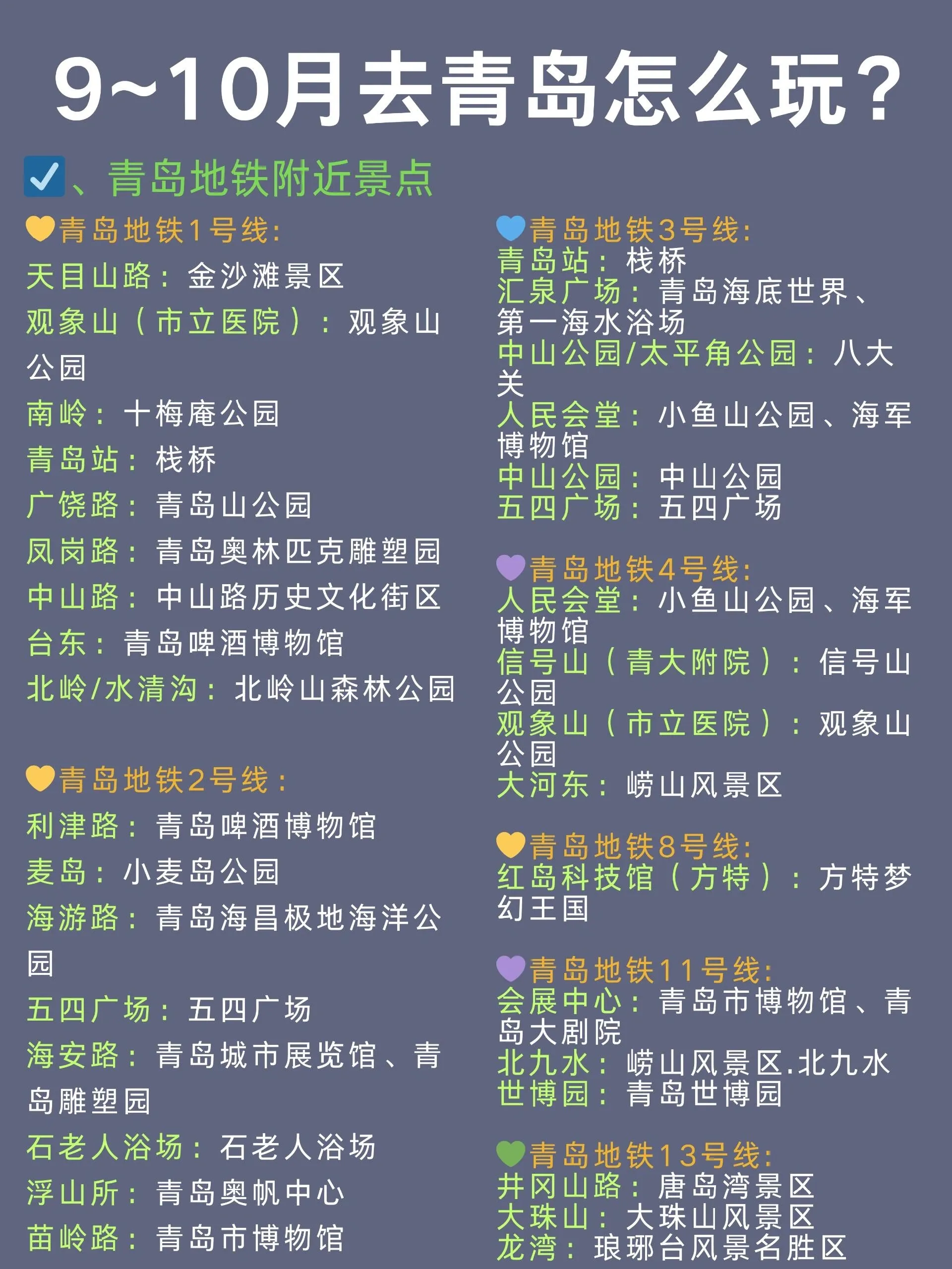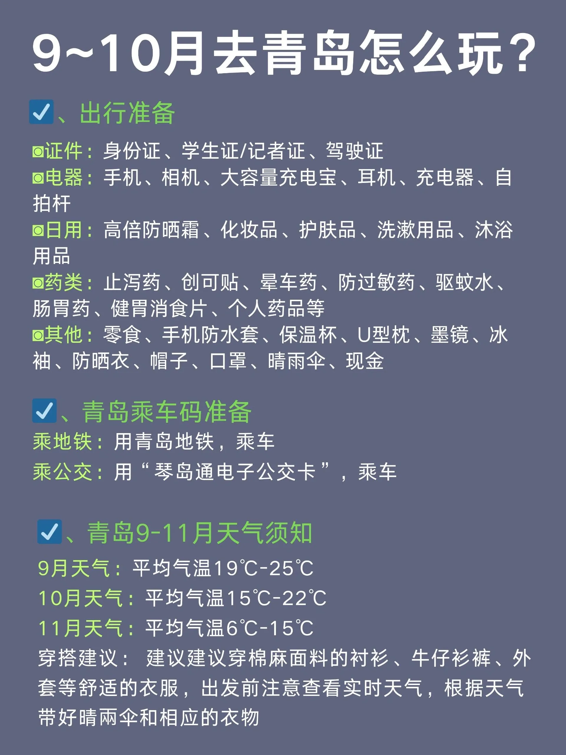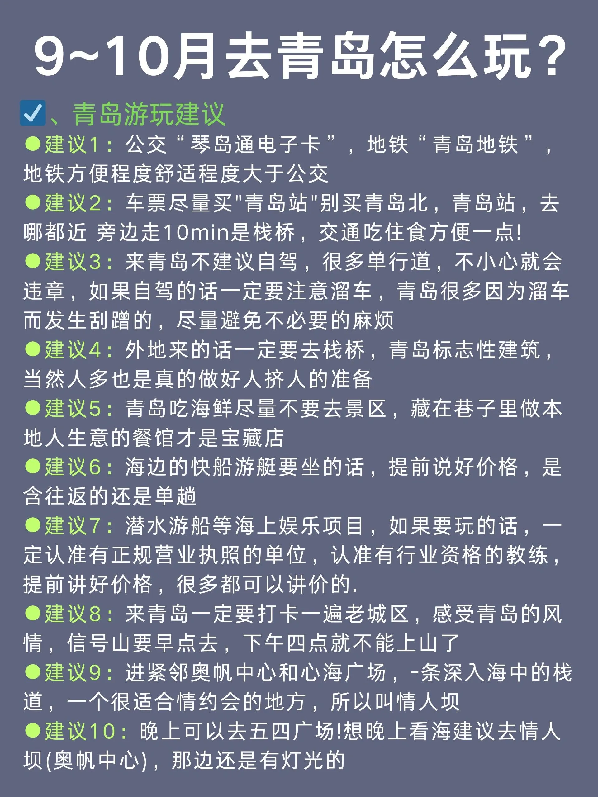 青岛是一座美丽的海滨城市,9-10月是非常适合旅游的季节。以下是一份详细的青岛旅游攻略,涵盖了交通、住宿、景点和美食等方面的信息。