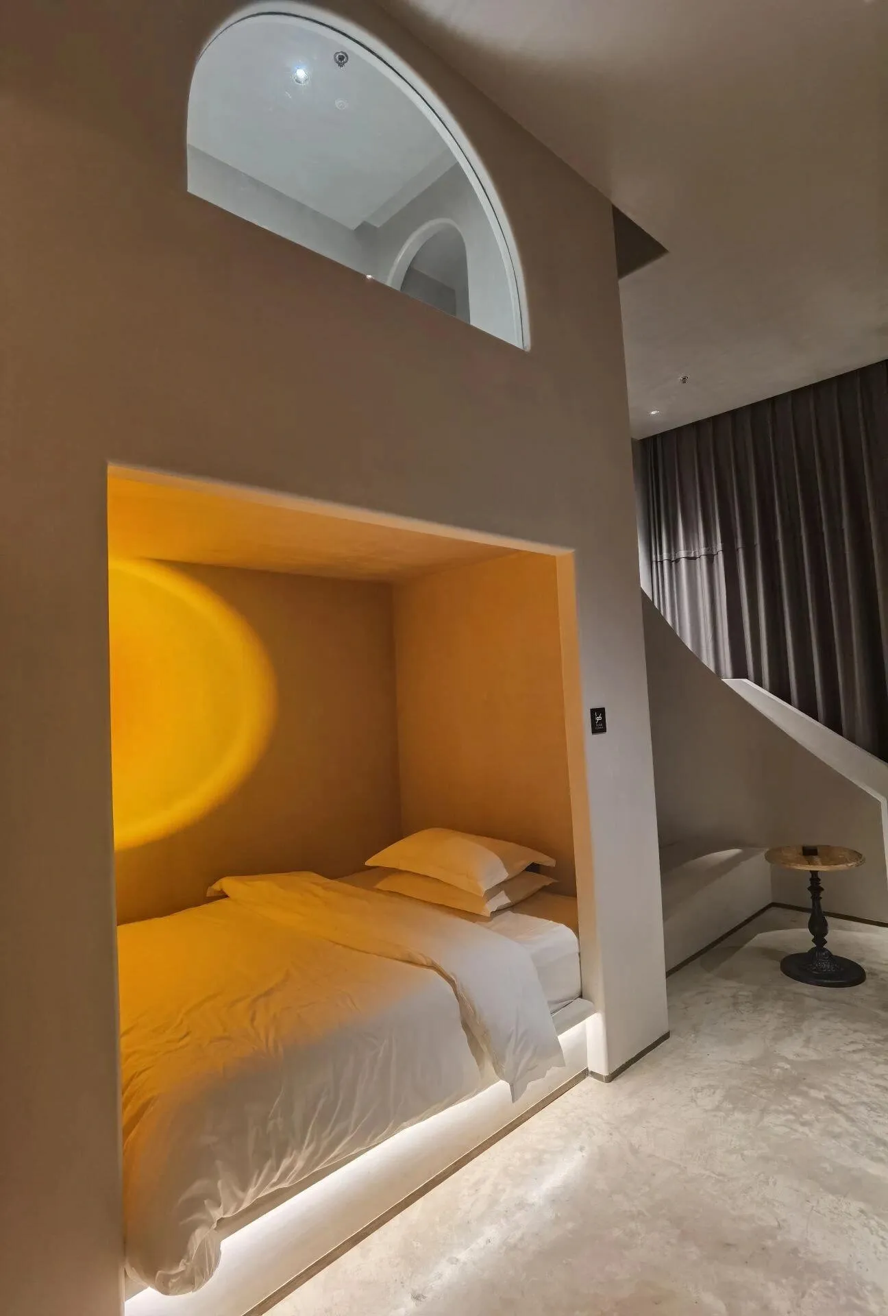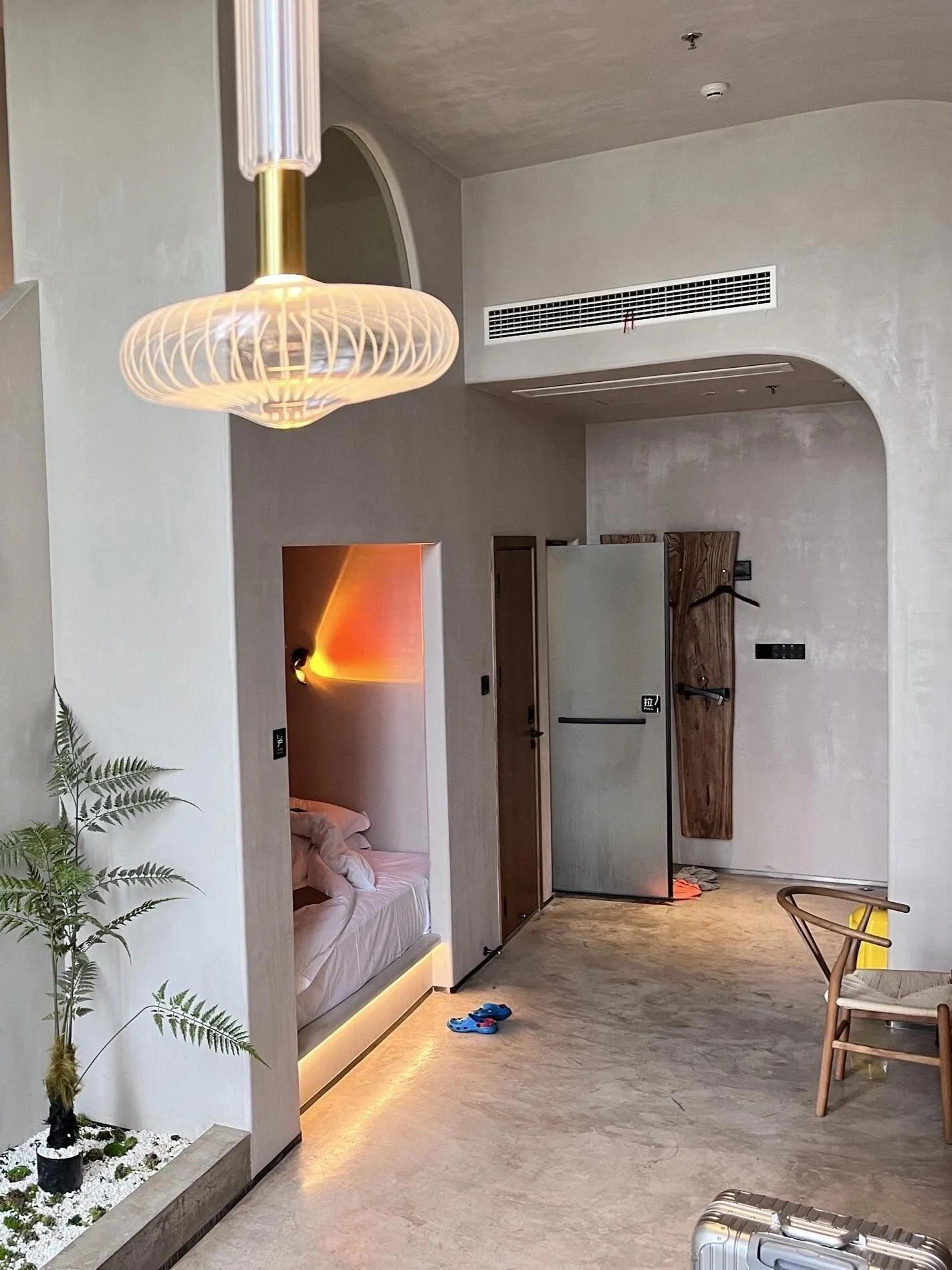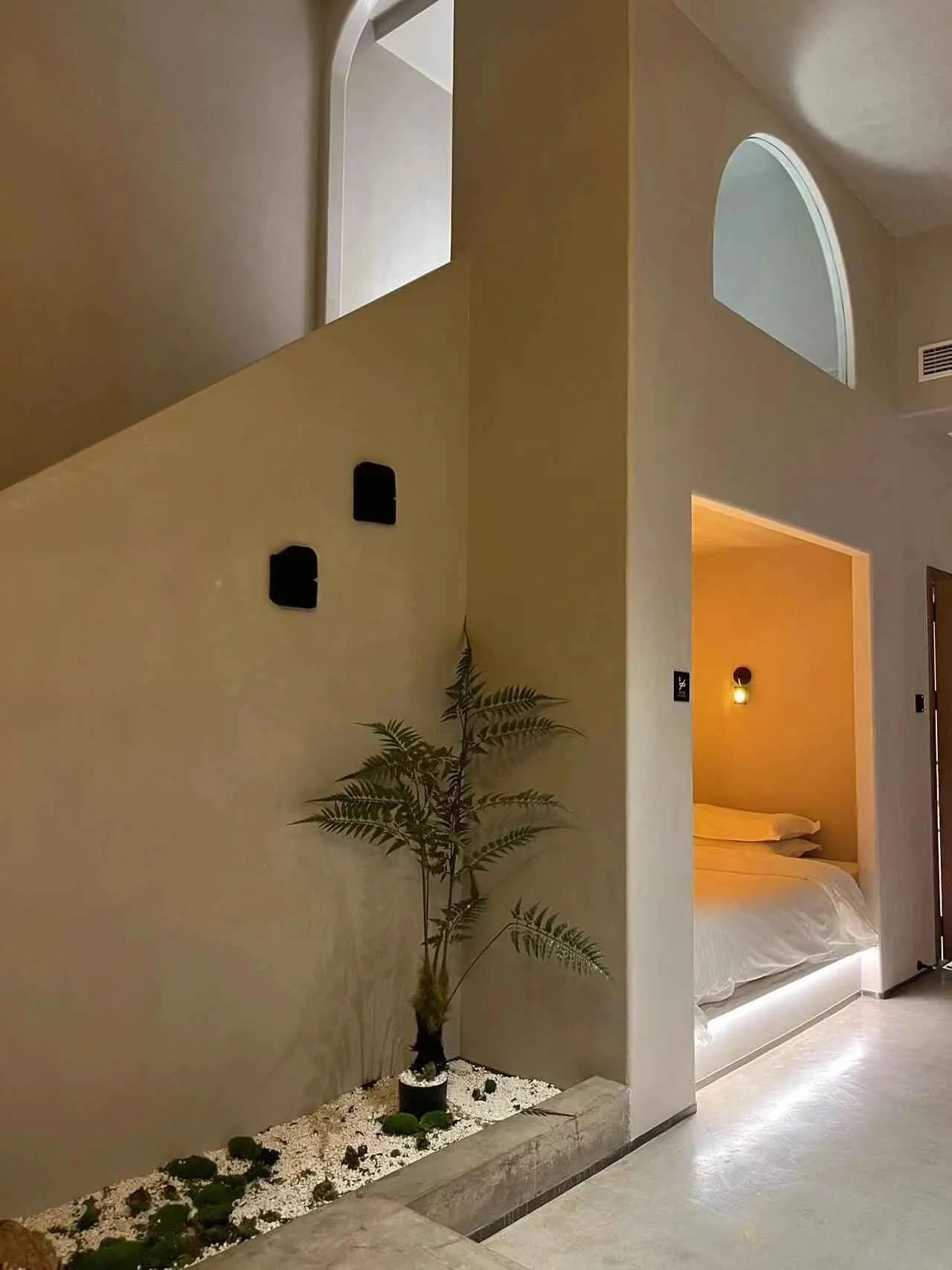酒店的设计感十足,采用诧寂风格 ,既现代又不失温馨。拱形门洞的设计随处可见,整体环境非常适合拍照,随手一拍就能得到ins风格的大片。