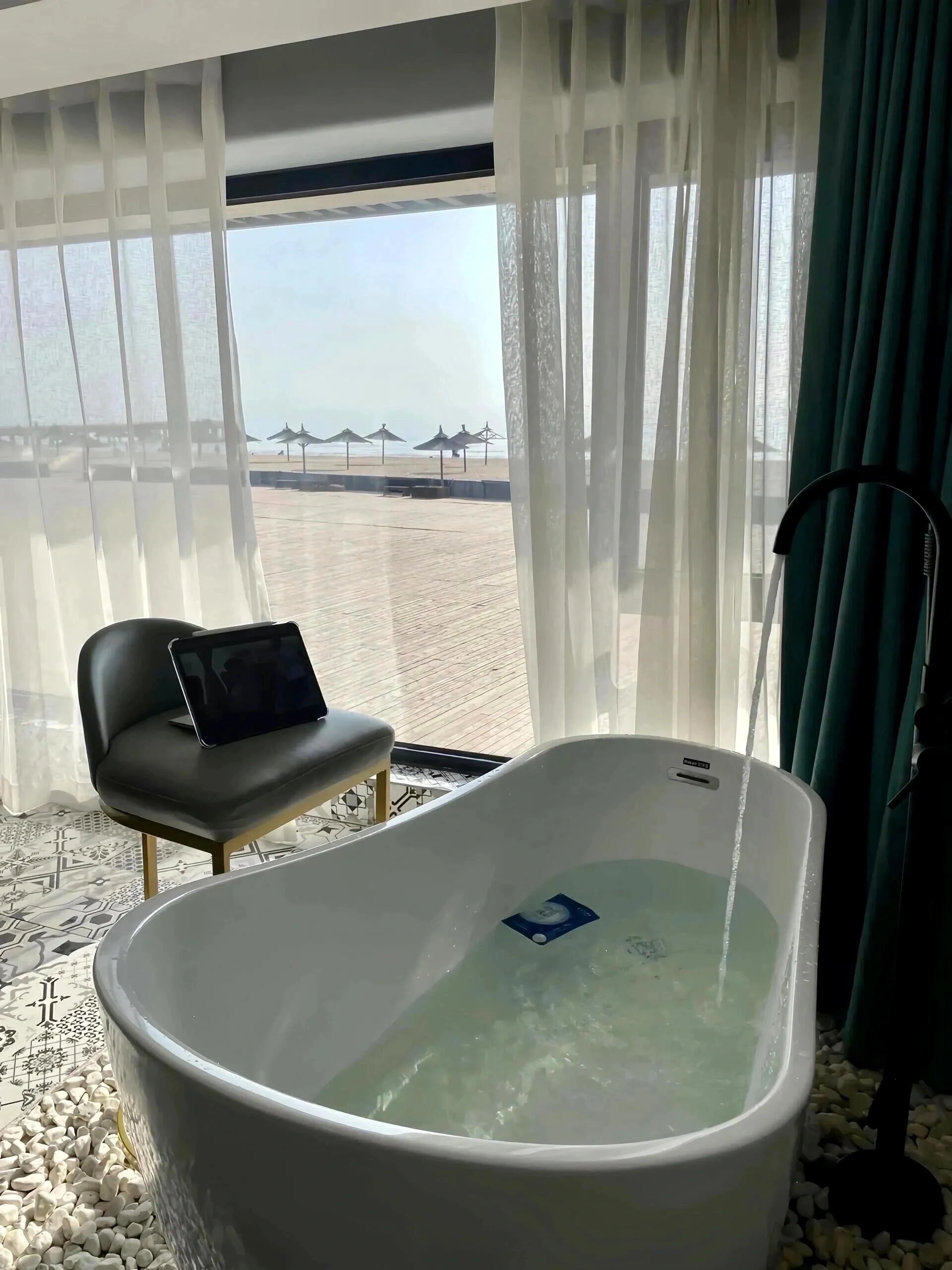 房间配有全景落地窗,清晨可以在窗边欣赏海上日出 ,金黄的阳光洒在海面上,美不胜收。 大浴缸就设在窗户旁边,泡澡时还能欣赏海景 。特别值得一提的是海景露台,傍晚在上面用餐,一边吃饭一边欣赏海景,体验极佳。