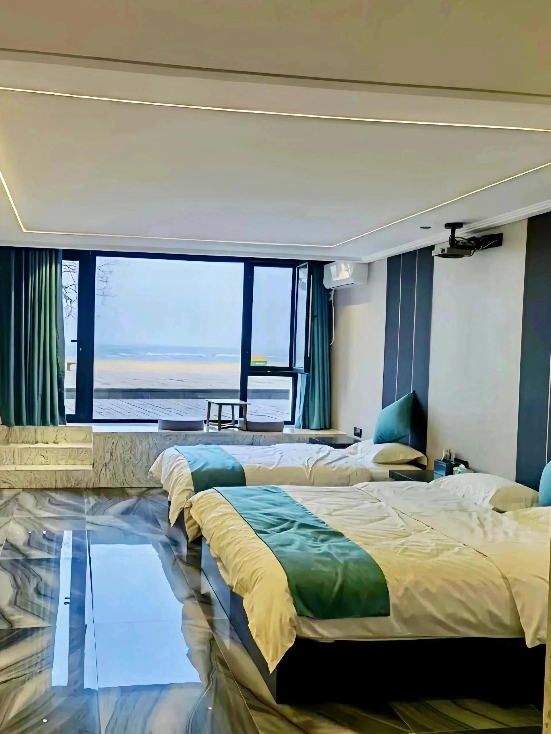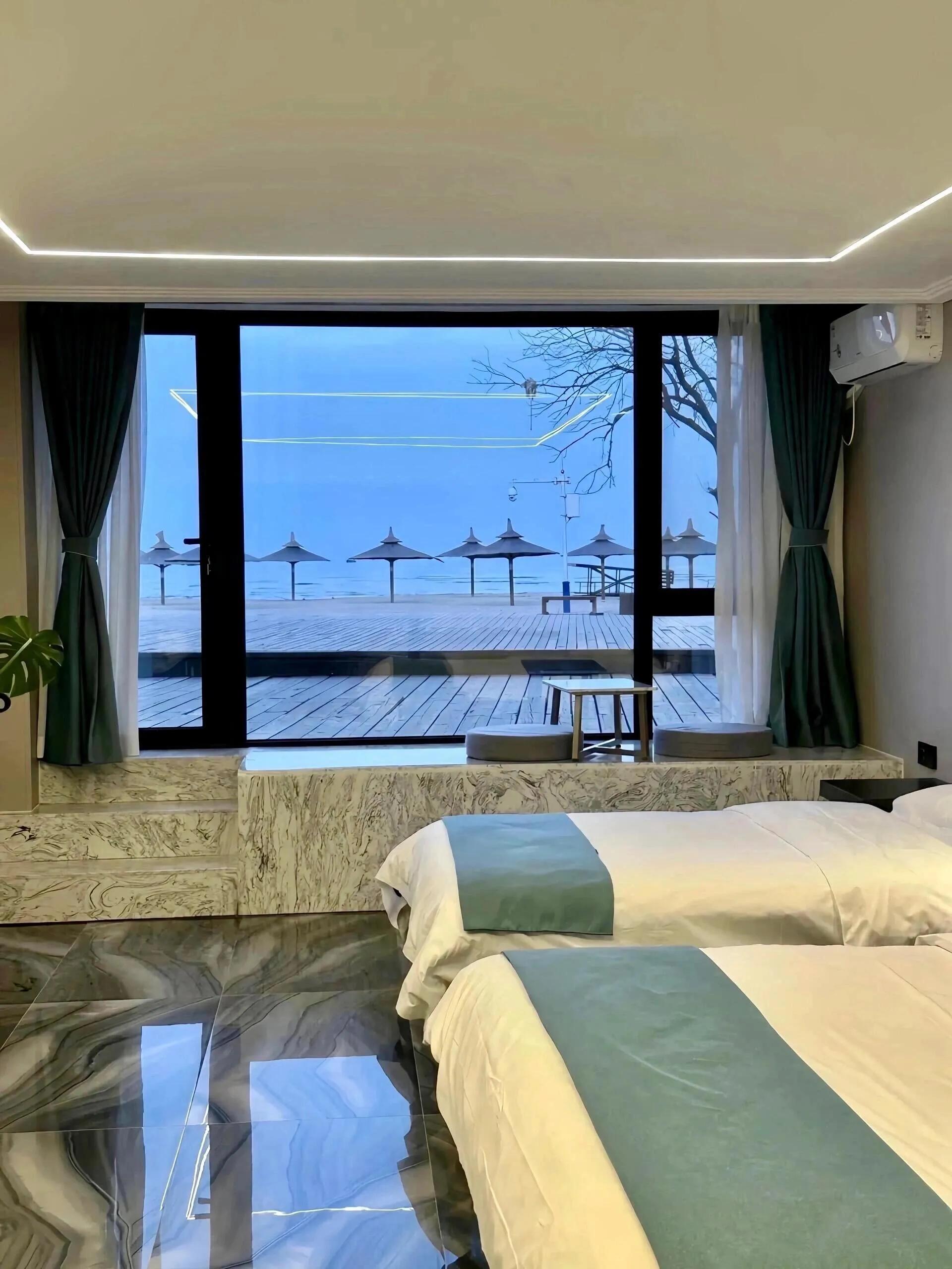 这家民宿是真正的临海酒店,海景绝美。从酒店出发,步行5分钟就能到达观赏日出的绝佳位置。秦皇岛野生动物园就在酒店附近,步行即可到达。往南走则是北戴河湿地和鸽子窝公园,地理位置十分便利。