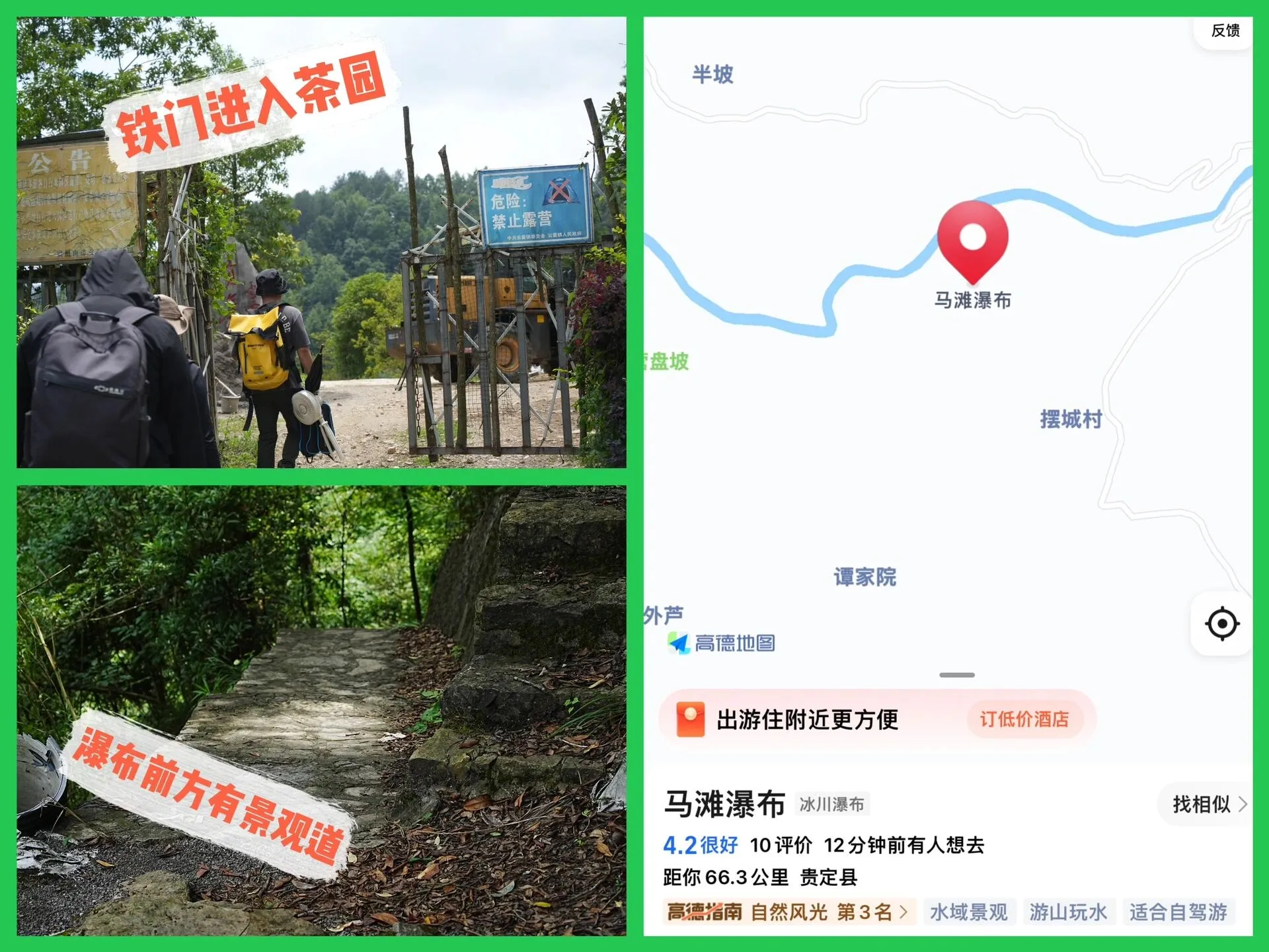 马滩瀑布位于贵州黔南贵定。 导航“马滩瀑布”即可到达。车辆可停在路边,从铁门进入茶园,步行十几分钟下坡路就能到达目的地。路况良好,甚至有景观楼梯,老少皆宜。