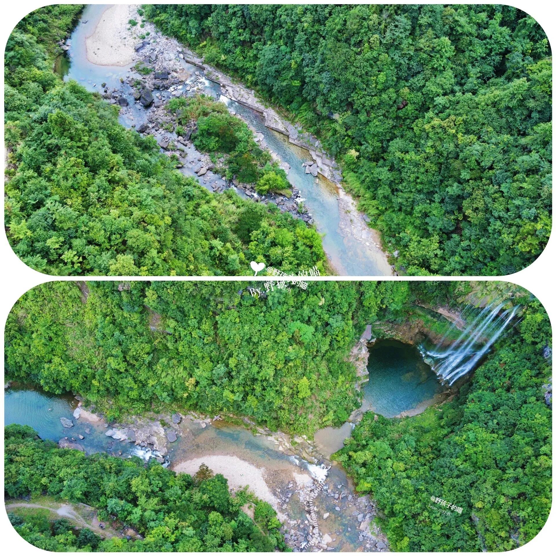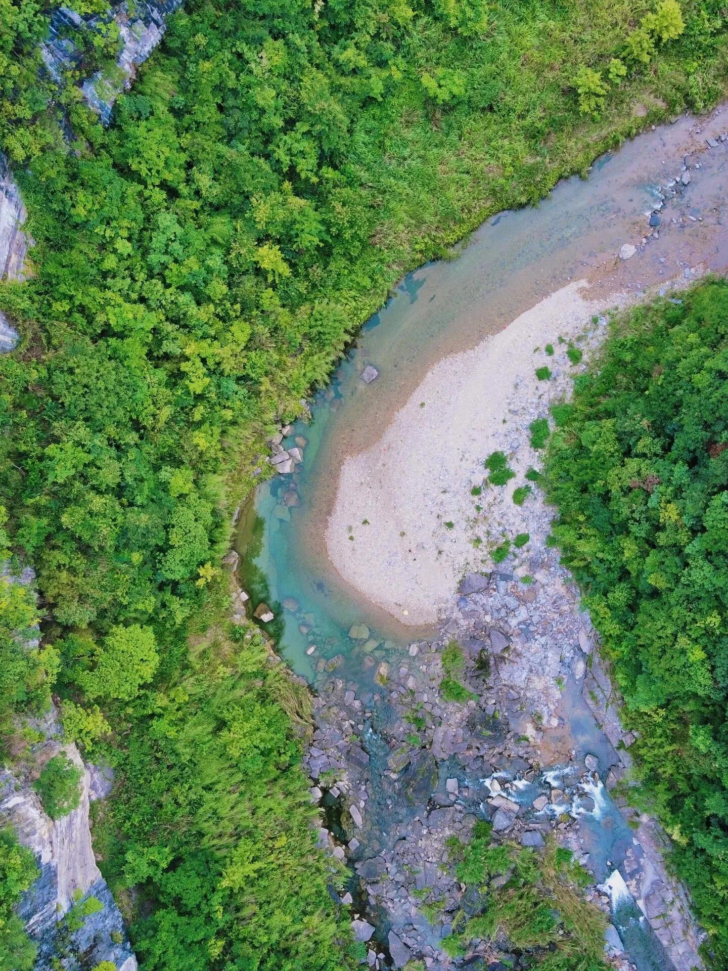 这里不仅有瀑布,它只是某条支流的馈赠。 茶山之下的主干河流水质清澈,从无人机视角可以发现许多浅滩和适合畅游的水域,实在令人喜欢。