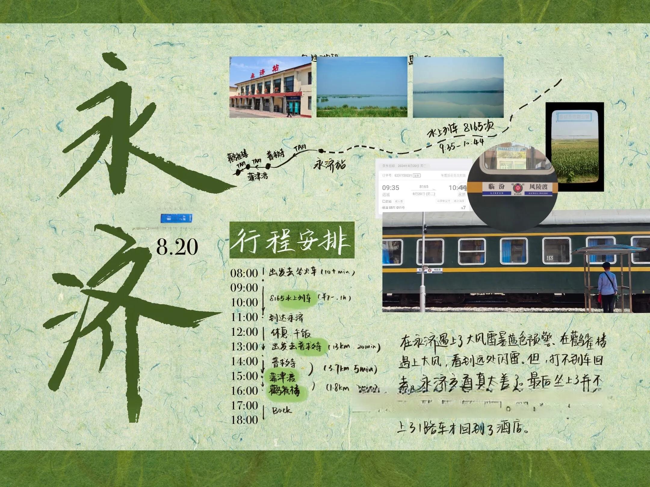 永济是一个值得探索的小城 ,虽然交通不太便利,但仍有几处值得一看的景点。从运城出发乘坐绿皮火车前往永济,途中可以体验著名的水上列车,尤其在暑假期间颇受欢迎。