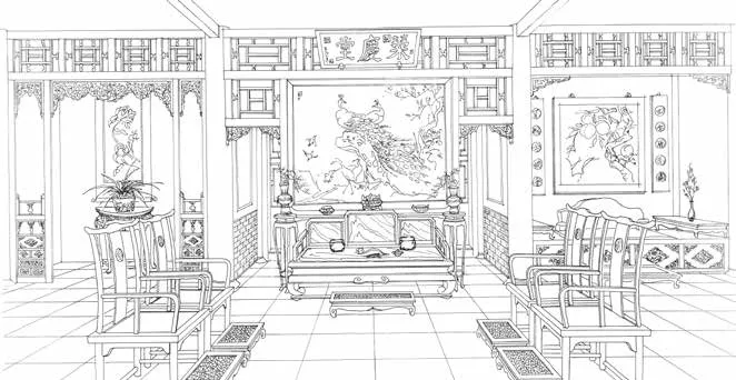 贾母上房应是面阔五间,中间是三开间的明间,一般作为宴饮接待的客厅,次间、梢间则是休息场所。