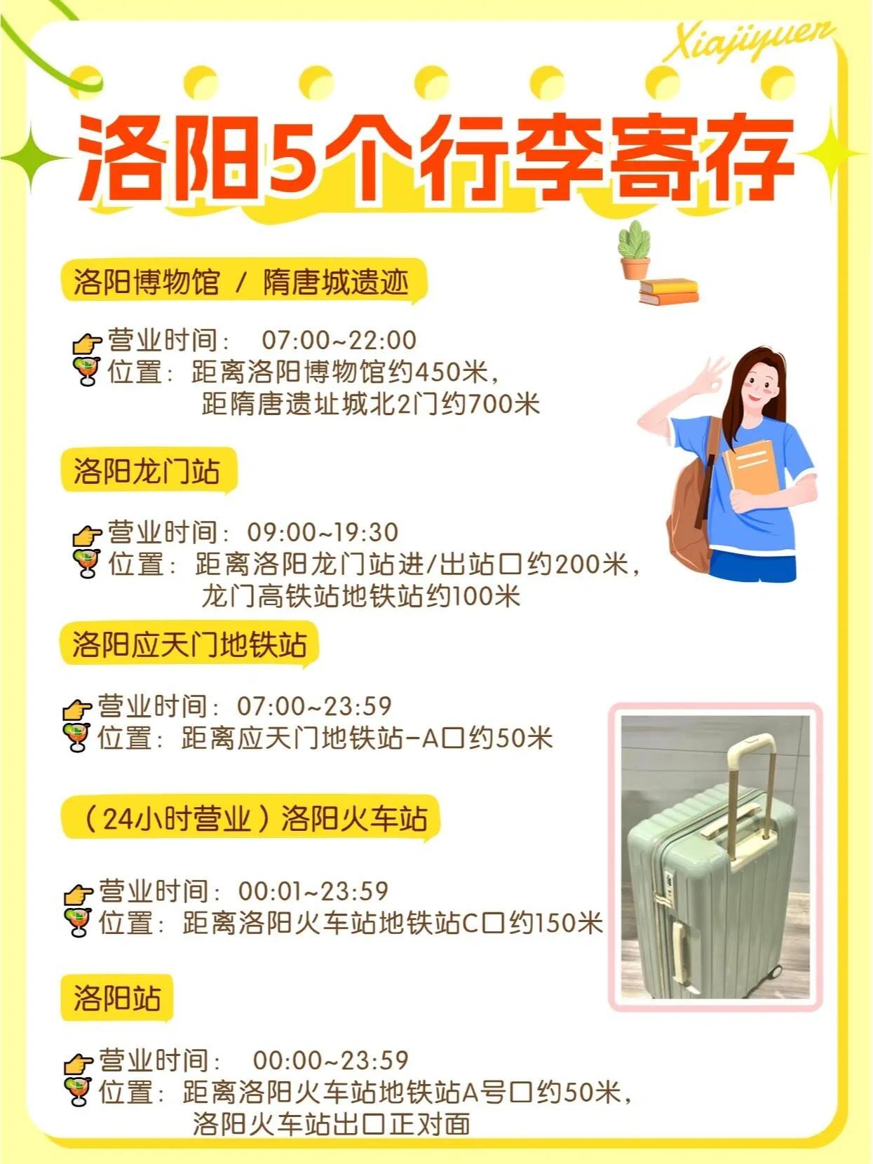 洛阳是一座历史悠久的古都,拥有众多景点和美食。对于游客来说,合理安排行程和行李寄存是旅行中的重要环节。以下是洛阳几个主要地点的行李寄存点信息: