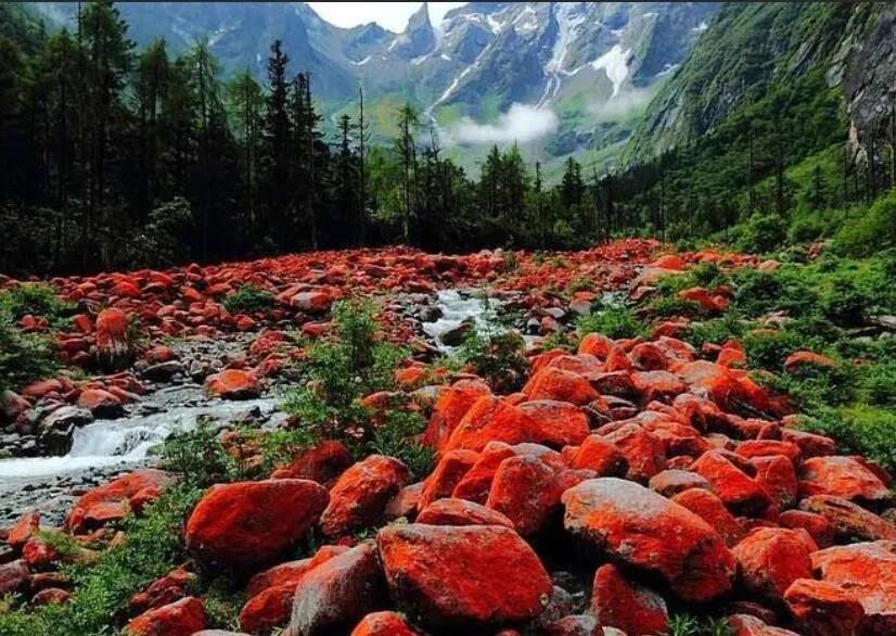 凉台沟最吸引人的景点是红石滩 ,这里有距成都最近的红石滩。在溪流间、山坡上、灌木丛中,遍布众多表面呈红色的石头。这些石头表面的红色物质实际上是一种藻类,在适宜的湿度、温度和气候条件下,会在岩石表面自然生长。大约四五年后自然死亡,然后再生,如此循环往复。