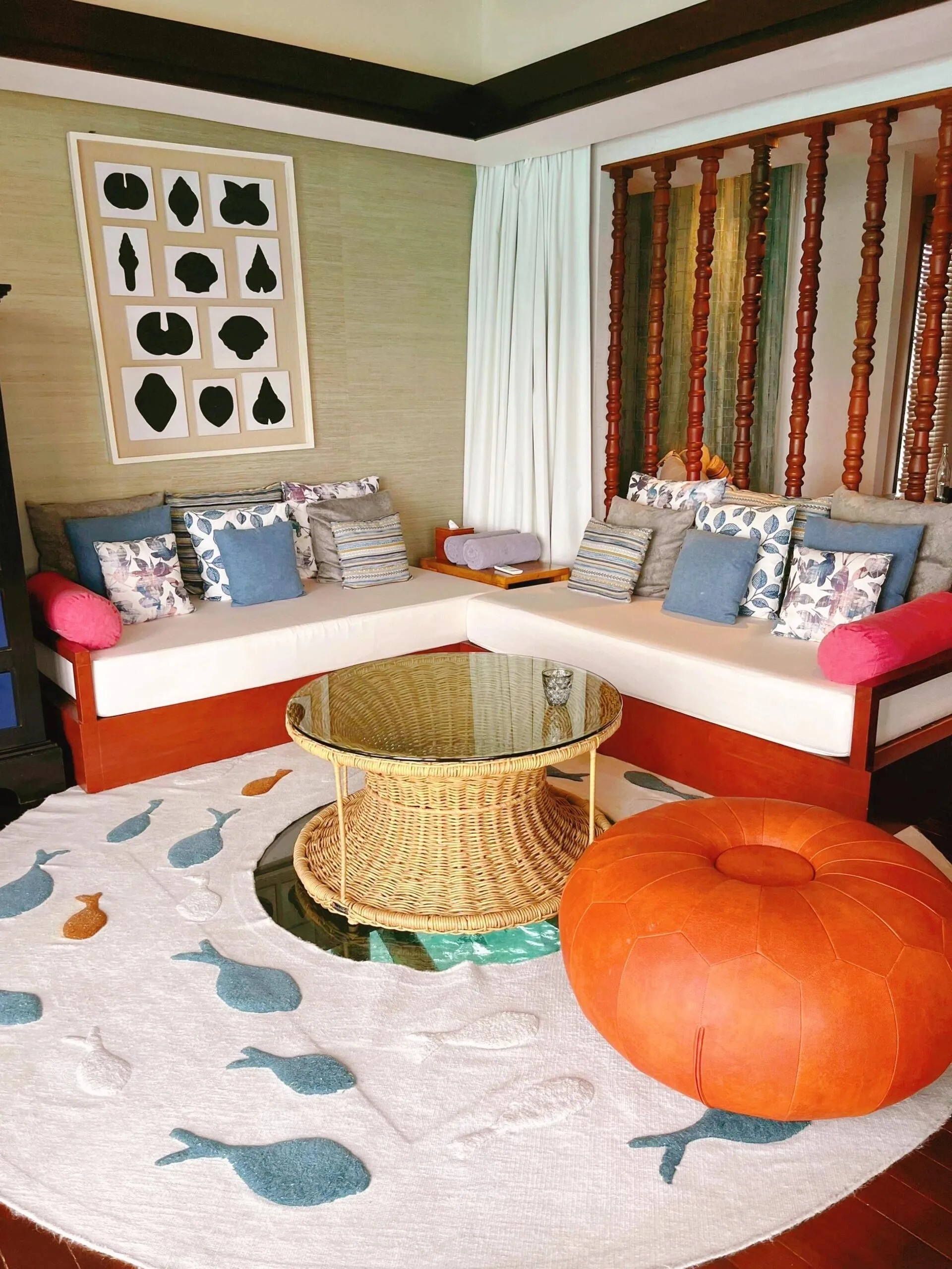 别墅内部的一些设计细节也很有趣,比如有一个小桌子,中间可以透过玻璃看到屋底下的海。