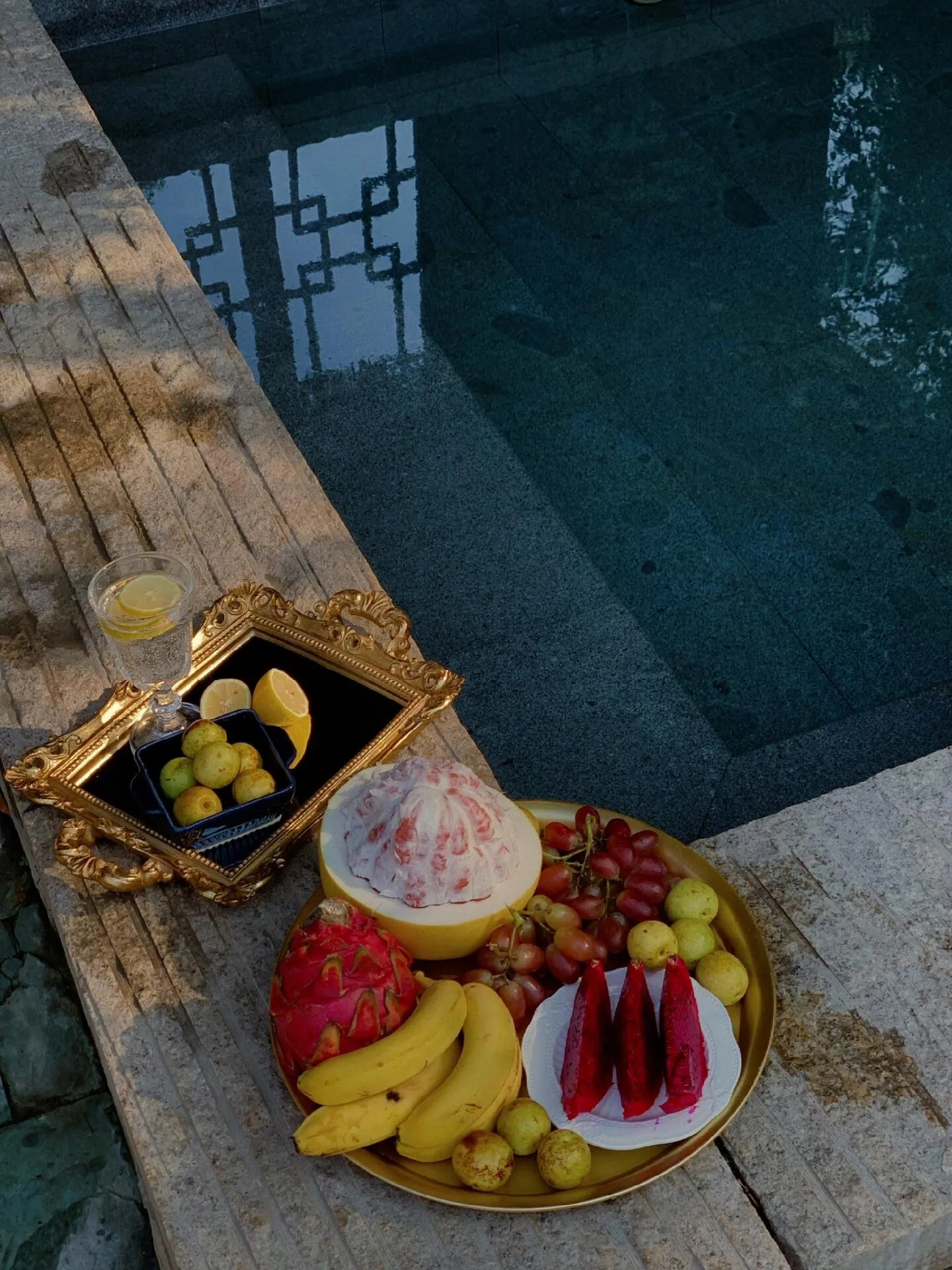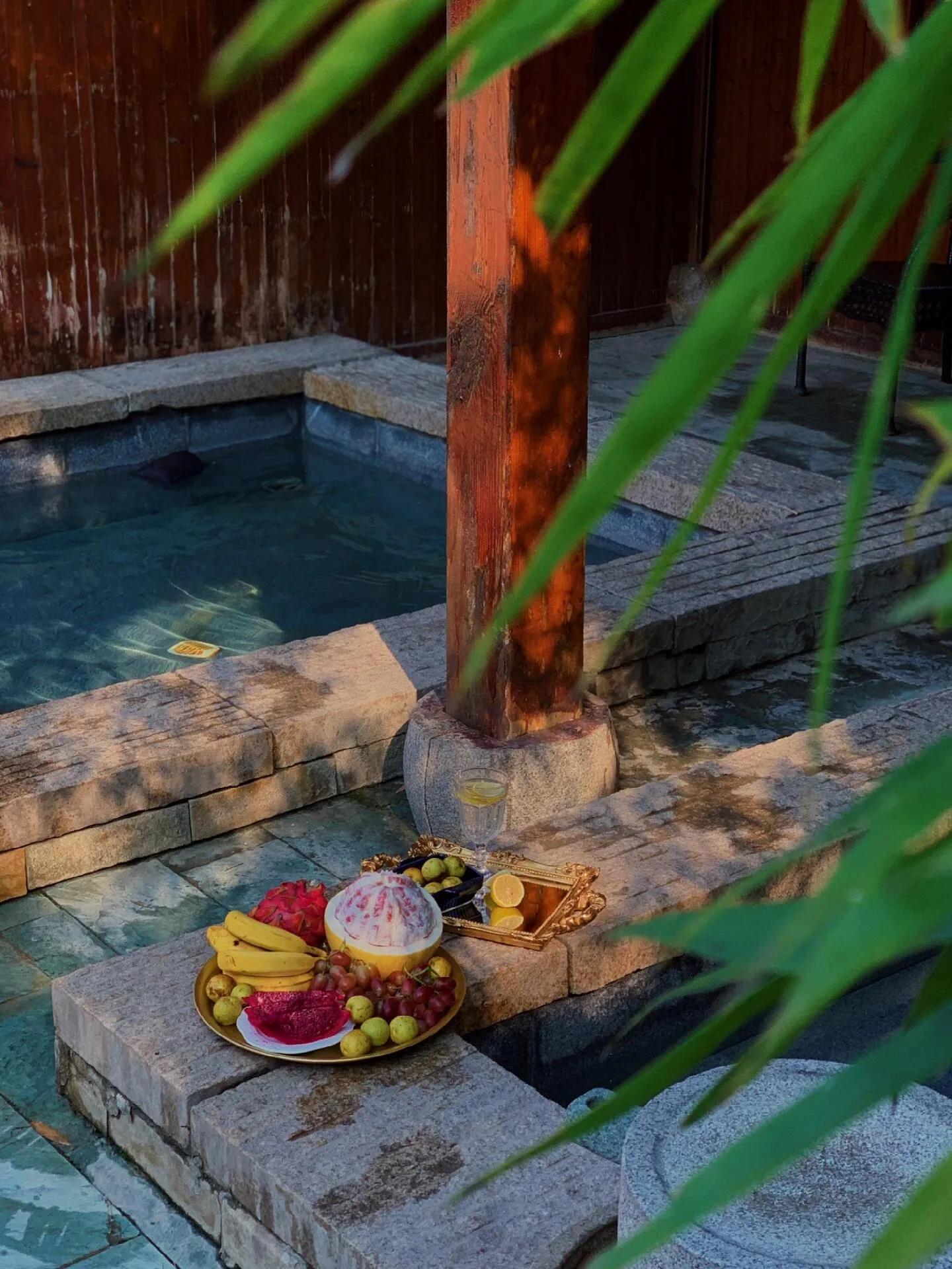 我选择泡的是中式风格的池子。中式屋檐、竹林、天然石块堆砌,营造出一种在山谷里泡温泉的感觉,很有意境。除此之外,还有许多别具风格的小池子,大大小小加起来将近100个。