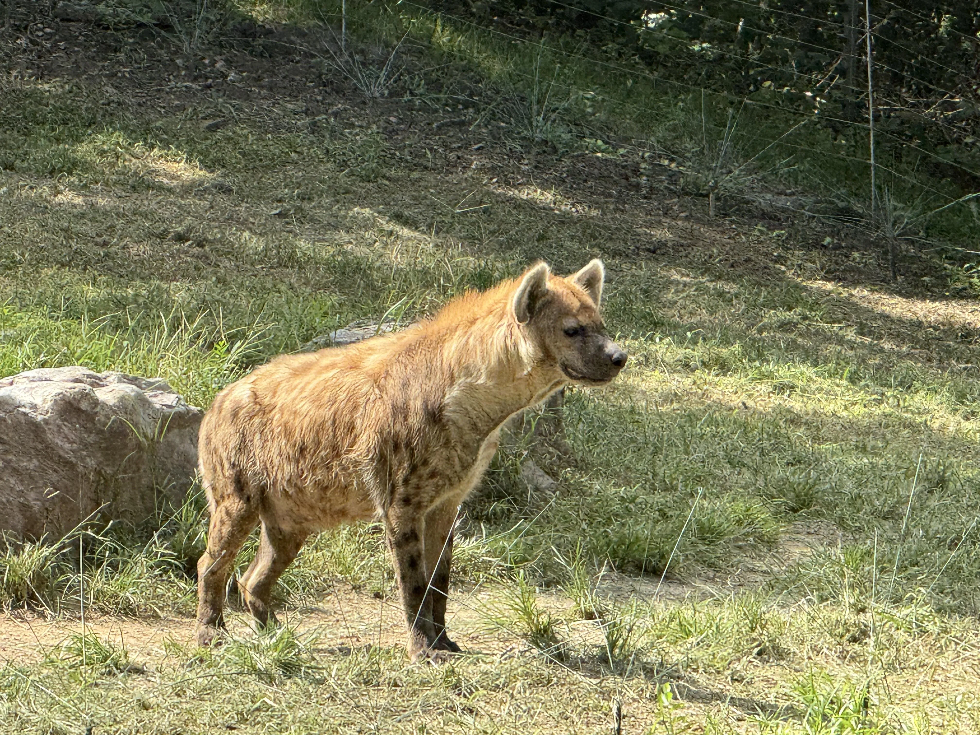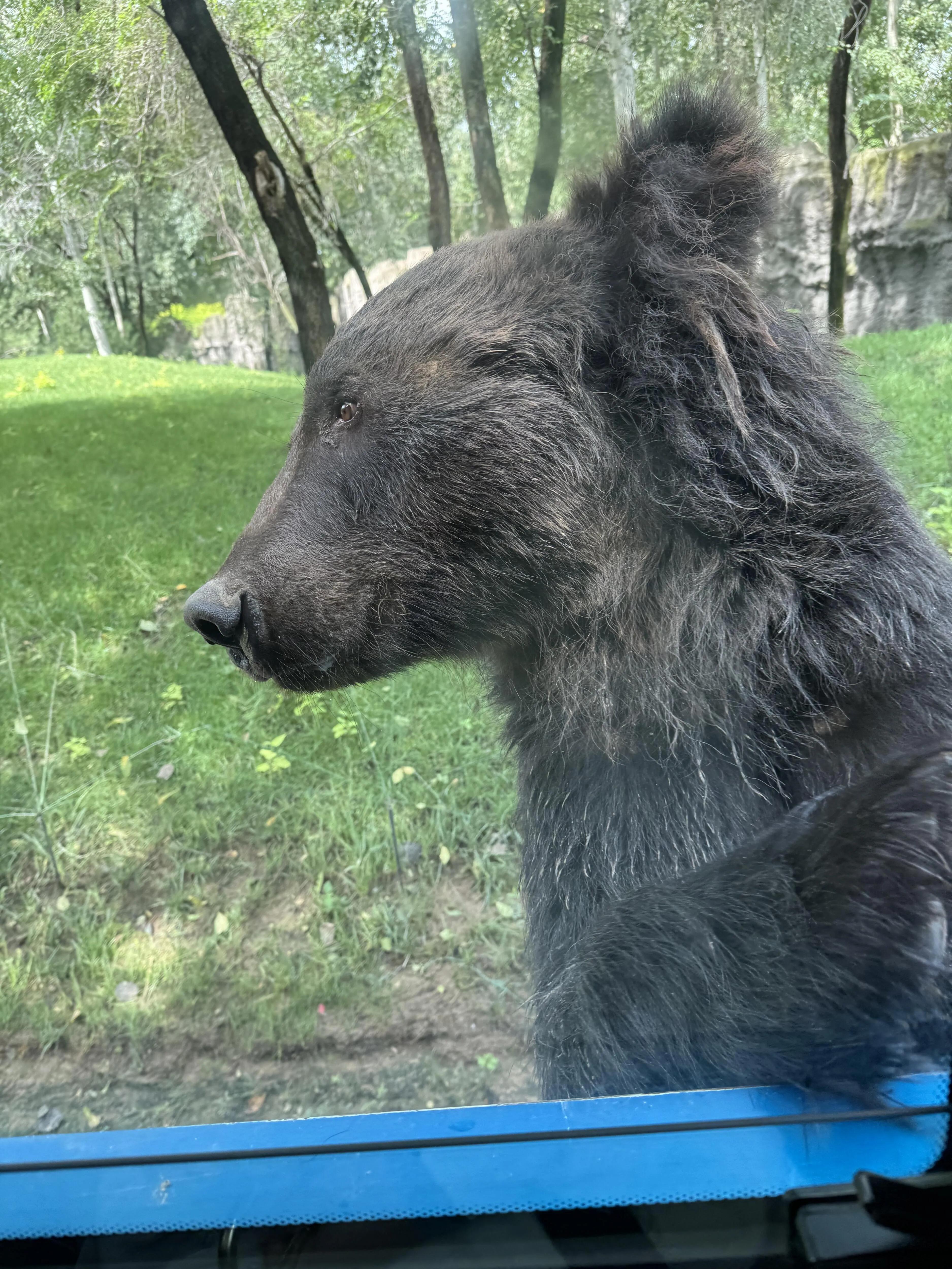 第一站是猛兽区。乘坐代步车到猛兽天地站下车,11点进入猛兽区。当时排队情况尚可,未购买优速通。进入后发现仍需排队约30分钟才能上车。车上两侧玻璃可向上打开,露出喂食孔,购买了肉食的游客可以通过这些孔给猛兽喂食。猛兽区游览顺序大致为棕熊、东北虎、白虎、狼、黑熊、鬣狗、狮子和猎豹。熊类会主动靠近车辆讨要食物,而猫科动物则通常在车边等待投喂。整个猛兽区游览时长约30分钟。