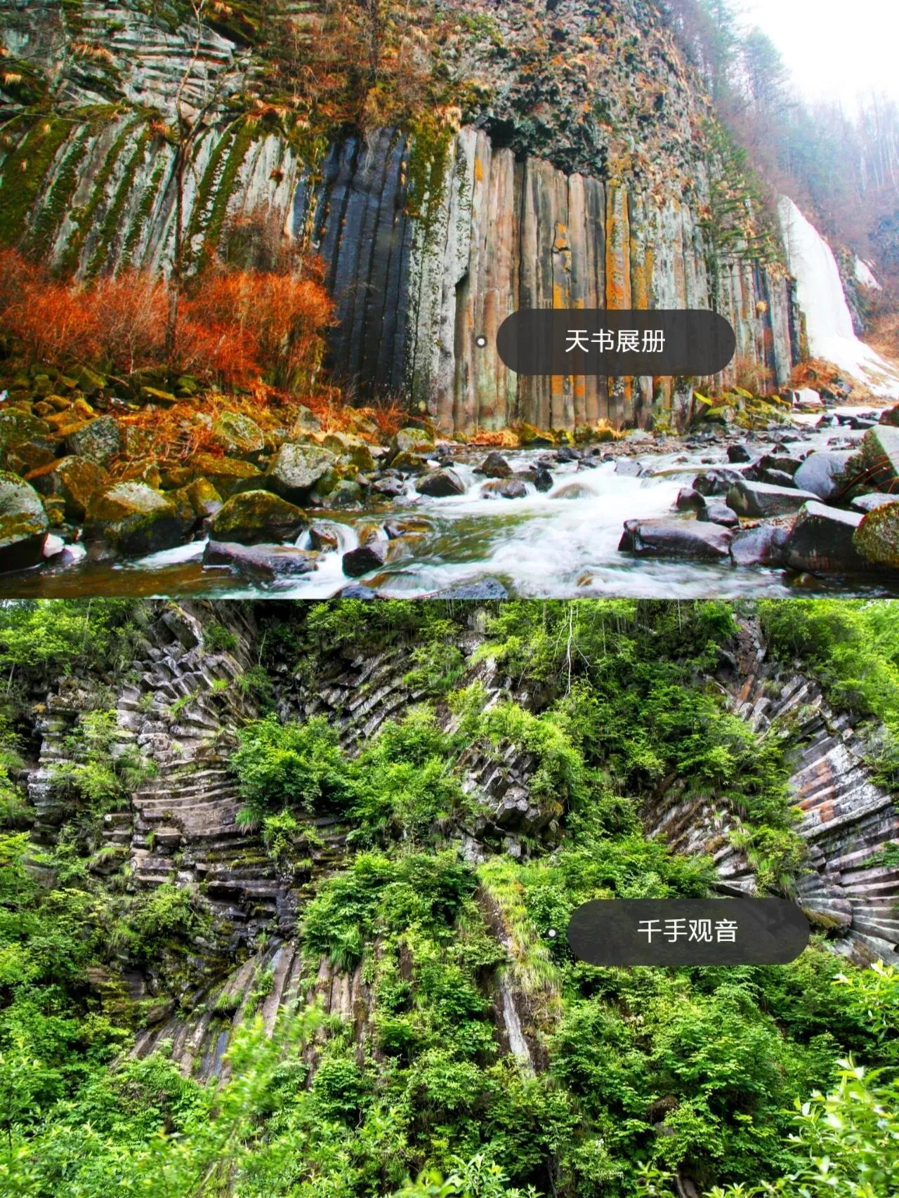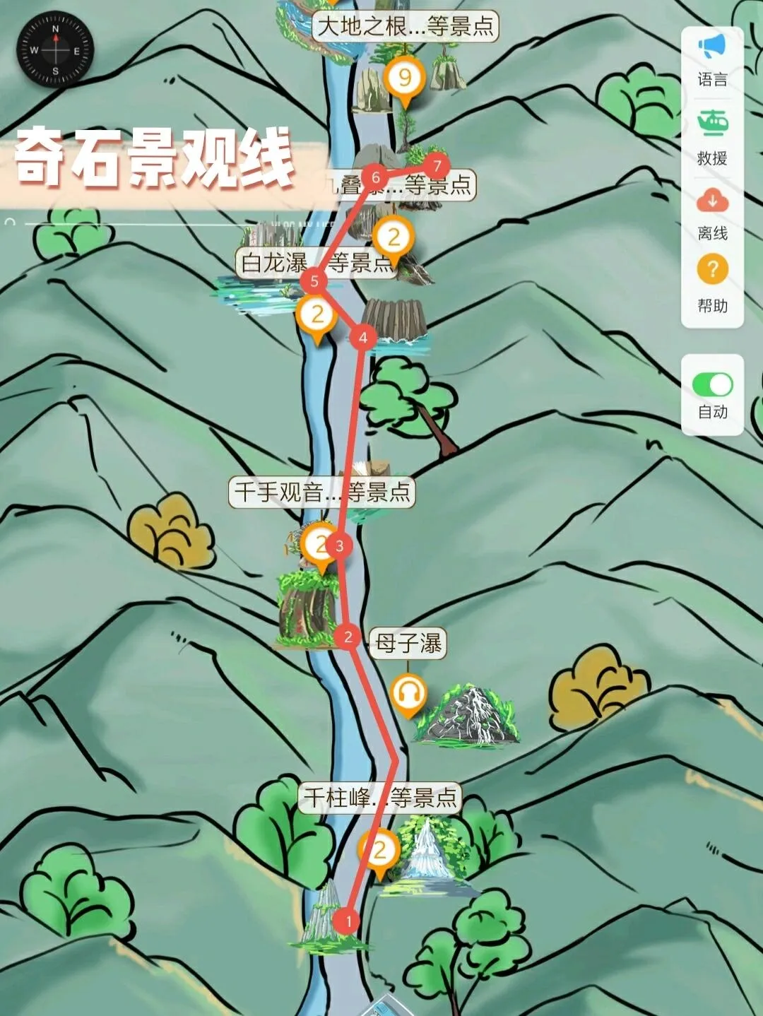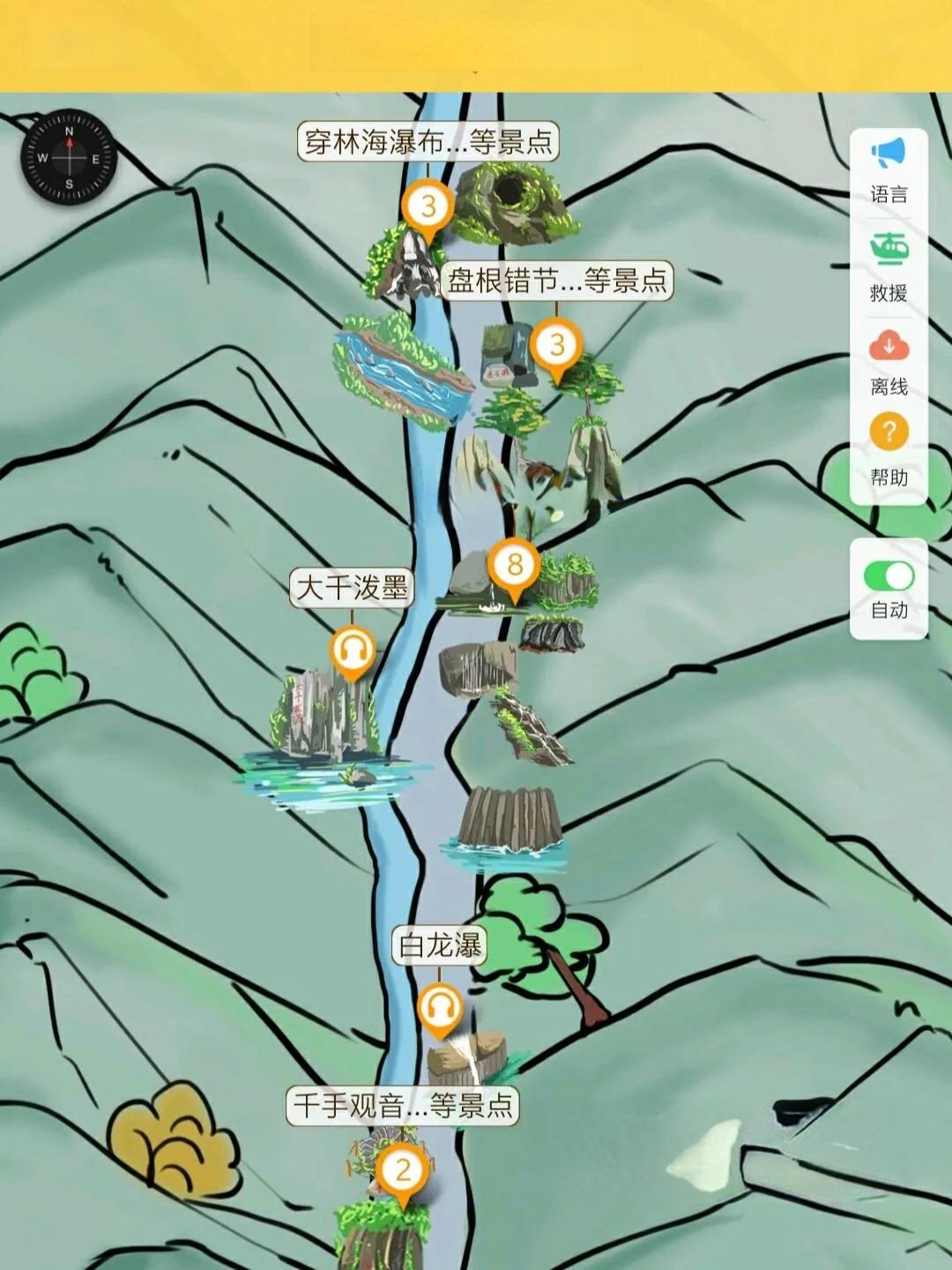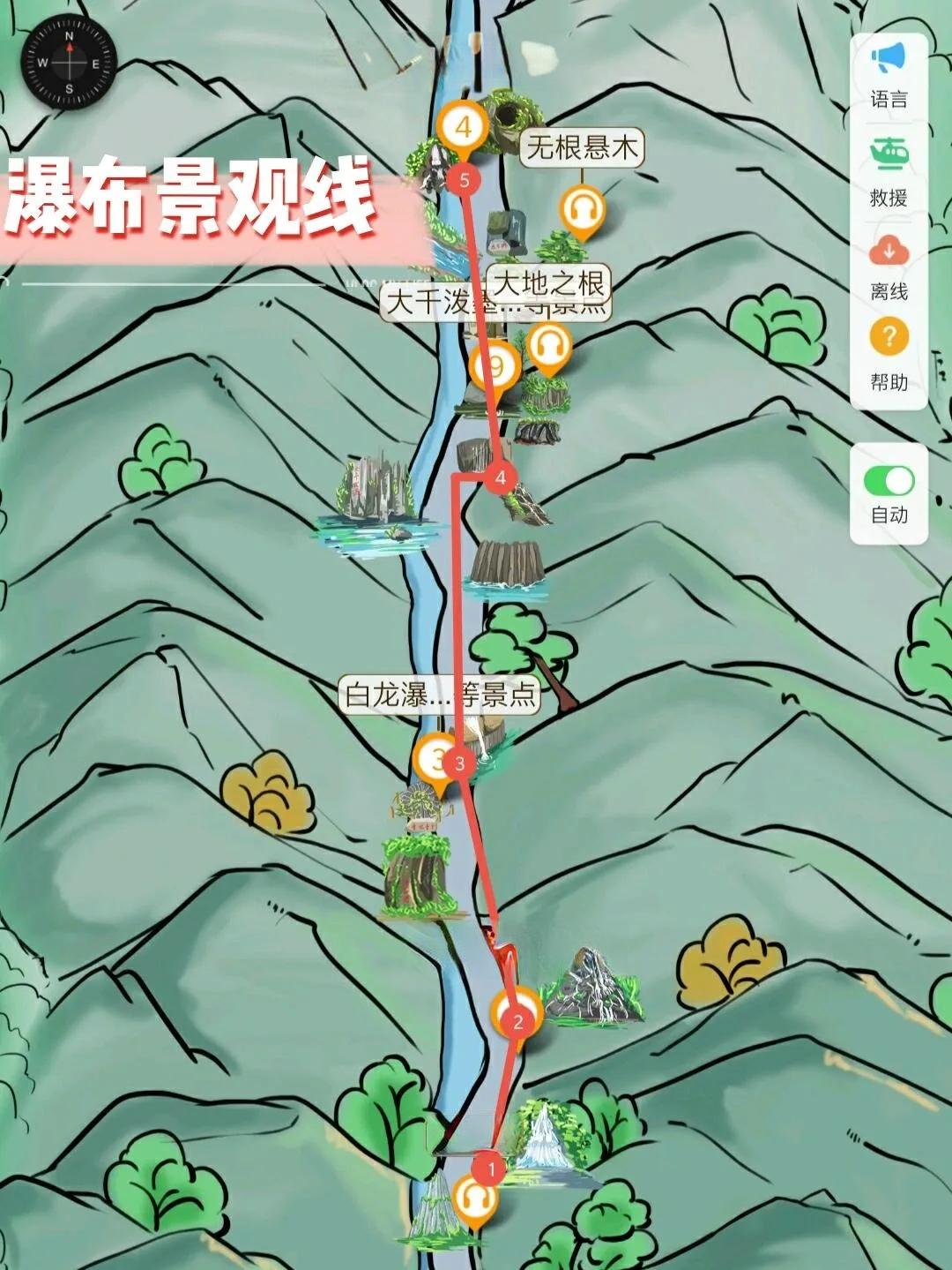 千柱峰-天河落地-母子瀑-天书展册-千手观音-白龙瀑-九叠瀑-大千泼墨-石转运来-悬石洞-龟蛇锁江-穿林海瀑