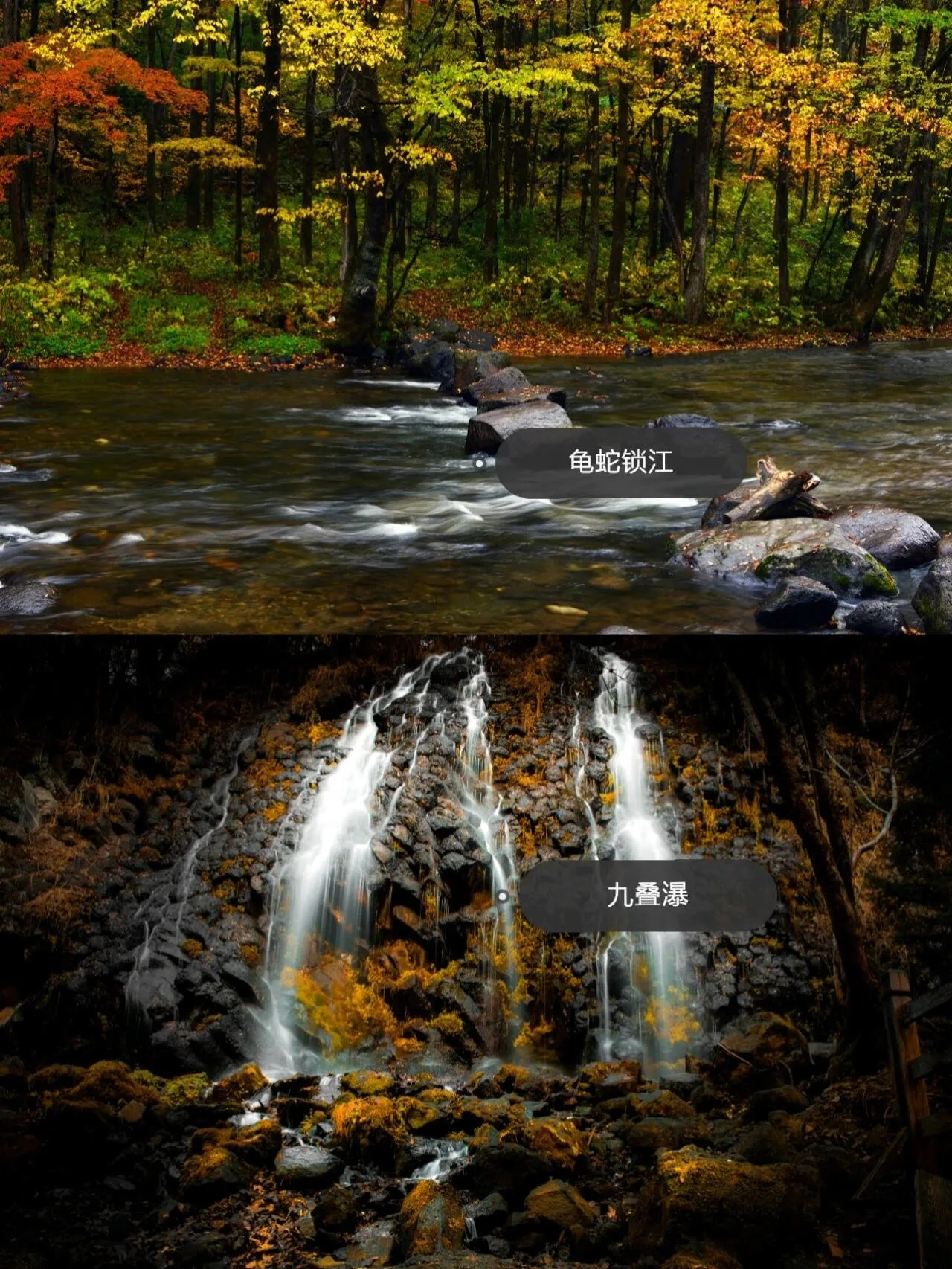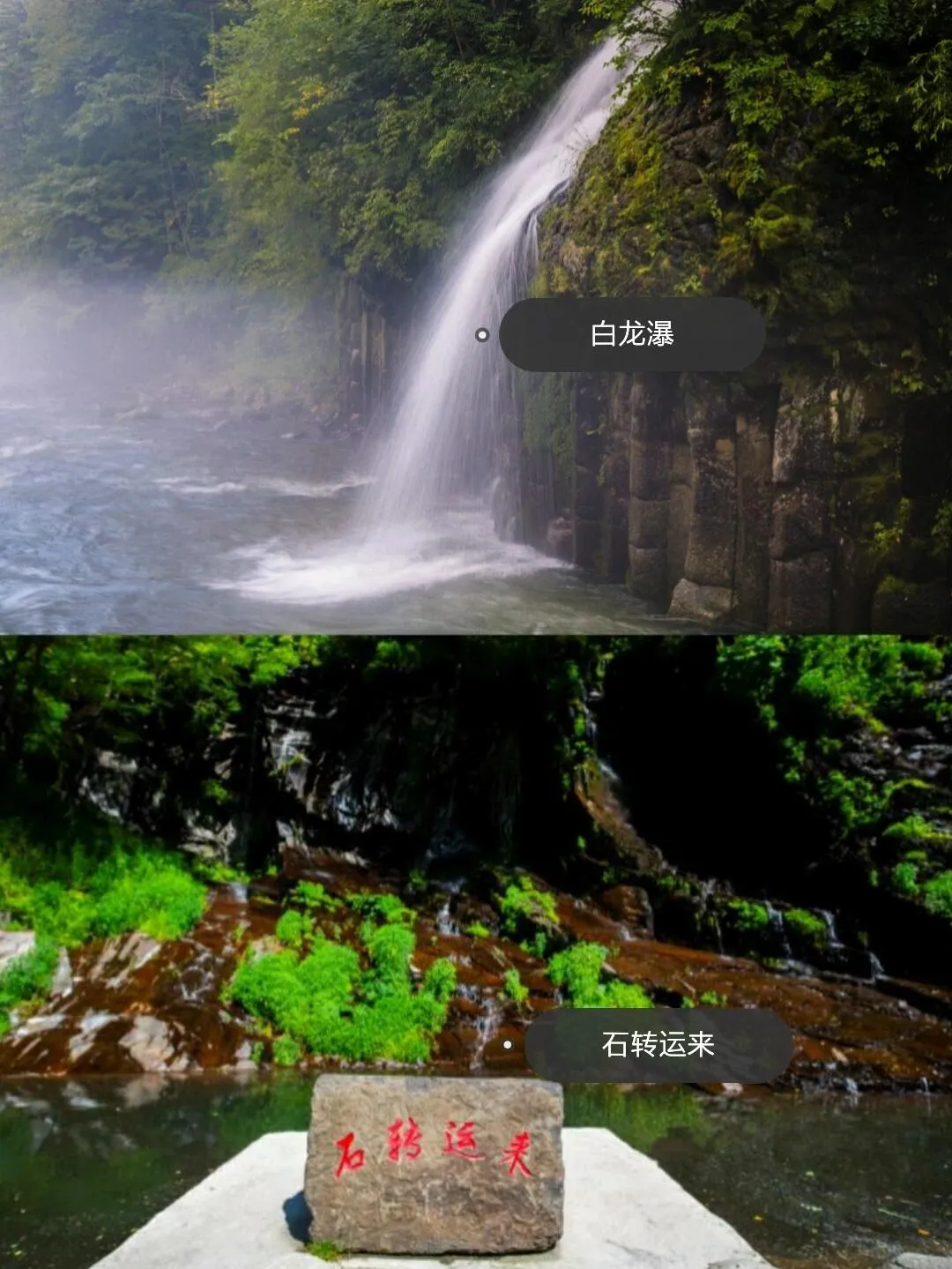 瀑布景观线:天河落地-母子瀑-白龙瀑-九叠瀑-穿林海瀑