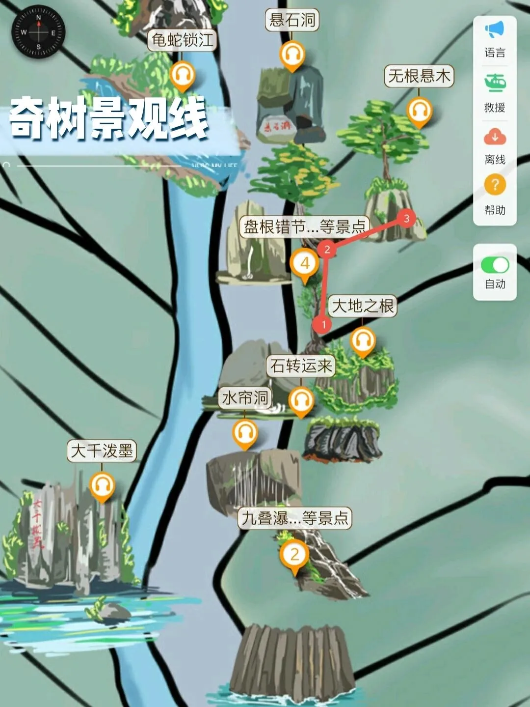 奇石景观线:千柱峰-天书展册-千手观音-万古岩-大千泼墨-石转运来-蟠龙爪