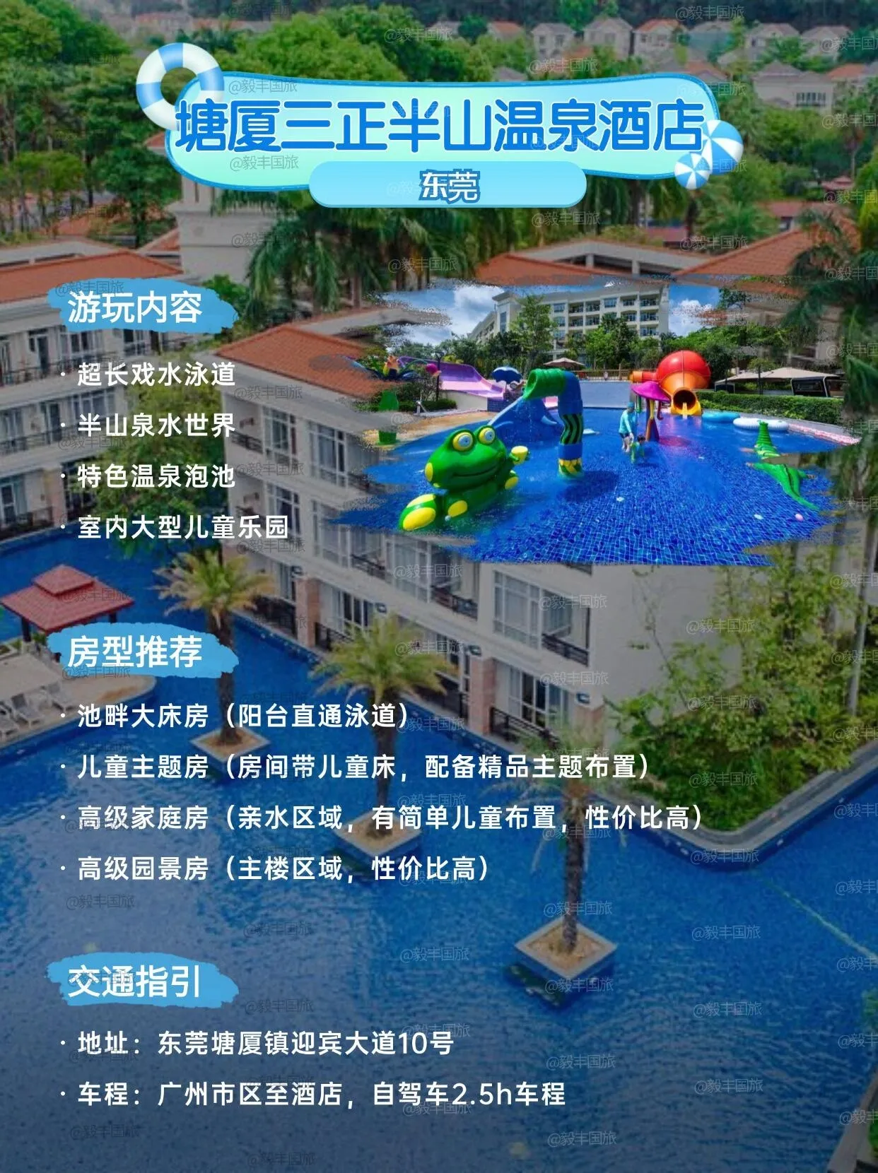 东莞的塘厦三正半山温泉酒店虽开业多年,但不断更新娱乐设施,游玩内容丰富。桥头三正半山酒店的泳道环绕酒店,非常适合夏季玩水。